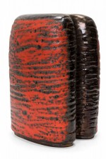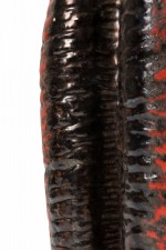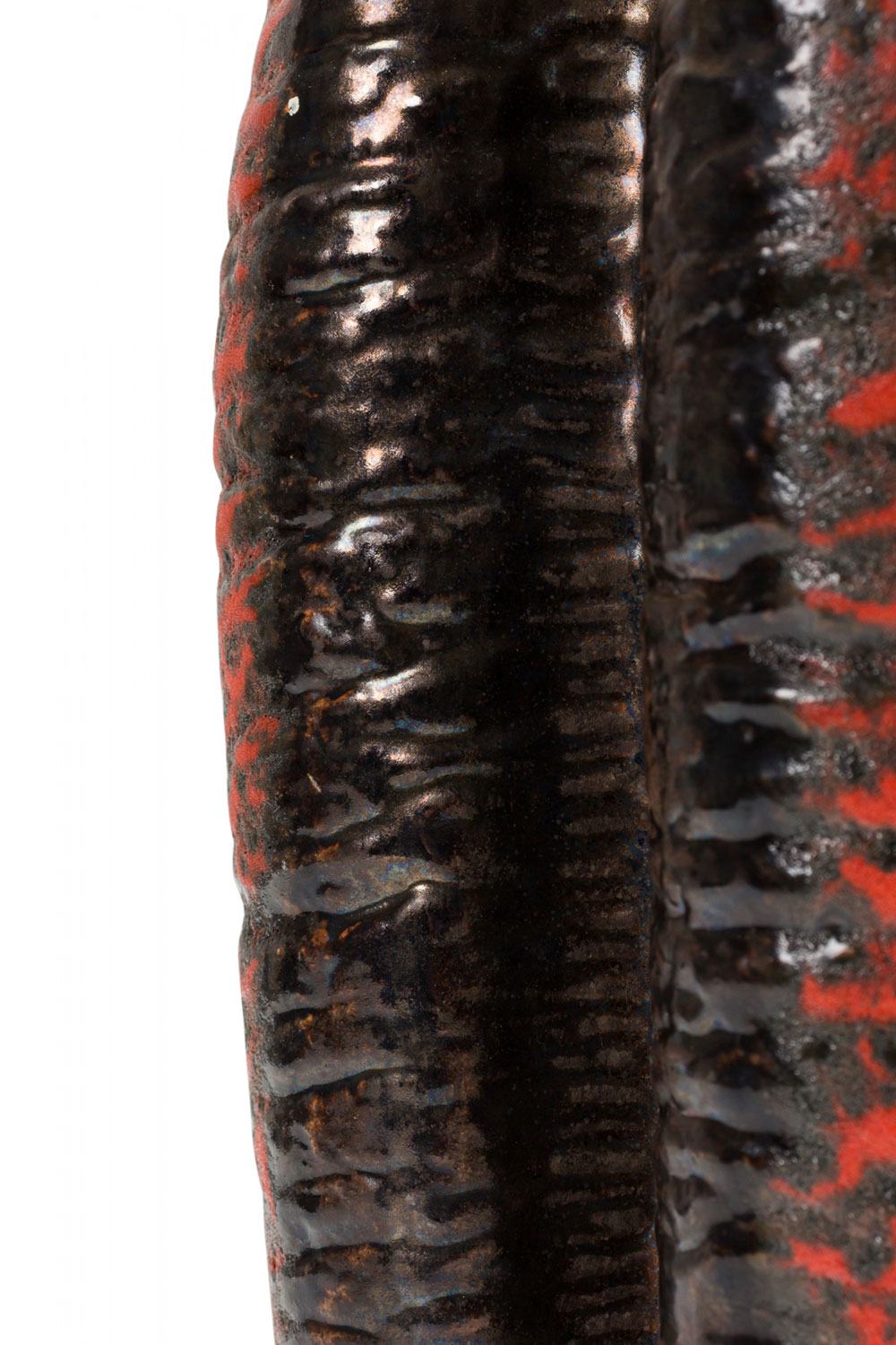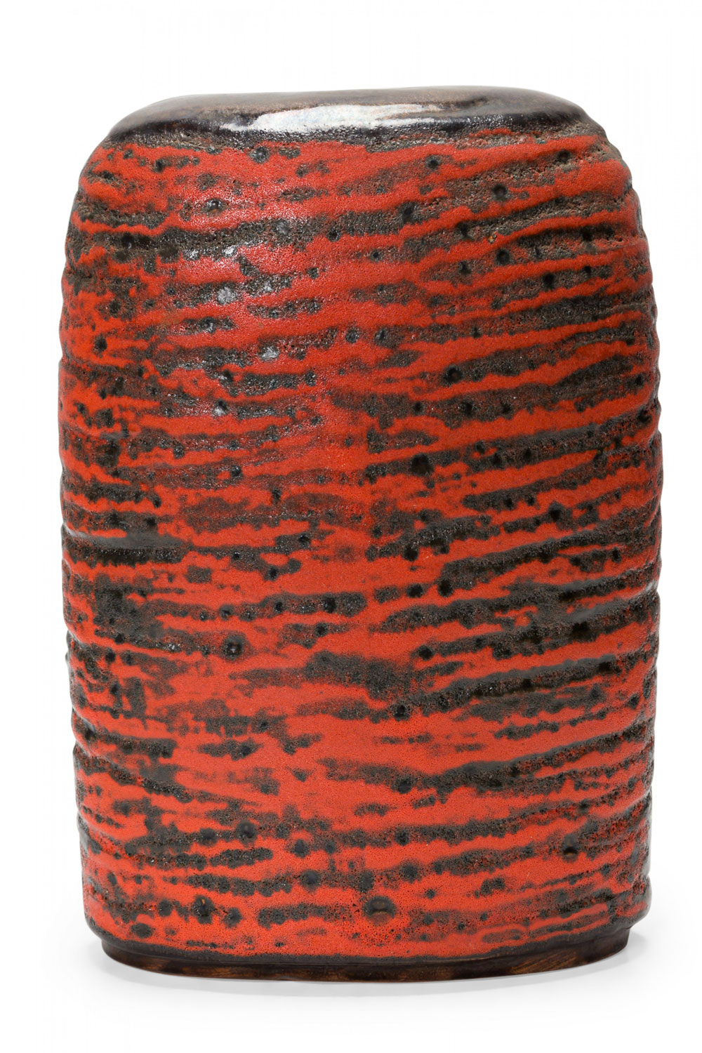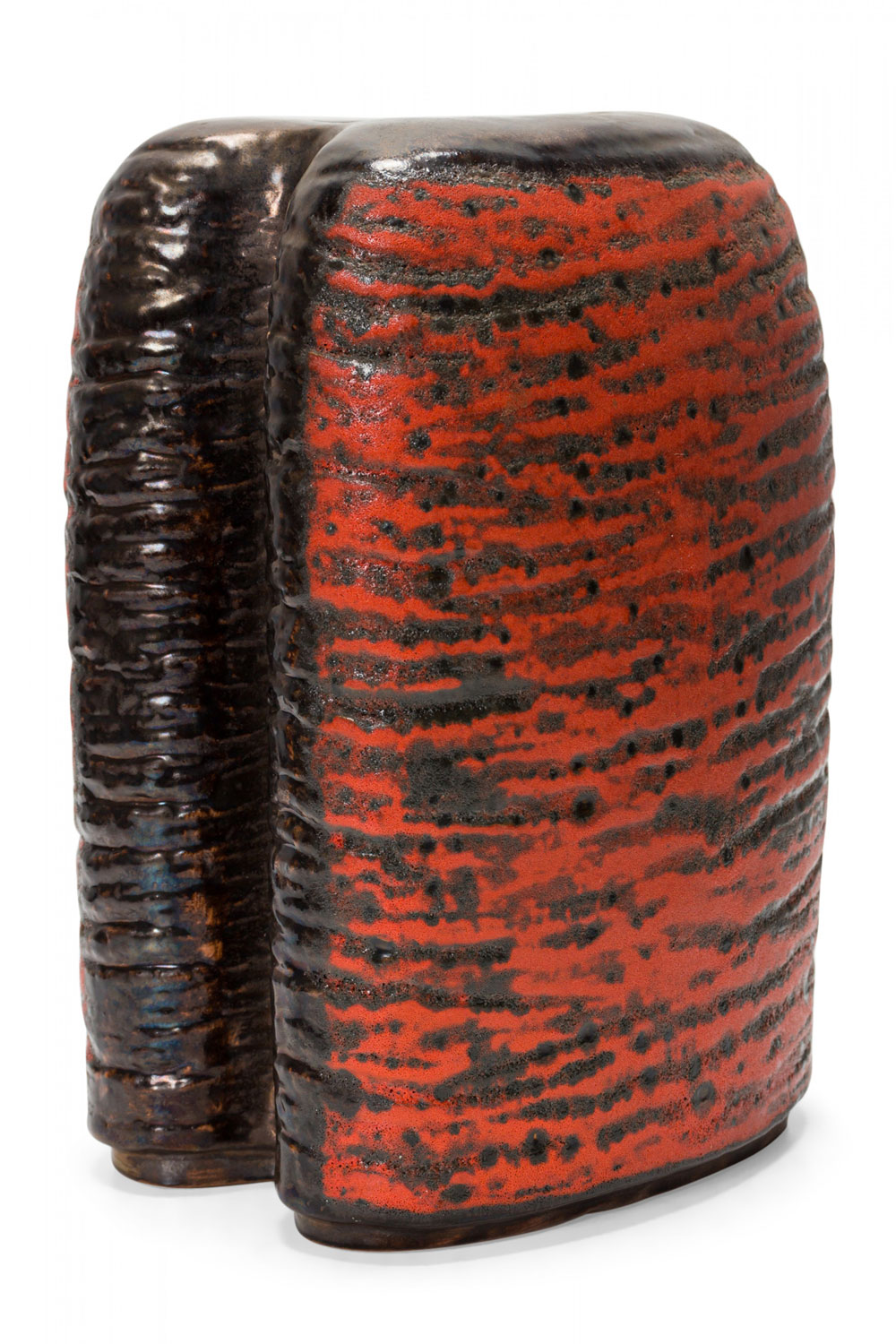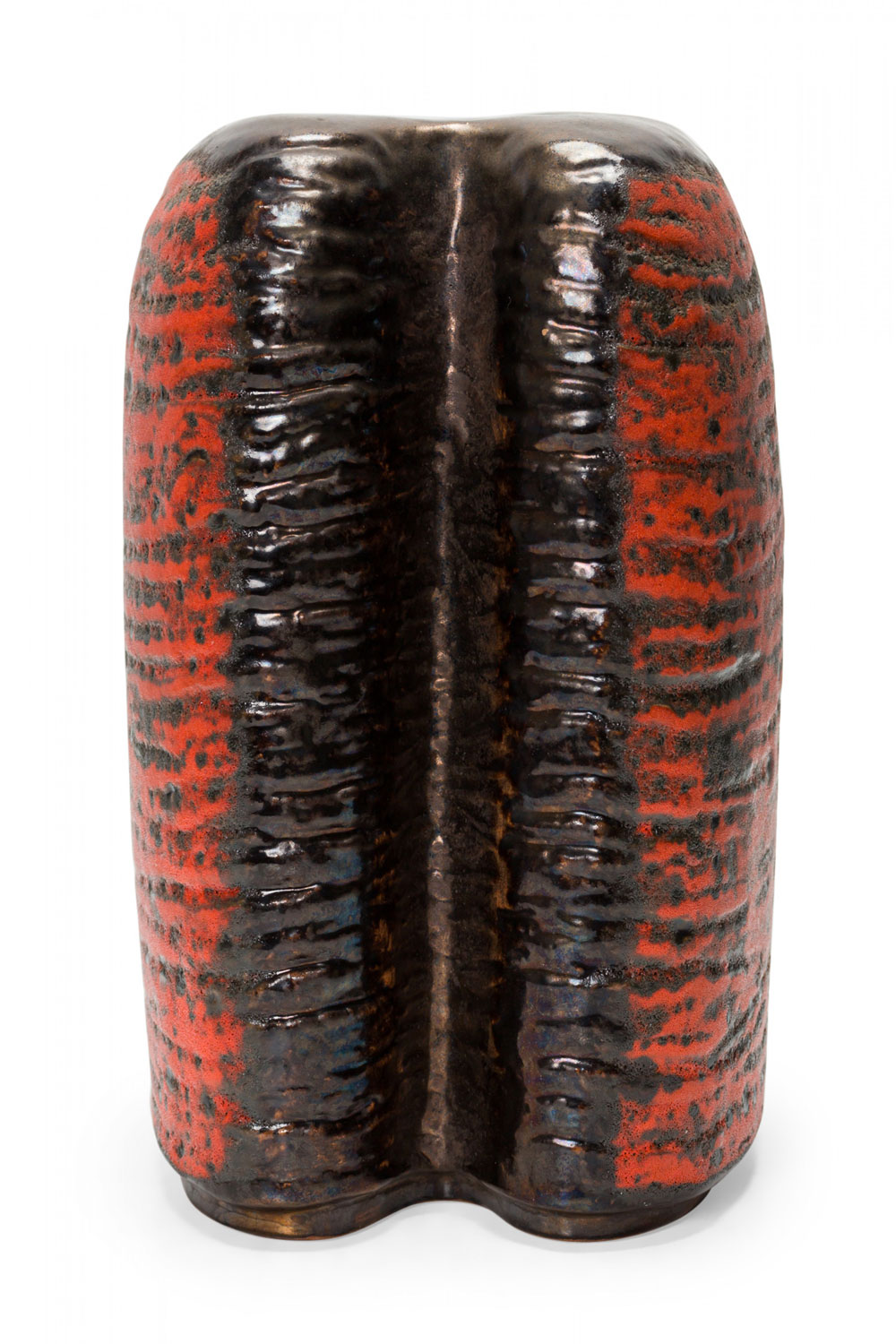 West German Mid-Century two-lobed form ceramic vasew with an abstract striped orange and black fat lava glaze. (mark on bottom for CARSTENS OF TÖNNIESHOF, W. GERMANY 0563-23)