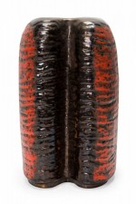 West German Mid-Century two-lobed form ceramic vasew with an abstract striped orange and black fat lava glaze. (mark on bottom for CARSTENS OF TÖNNIESHOF, W. GERMANY 0563-23).