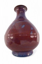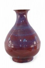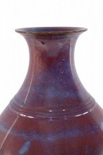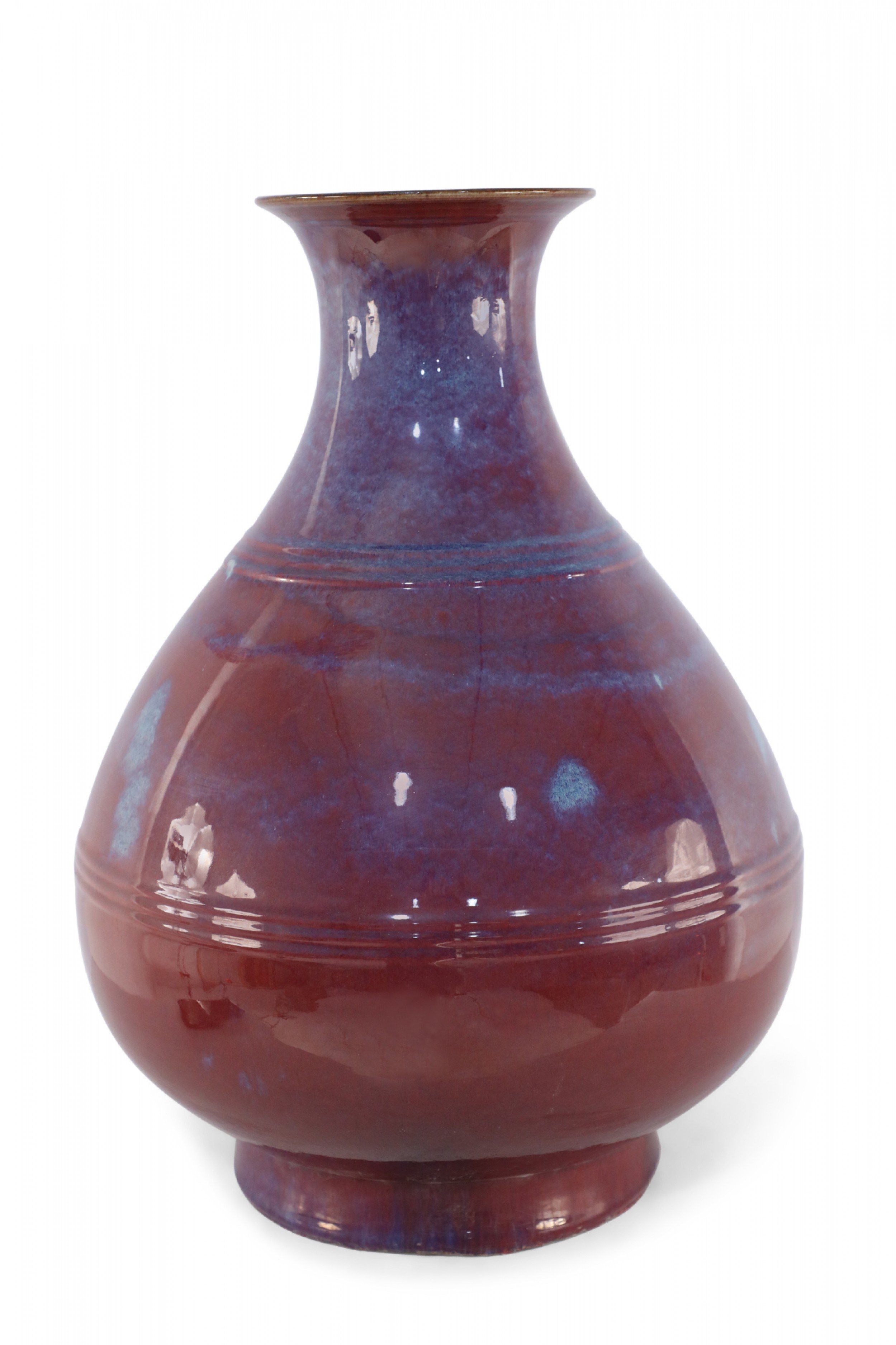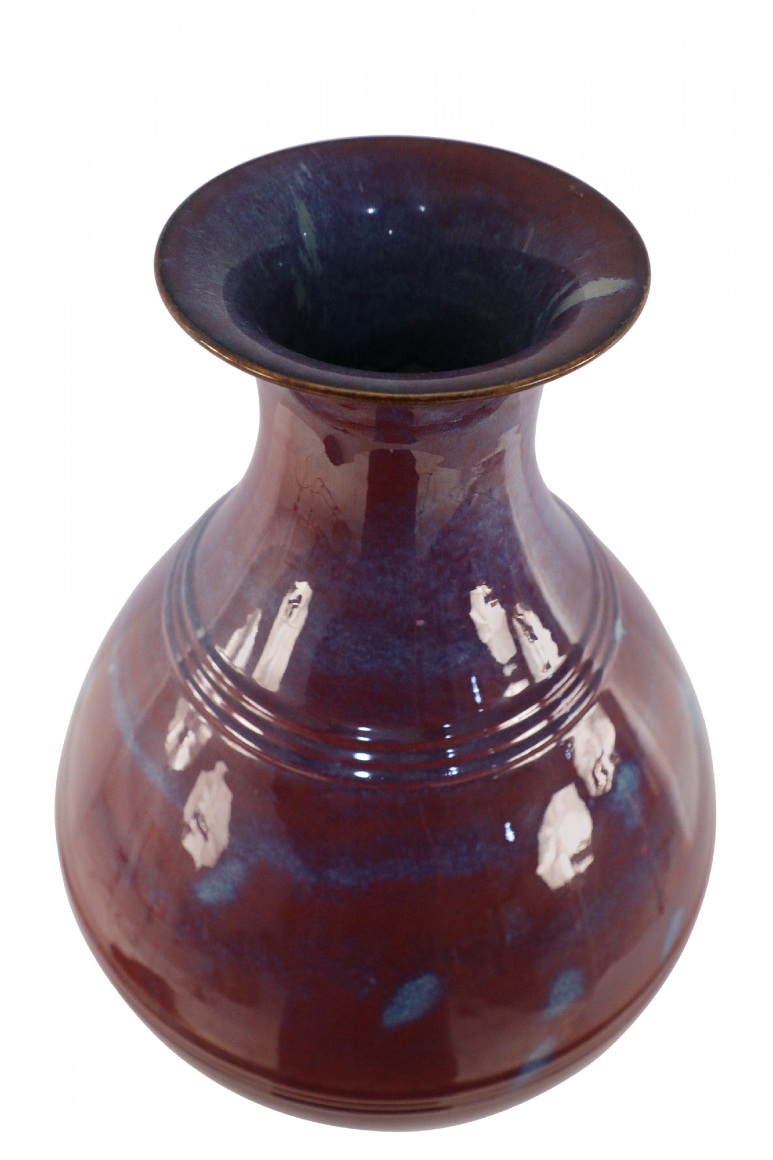 Chinese bulbous vase made with a glaze that transforms after being fired in the kiln, resulting in traces of blue showing through the main aubergine/purple color..