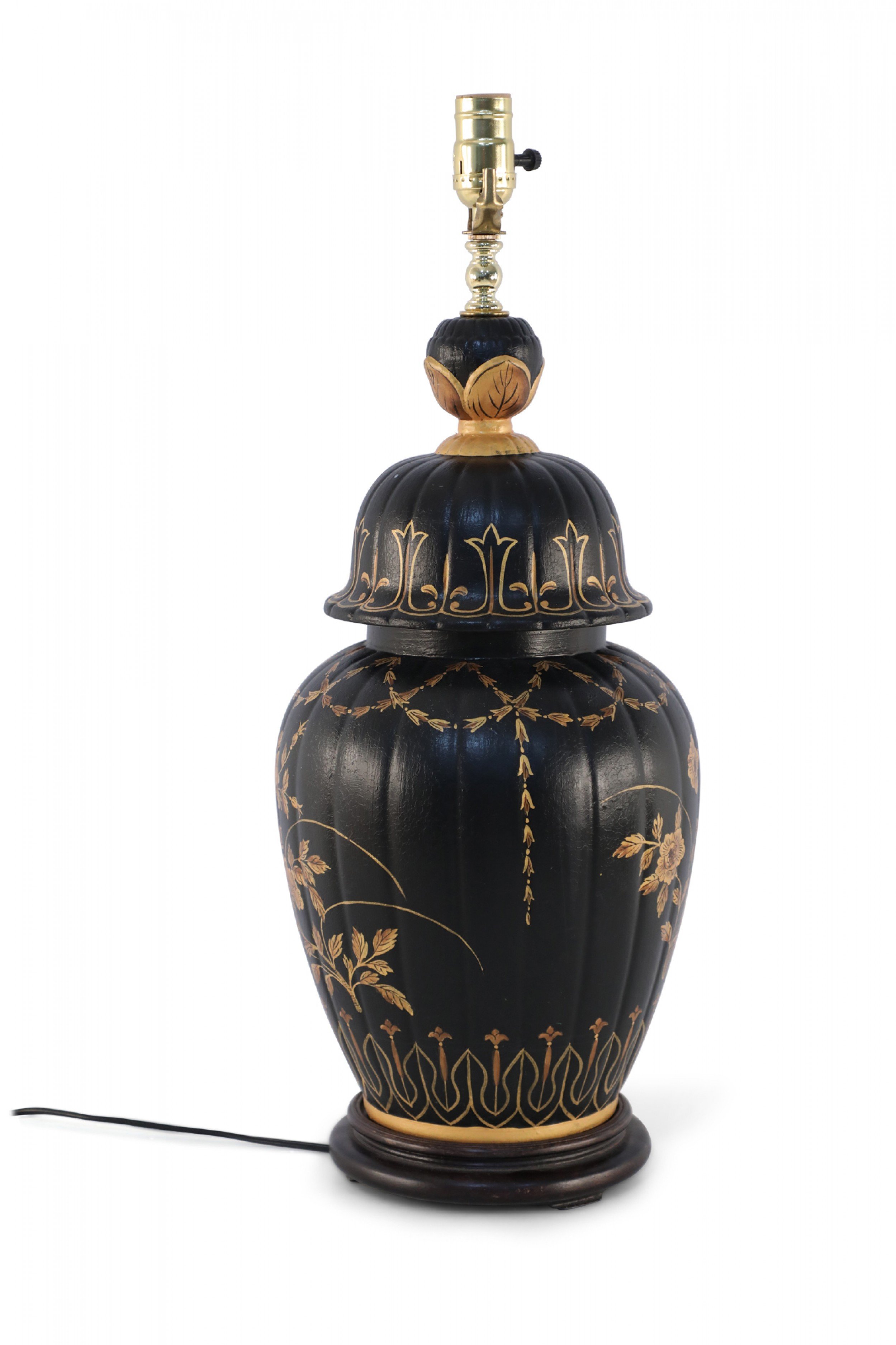 Chinese black porcelain table lamp made from a lidded urn decorated in gold florals, swag foliage, and geometric patterns sitting atop a wooden base fitted with brass hardware.