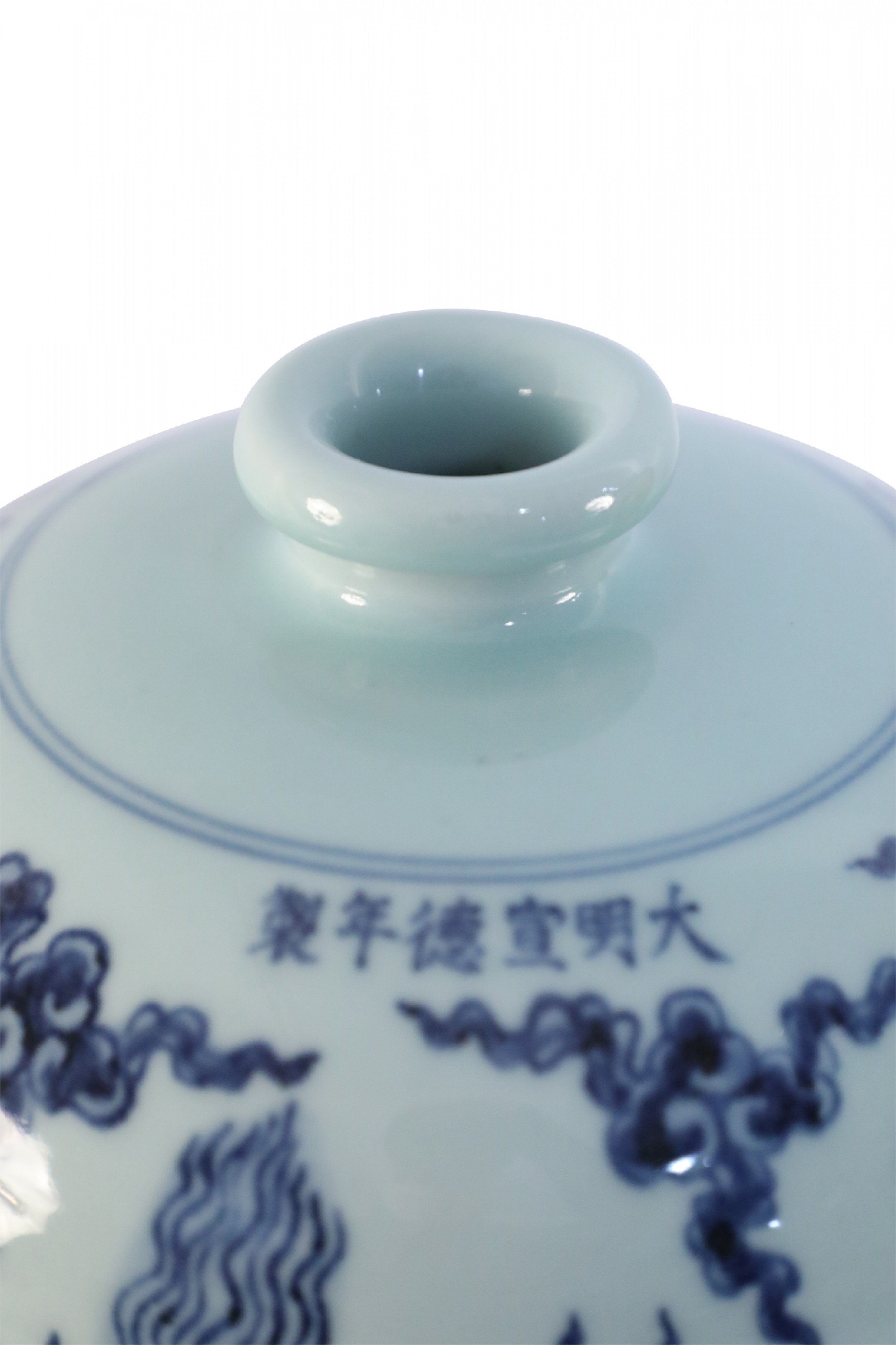 Antique Chinese white porcelain Meiping vase decorated in a swirling blue dragon motif..