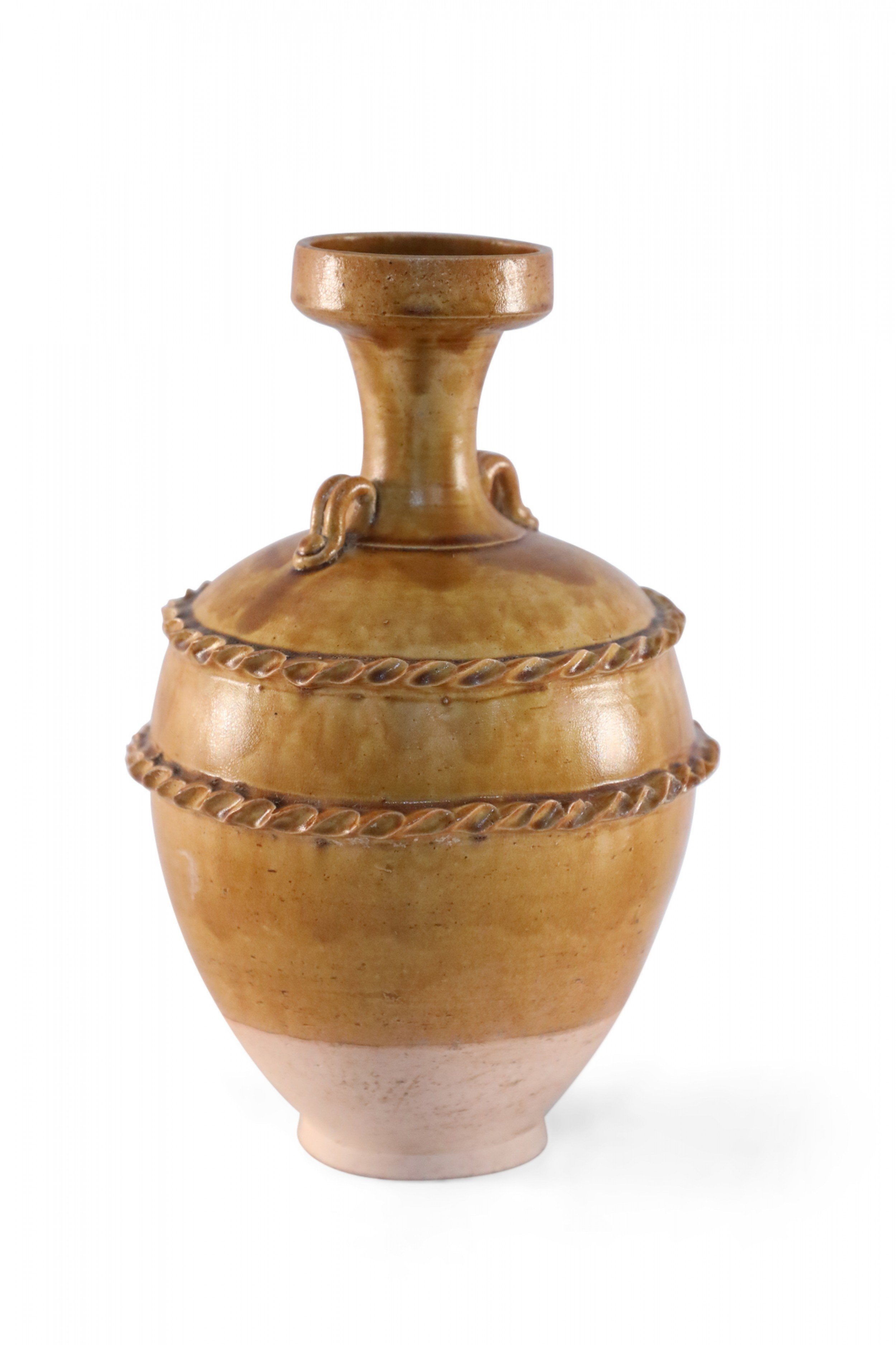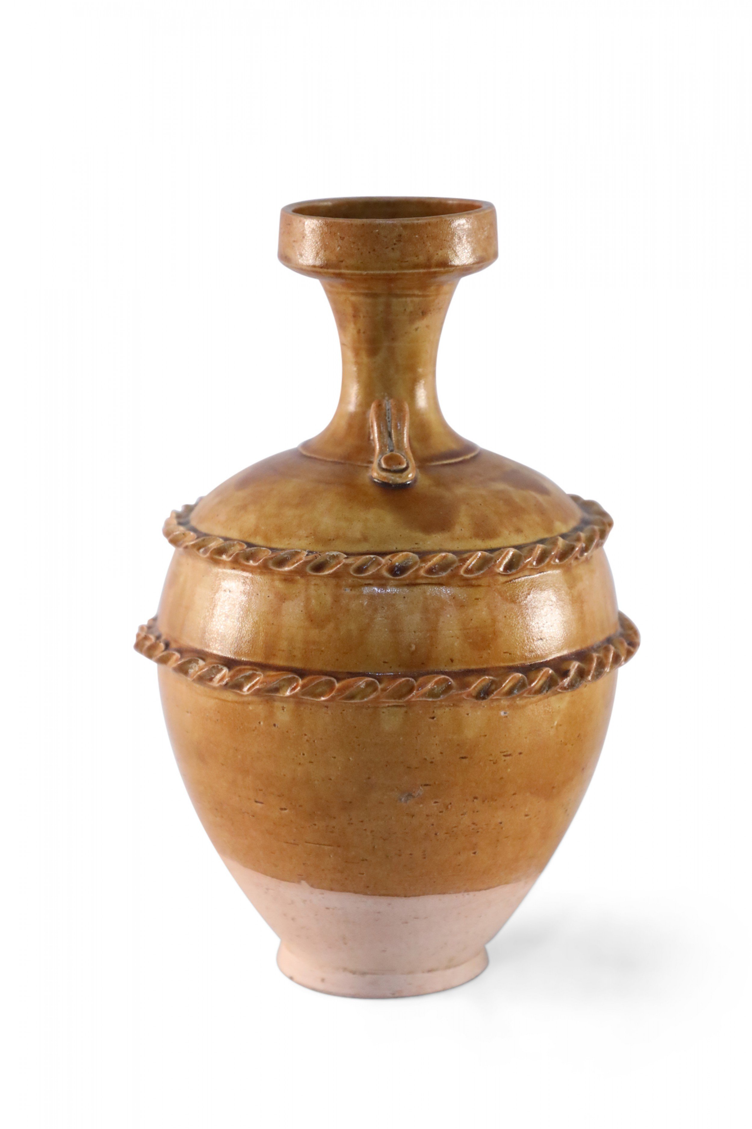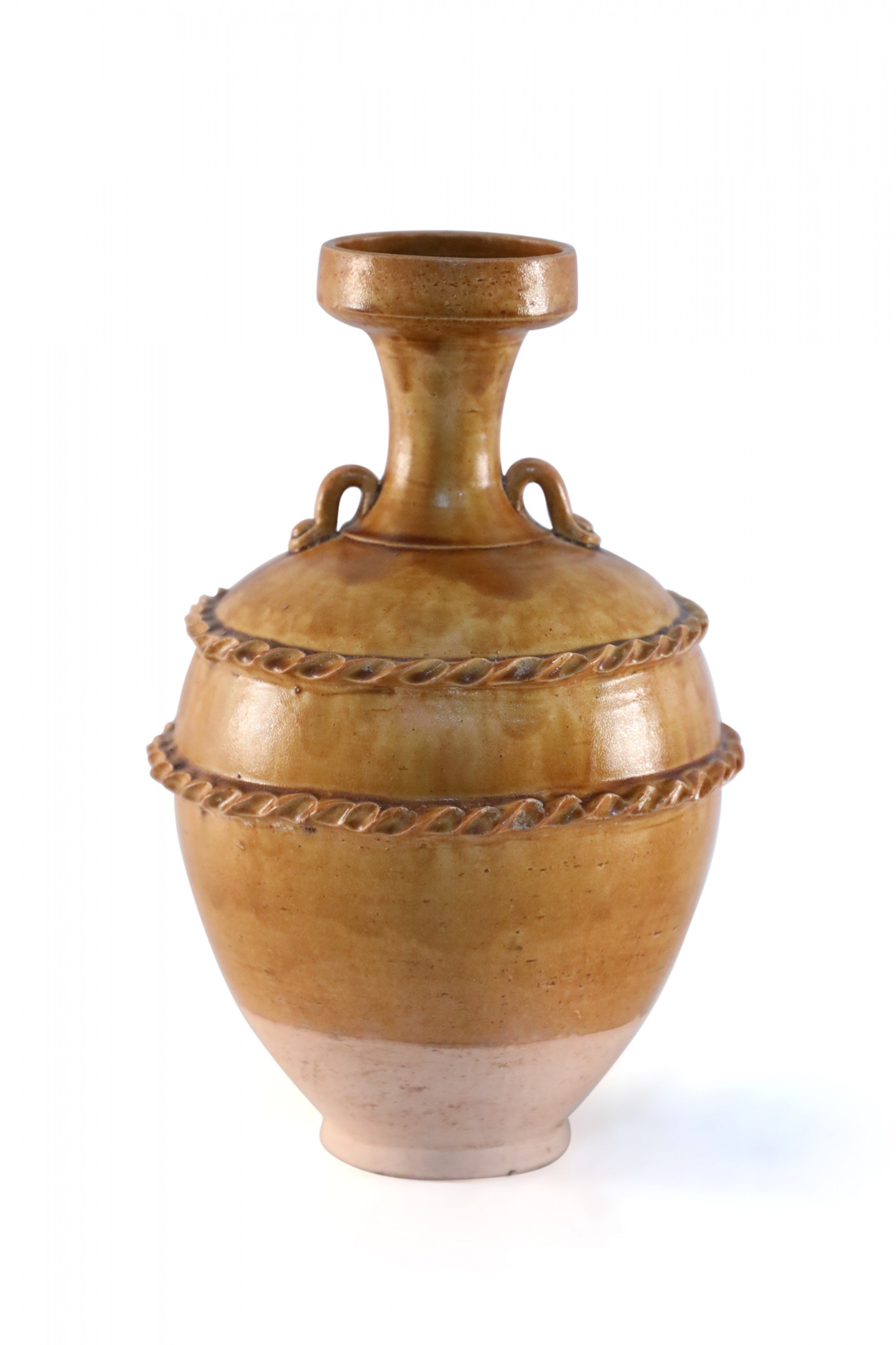 Antique Chinese handled vase with a pale pink base and a burnished tan body showing highs and lows in the finish, wrapped in two ribboned rope-like bands.