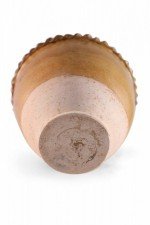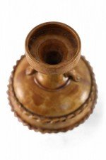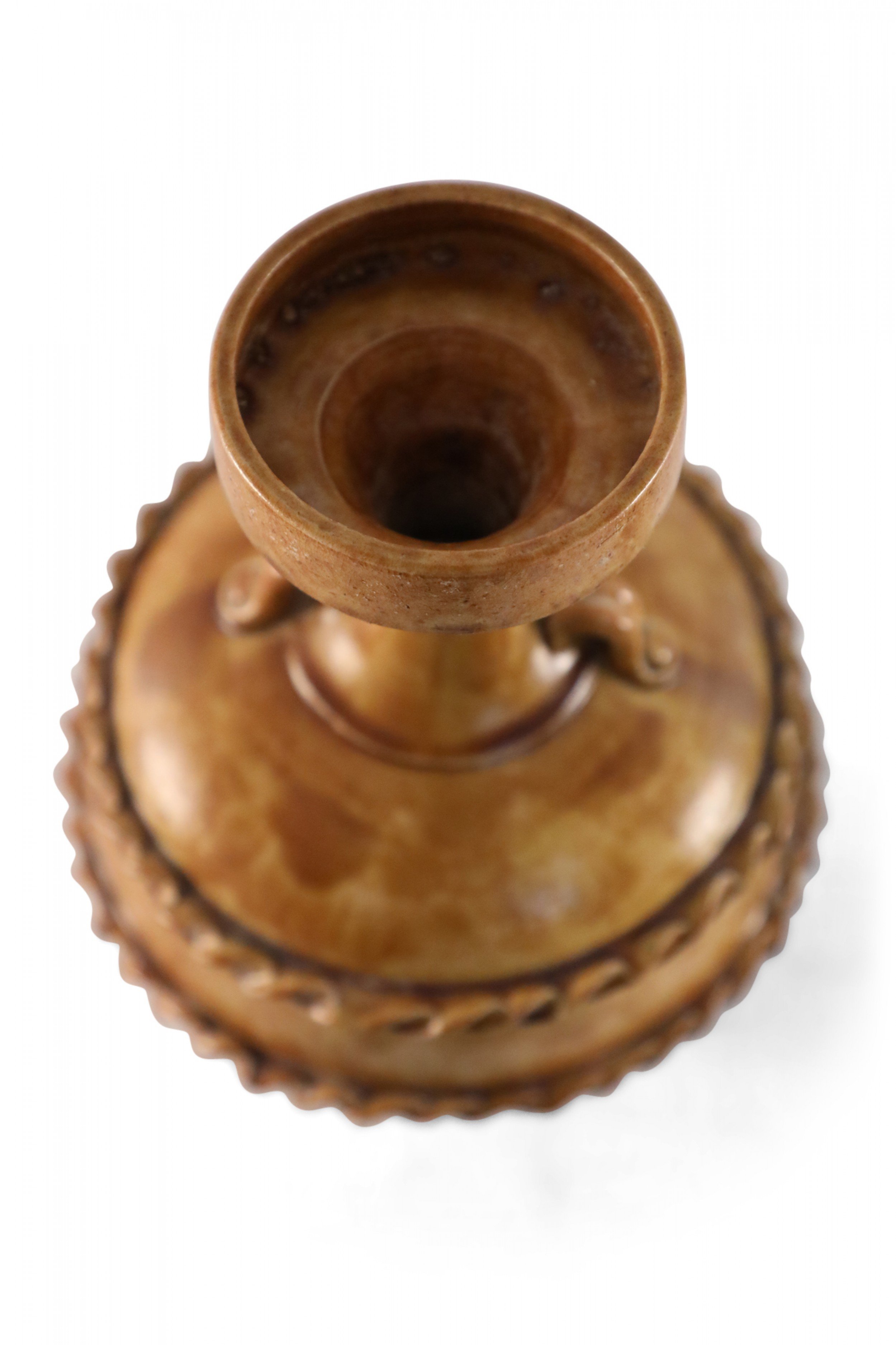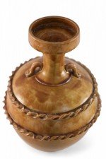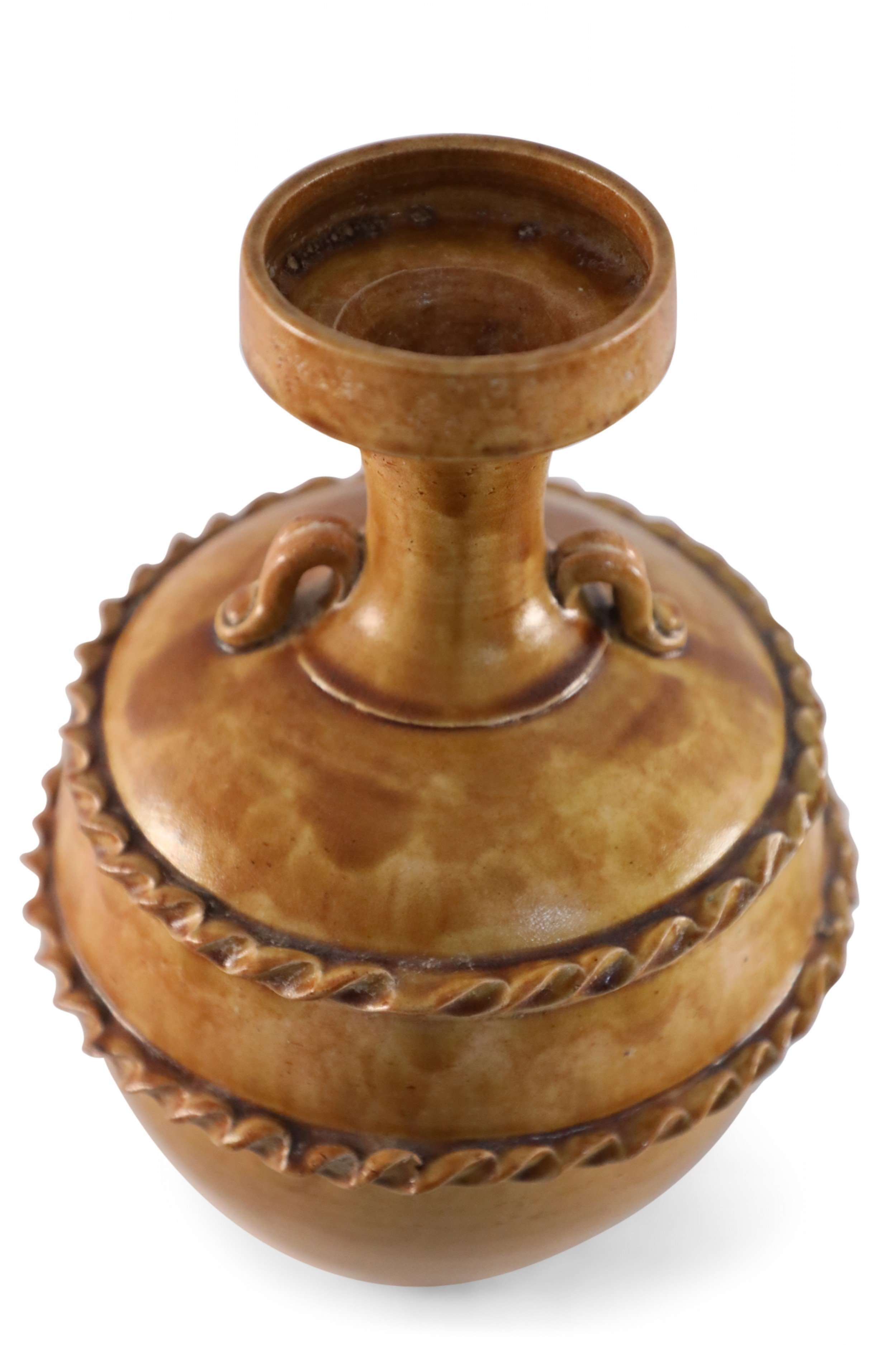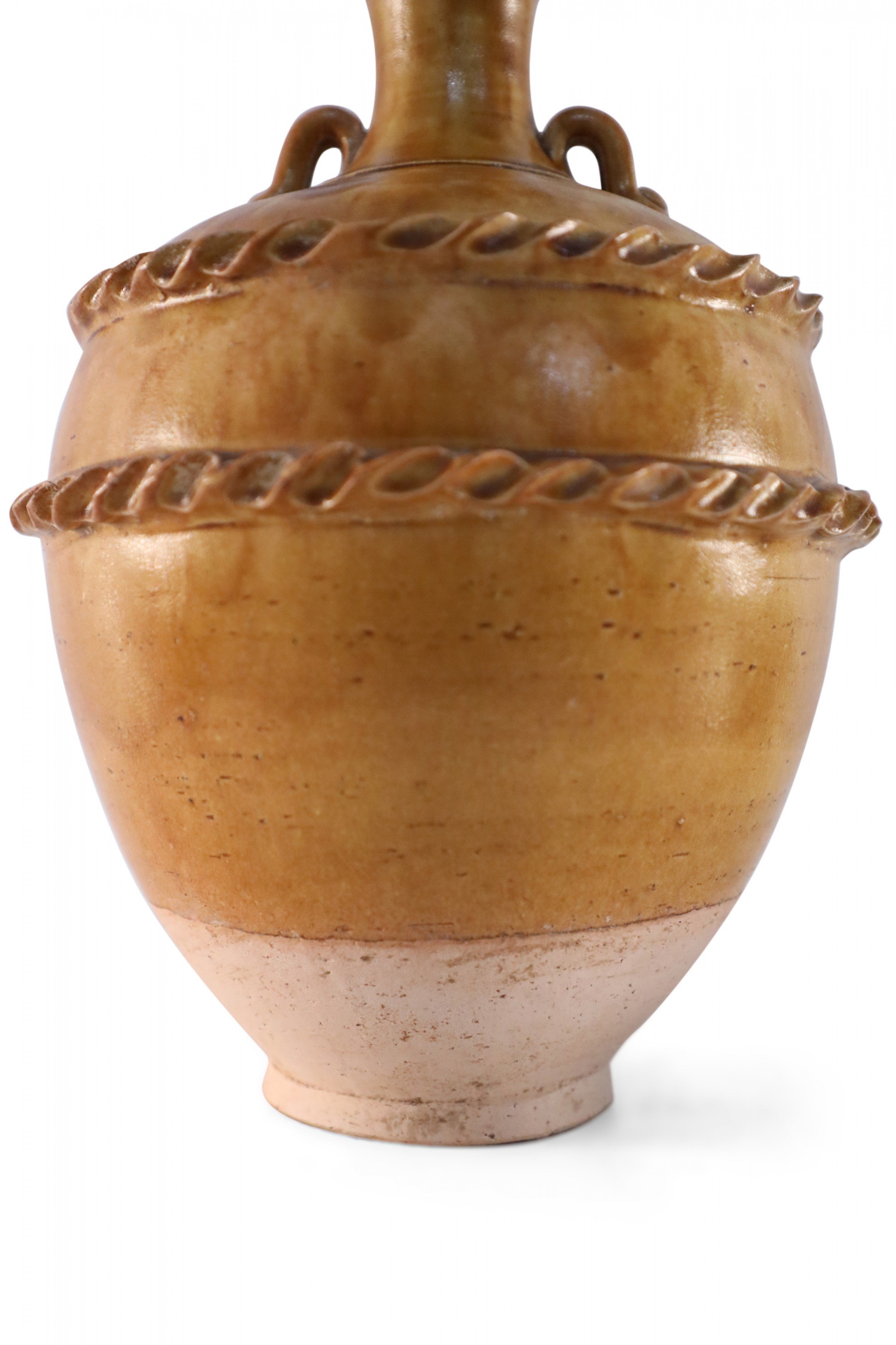 Antique Chinese handled vase with a pale pink base and a burnished tan body showing highs and lows in the finish, wrapped in two ribboned rope-like bands.