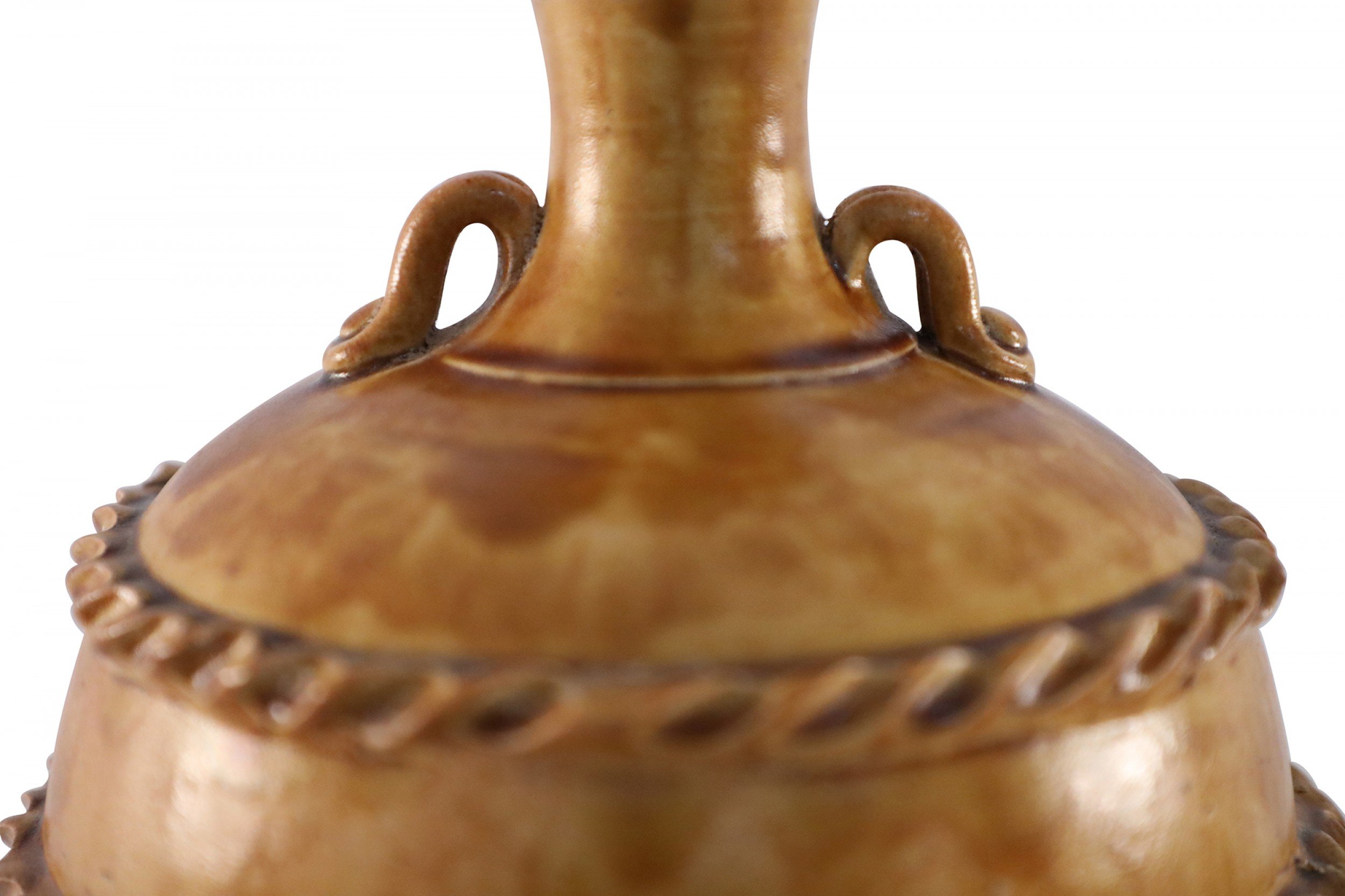 Antique Chinese handled vase with a pale pink base and a burnished tan body showing highs and lows in the finish, wrapped in two ribboned rope-like bands..