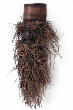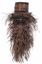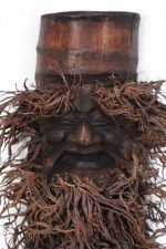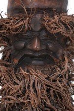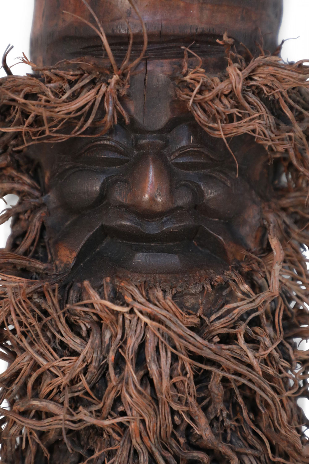 Chinese wall plaque made from a bamboo root carved in the shape of a smiling face with a bamboo root fiber beard. (Companion pieces: NWL2543A-G)