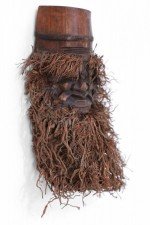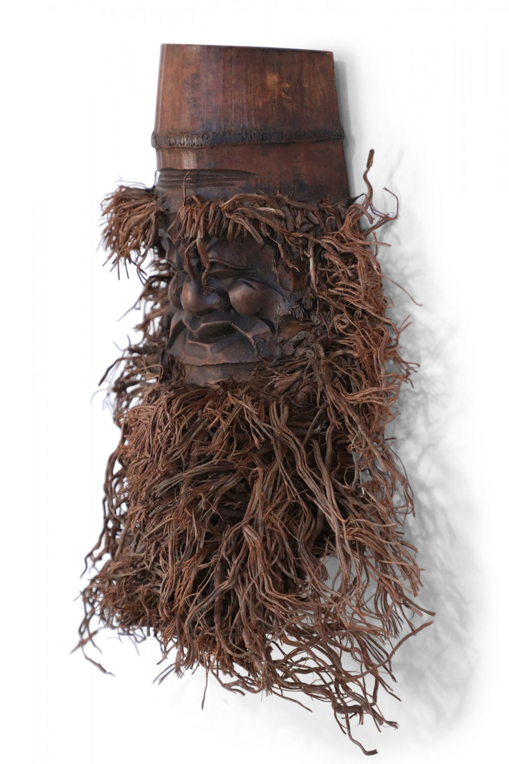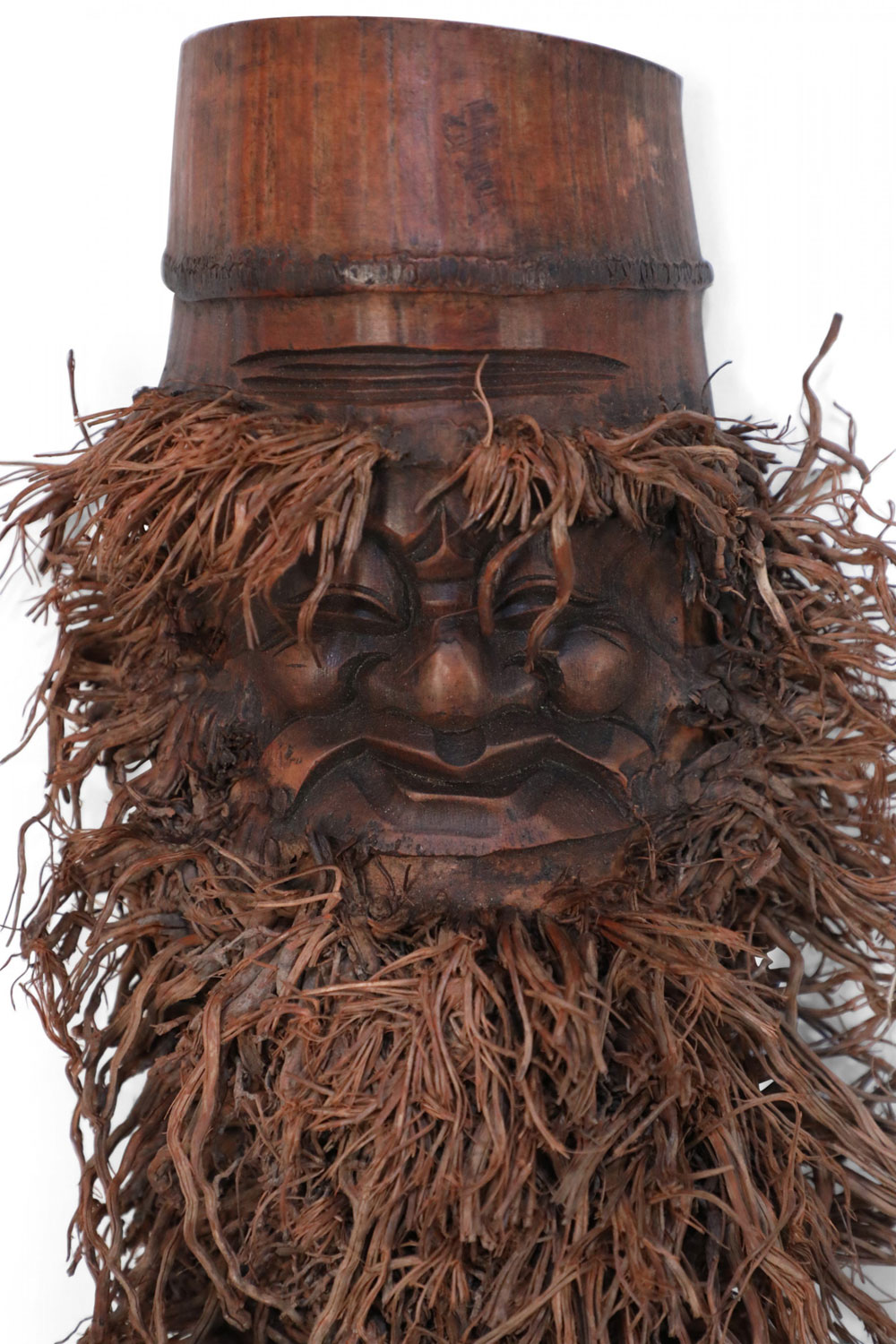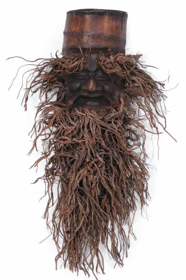 Chinese wall plaque made from a bamboo root carved in the shape of a smiling face with a bamboo root fiber beard. (Companion pieces: NWL2543A-G)
