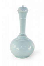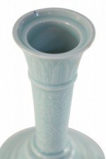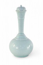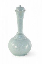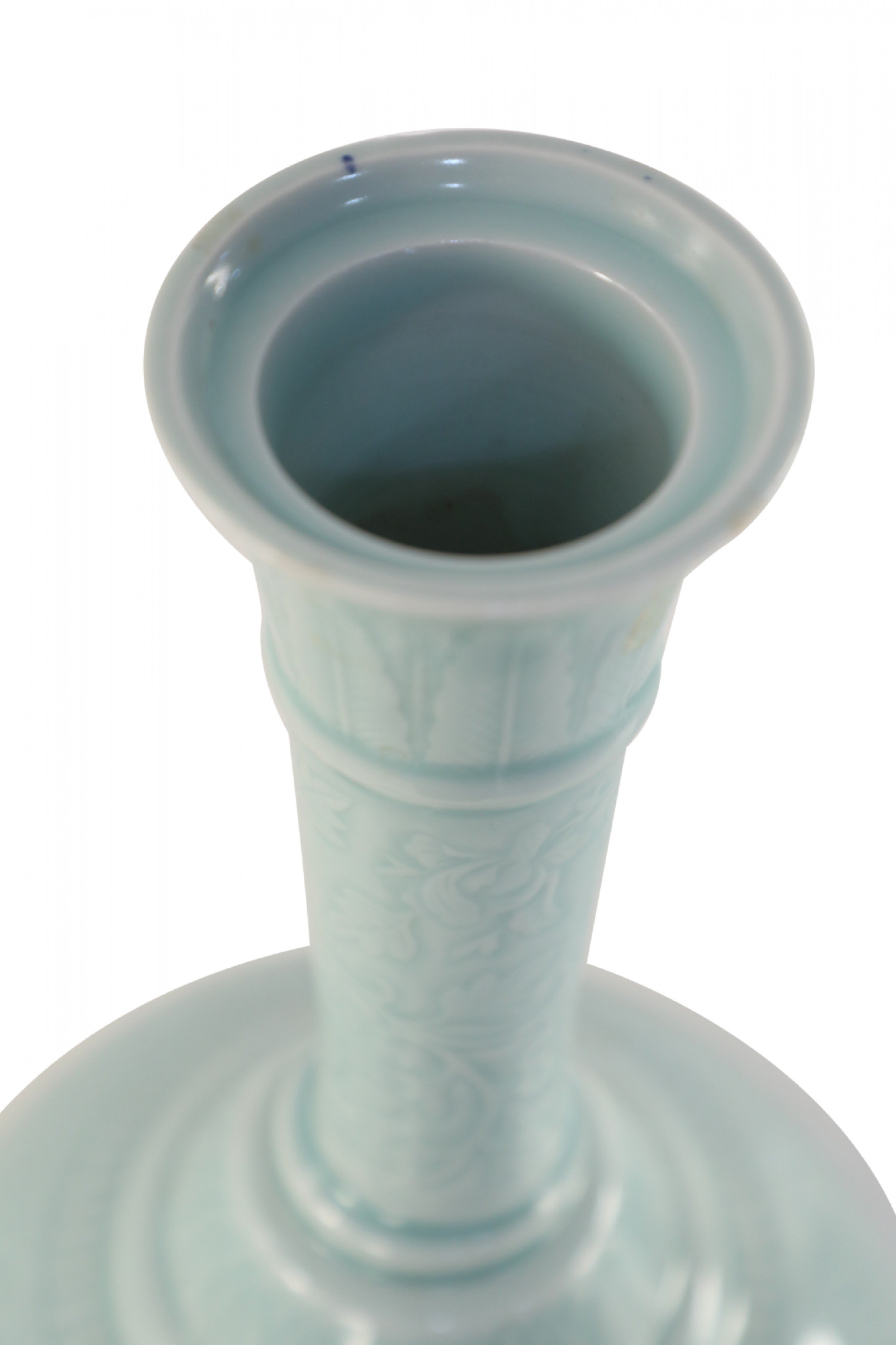 Chinese celadon ceramic vase with a gourd-shaped form wrapped in a tonal vine pattern and fitted with a ball finial-topped lid. (Similar vase in blue: NWL2041)