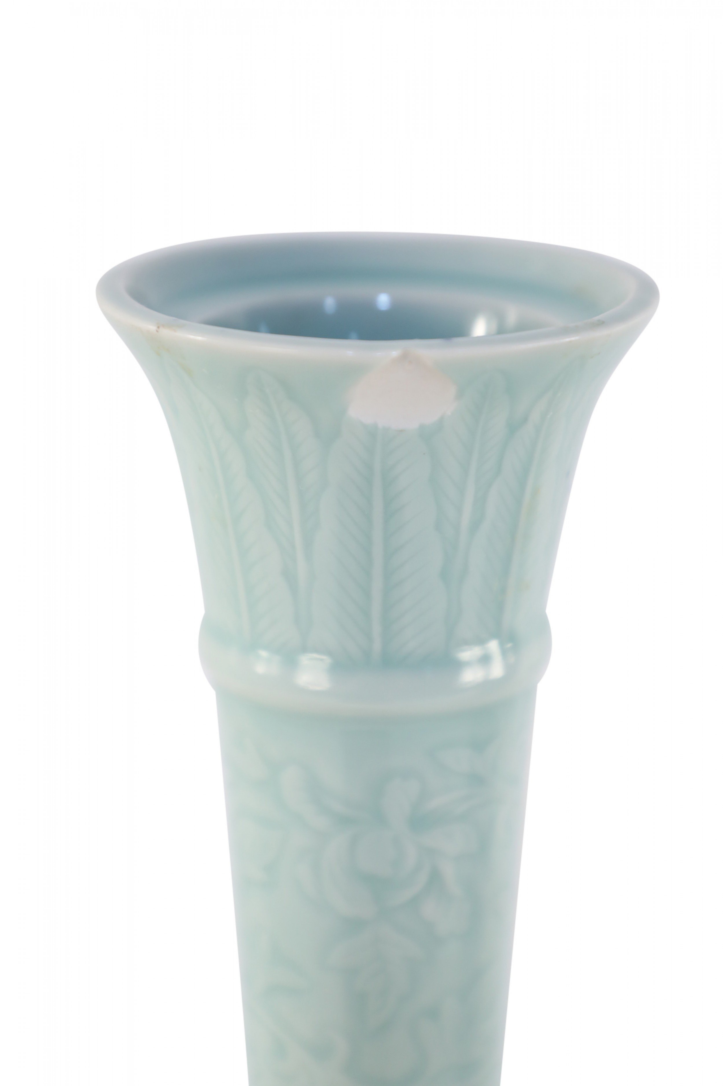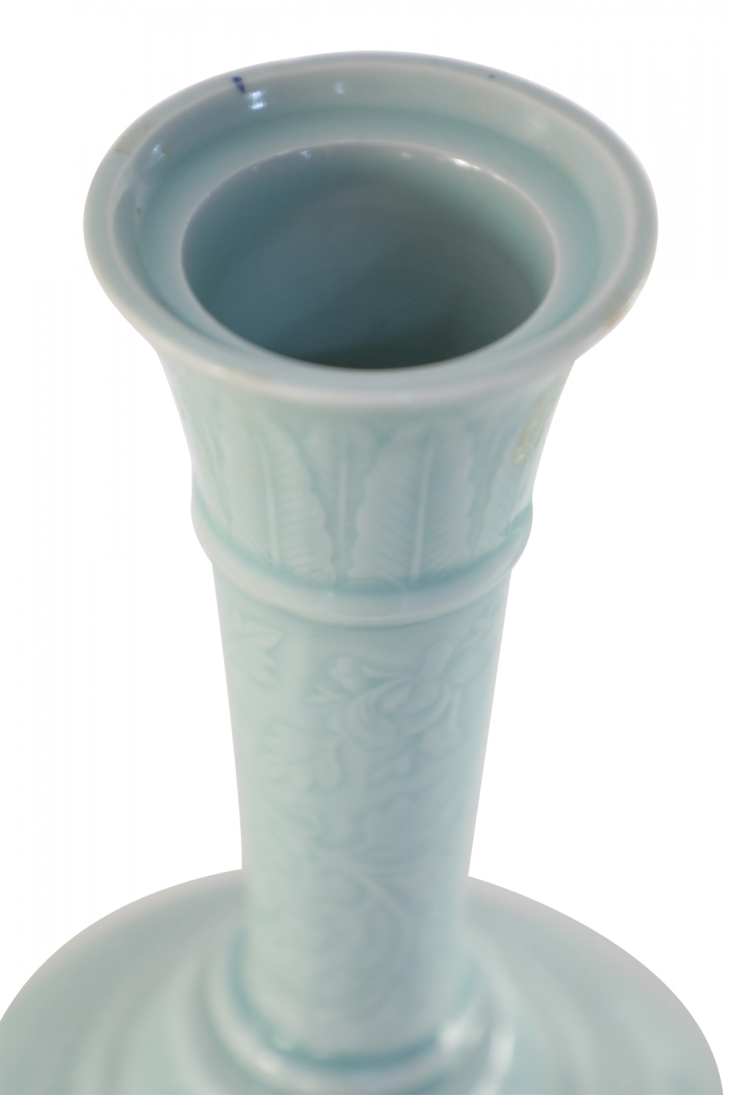 Chinese celadon ceramic vase with a gourd-shaped form wrapped in a tonal vine pattern and fitted with a ball finial-topped lid. (Similar vase in blue: NWL2041).