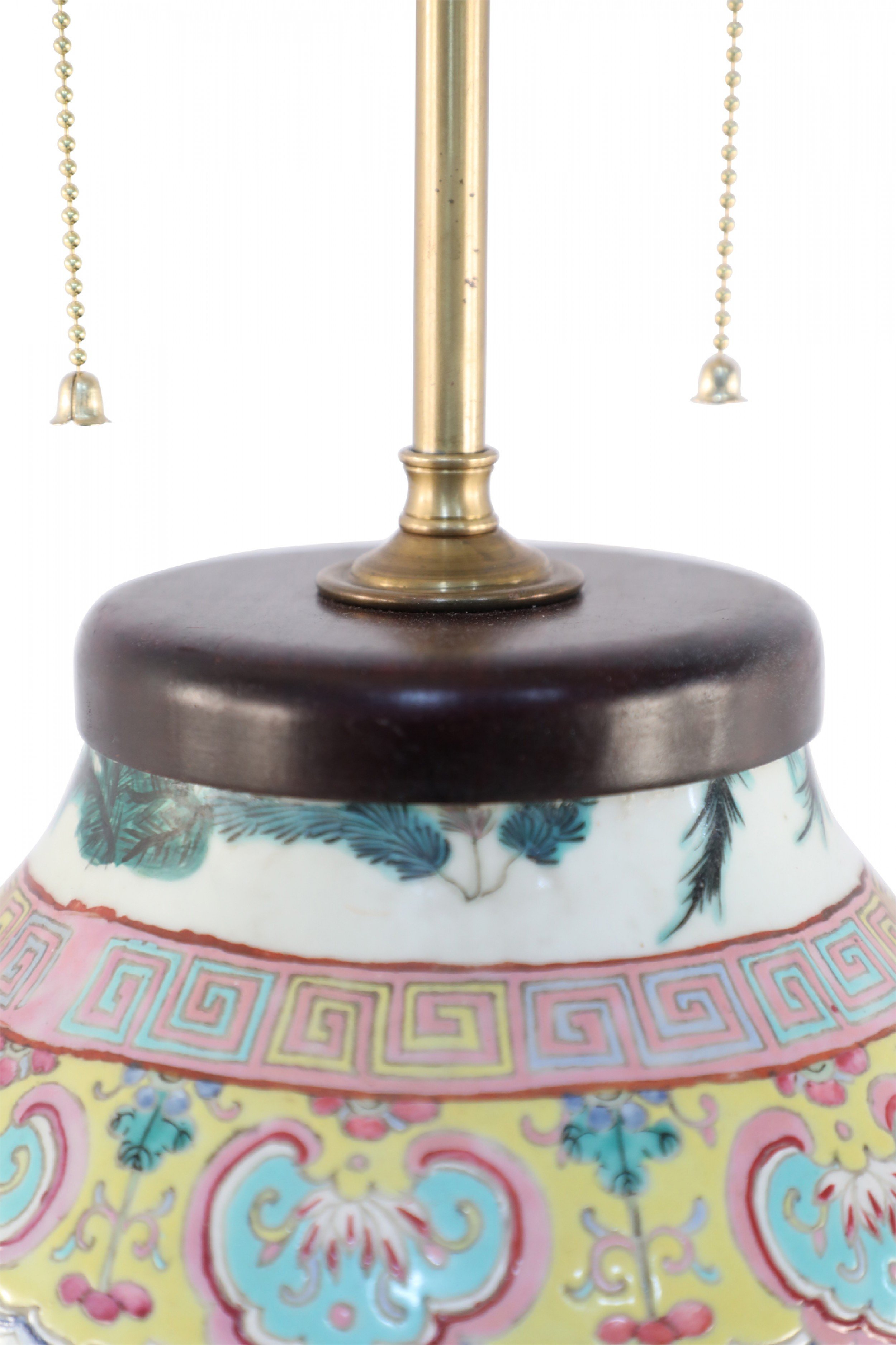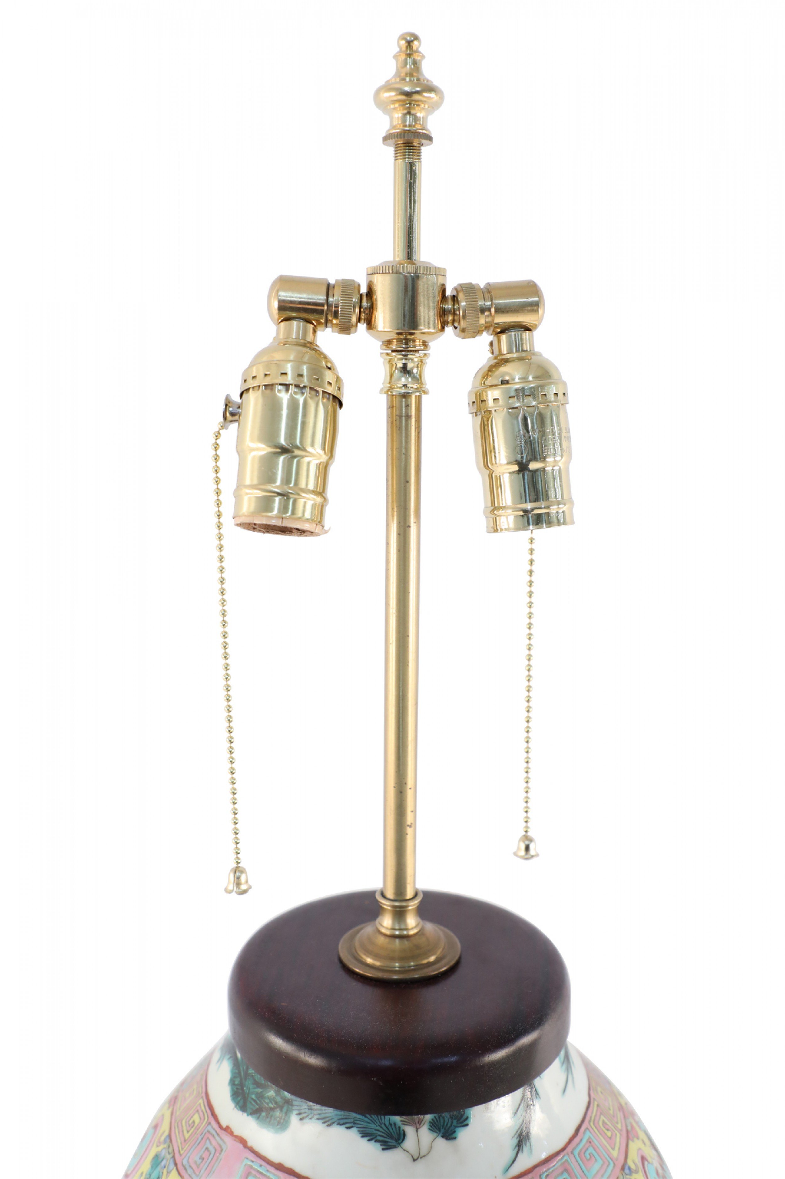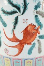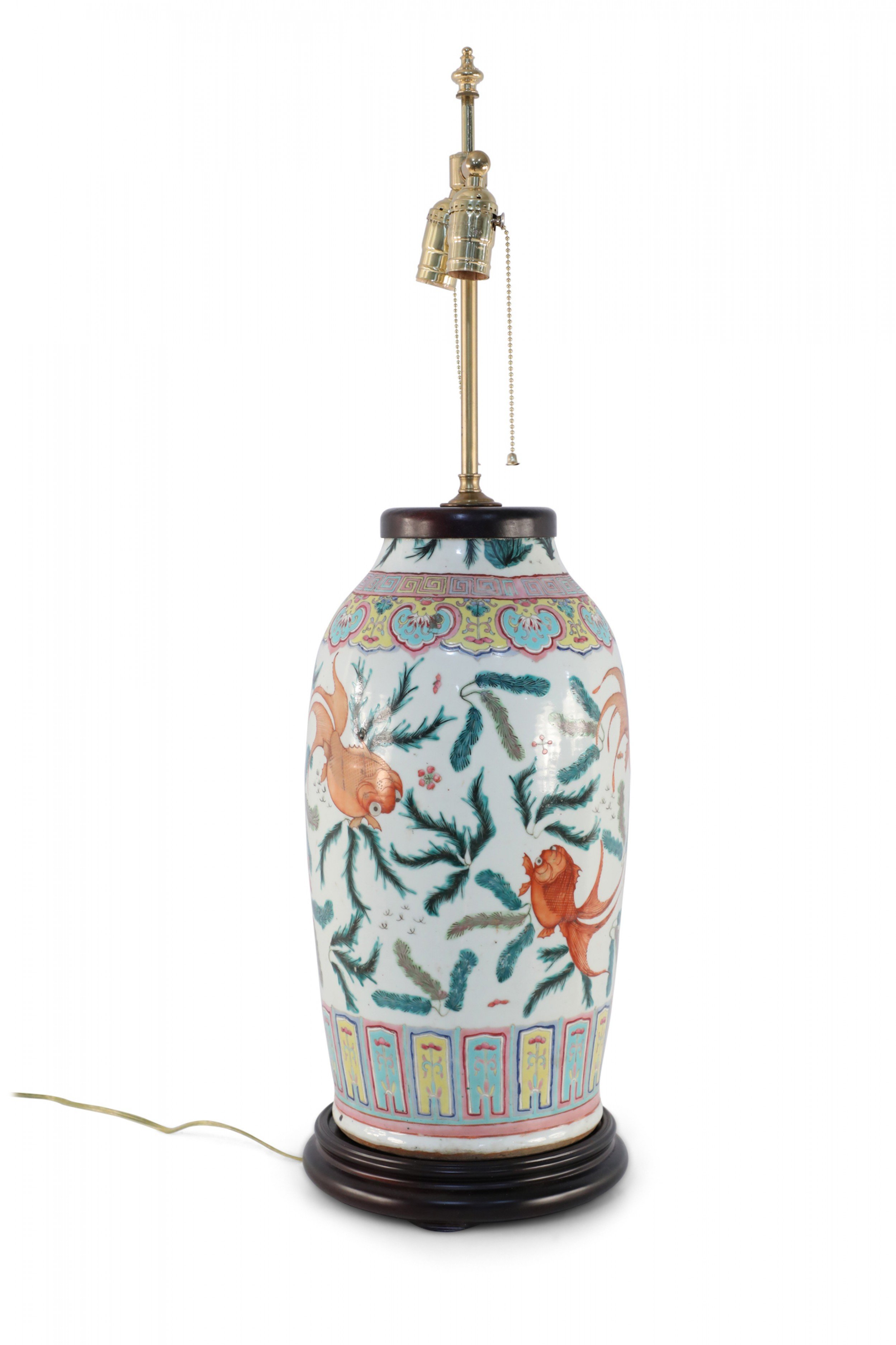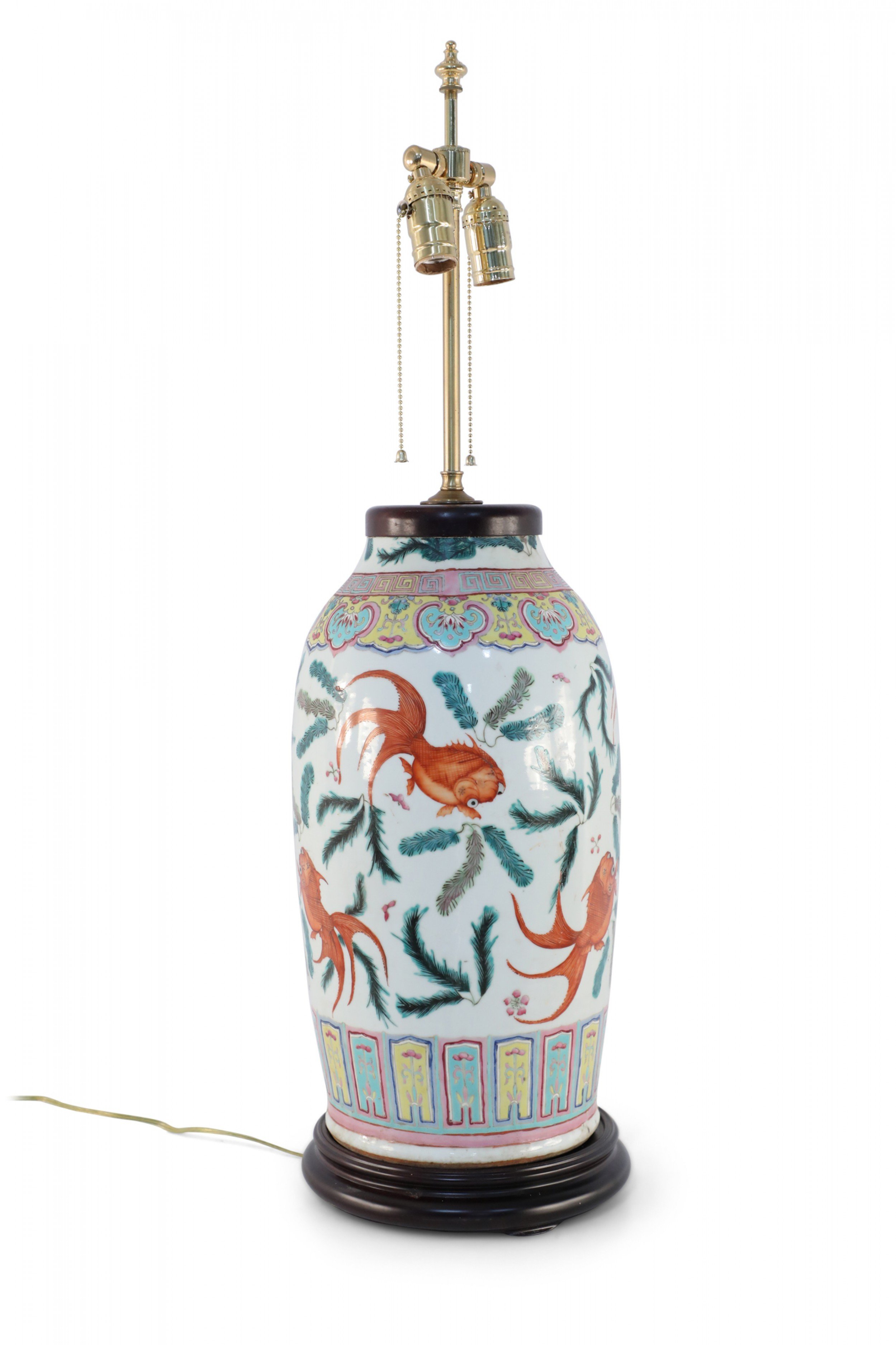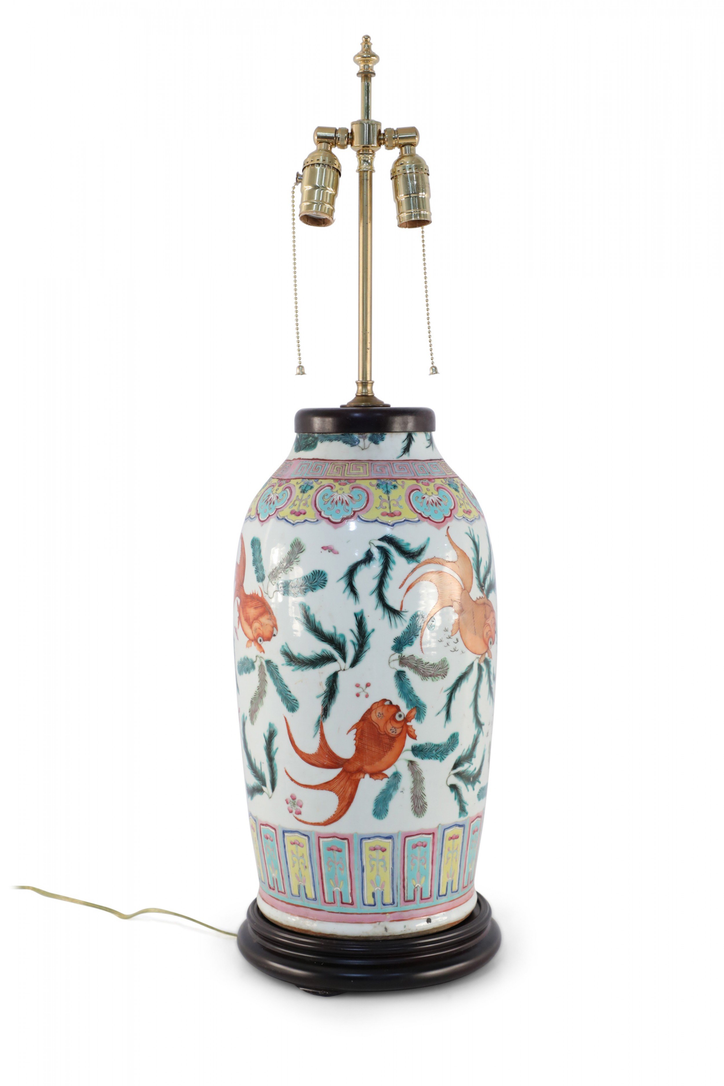 Antique Chinese (Early 20th Century) table lamp made from a porcelain vase intricately painted with orange fish swimming amidst green plant life framed by colorful geometric bands above and below, mounted on a brown wooden base with brass hardware.