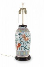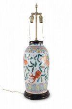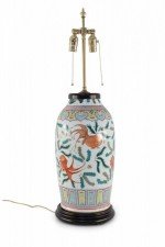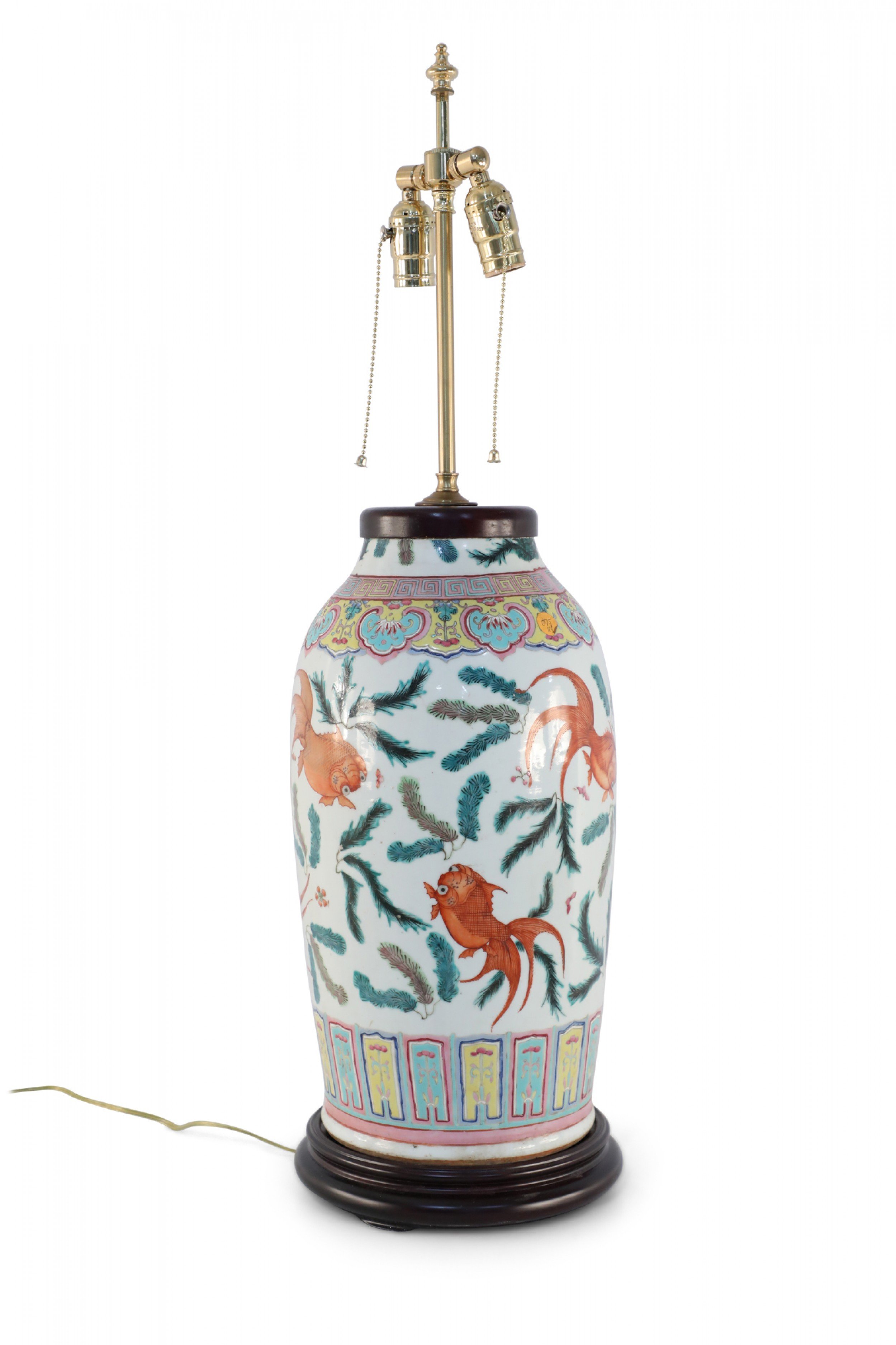 Chinese Ceramic Cream, Orange, and Green Fish Motif Porcelain Table Lamp