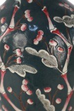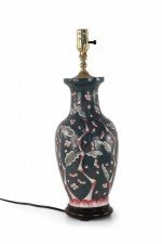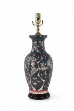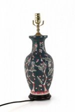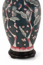 Chinese porcelain table lamp made from a richly colored dark blue vase with a red, pink and white budding cherry blossom tree climbing up its form, a wooden base, and brass hardware.