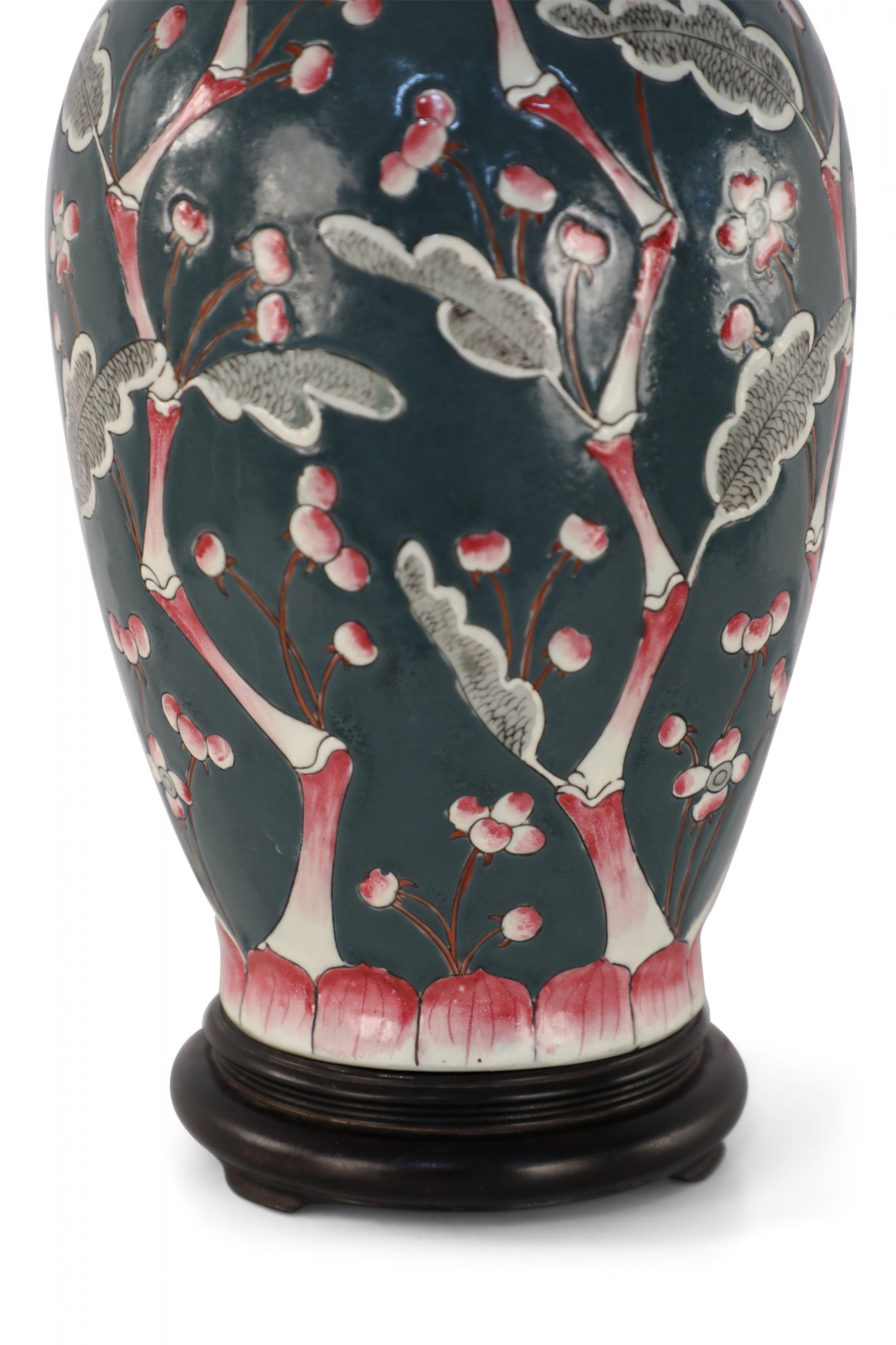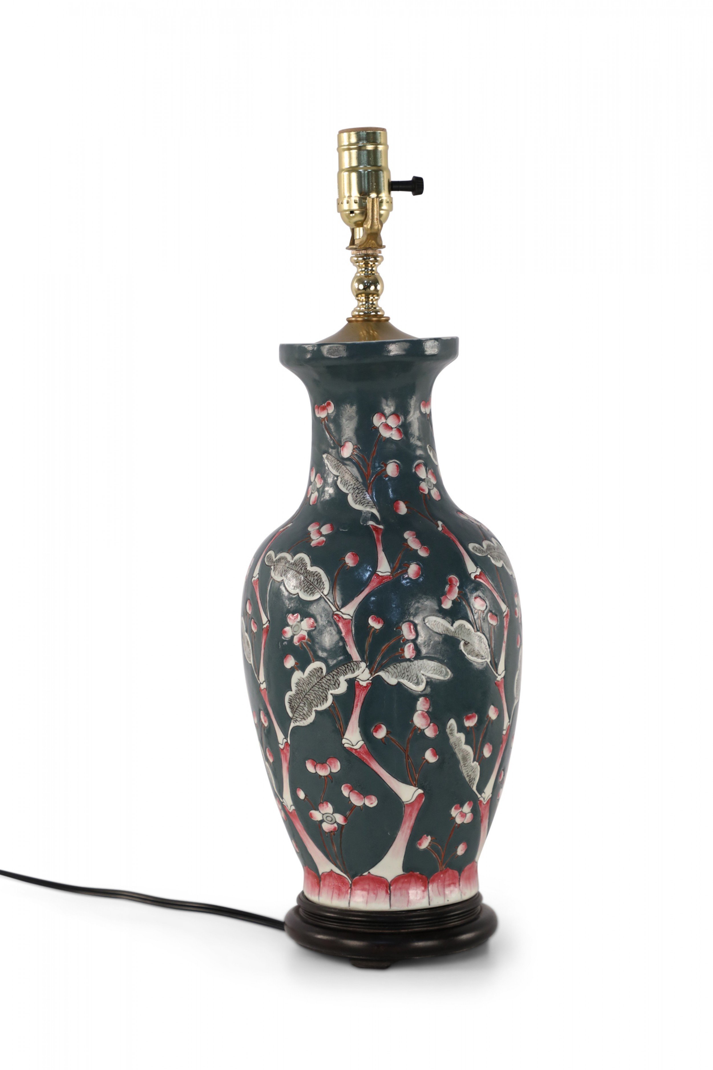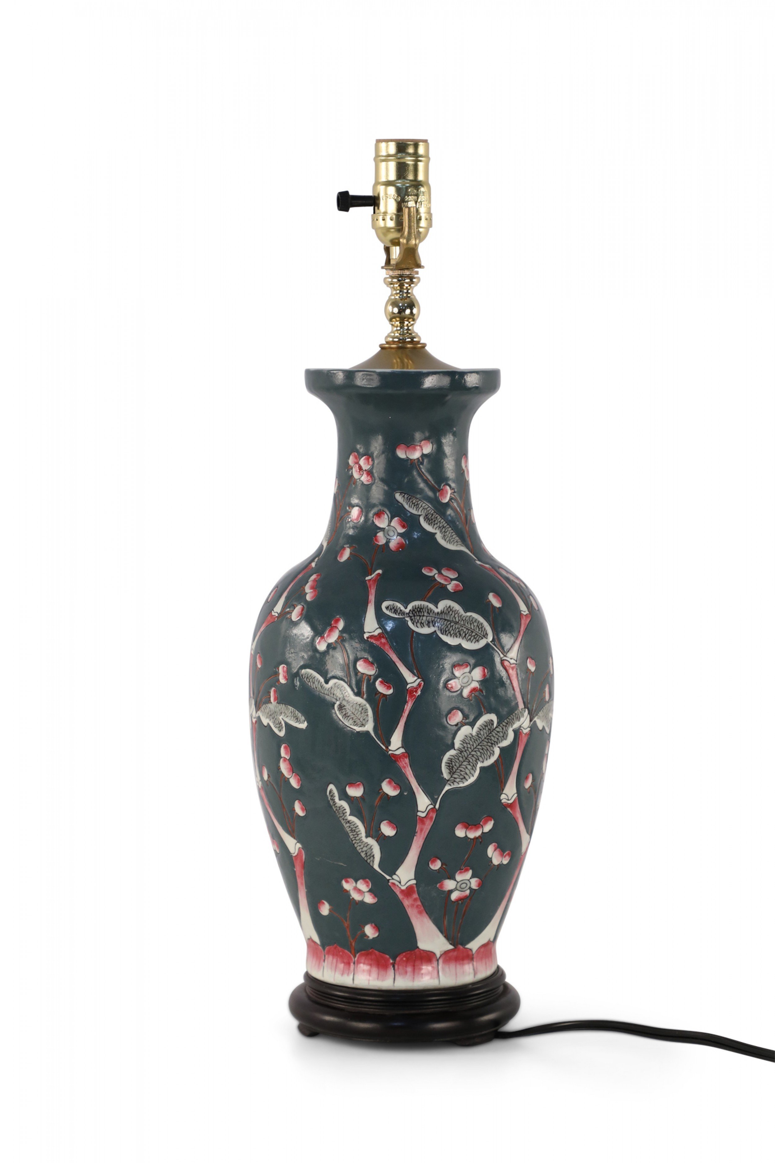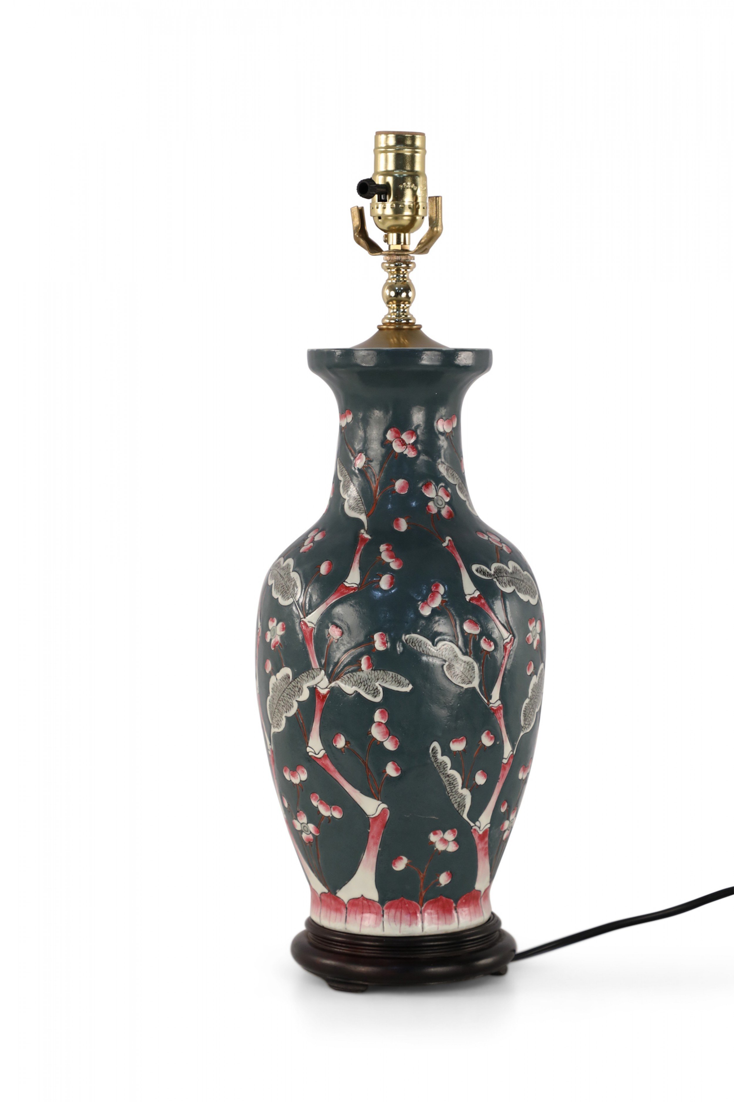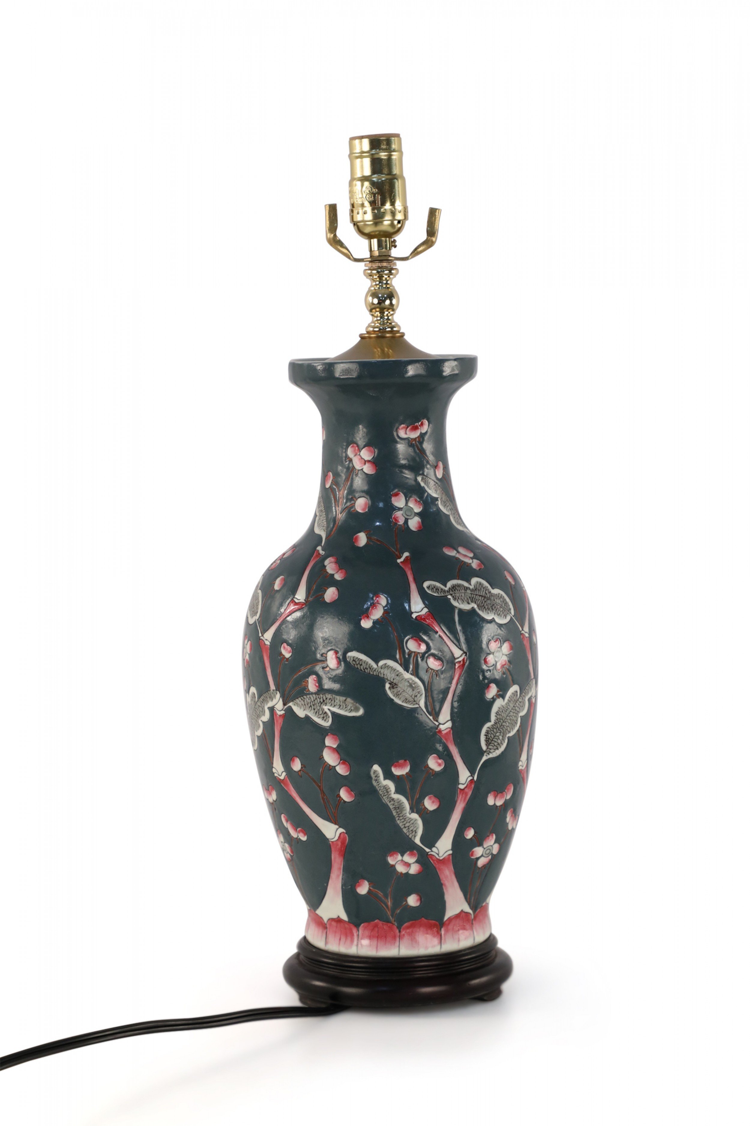 Chinese porcelain table lamp made from a richly colored dark blue vase with a red, pink and white budding cherry blossom tree climbing up its form, a wooden base, and brass hardware..