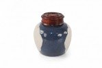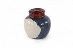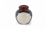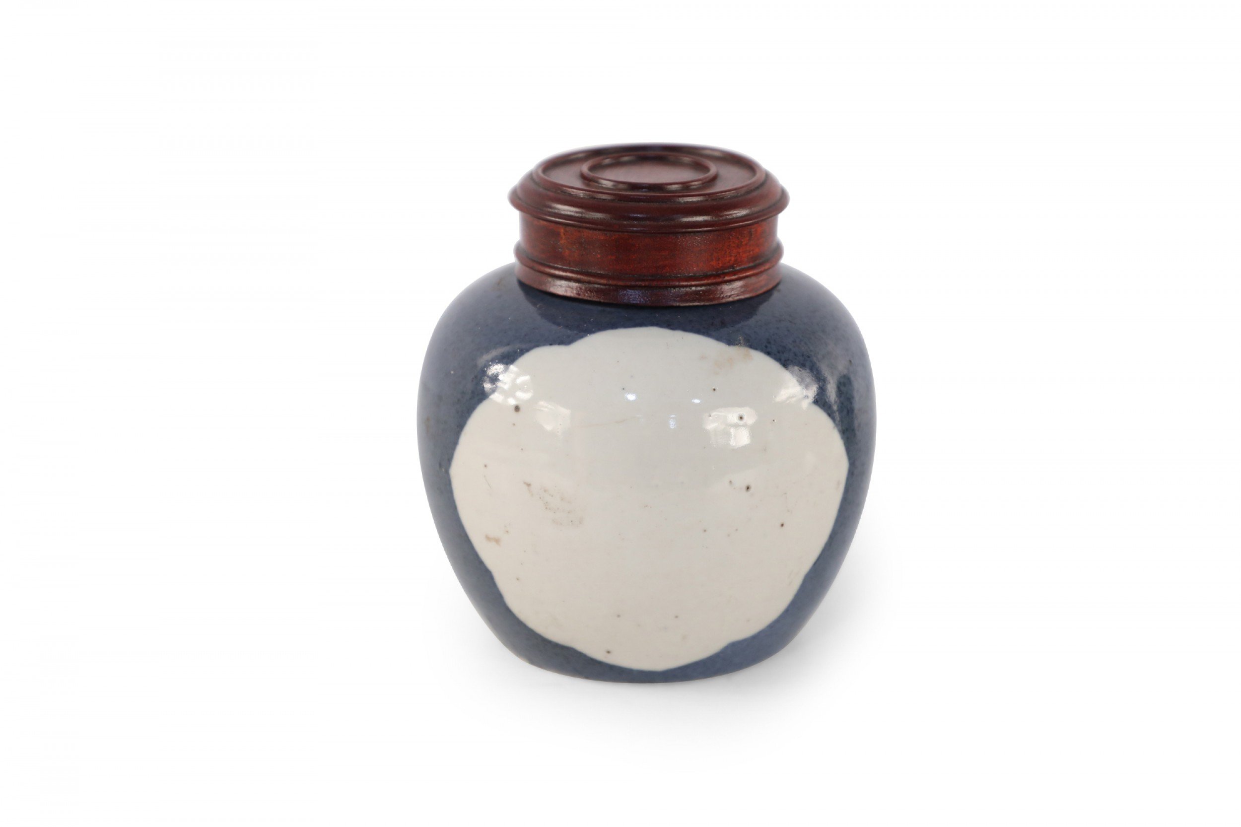 Chinese small porcelain watermelon jar with a dark blue background surrounding a white window pattern and turned wooden lid.