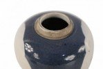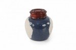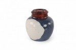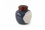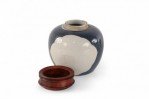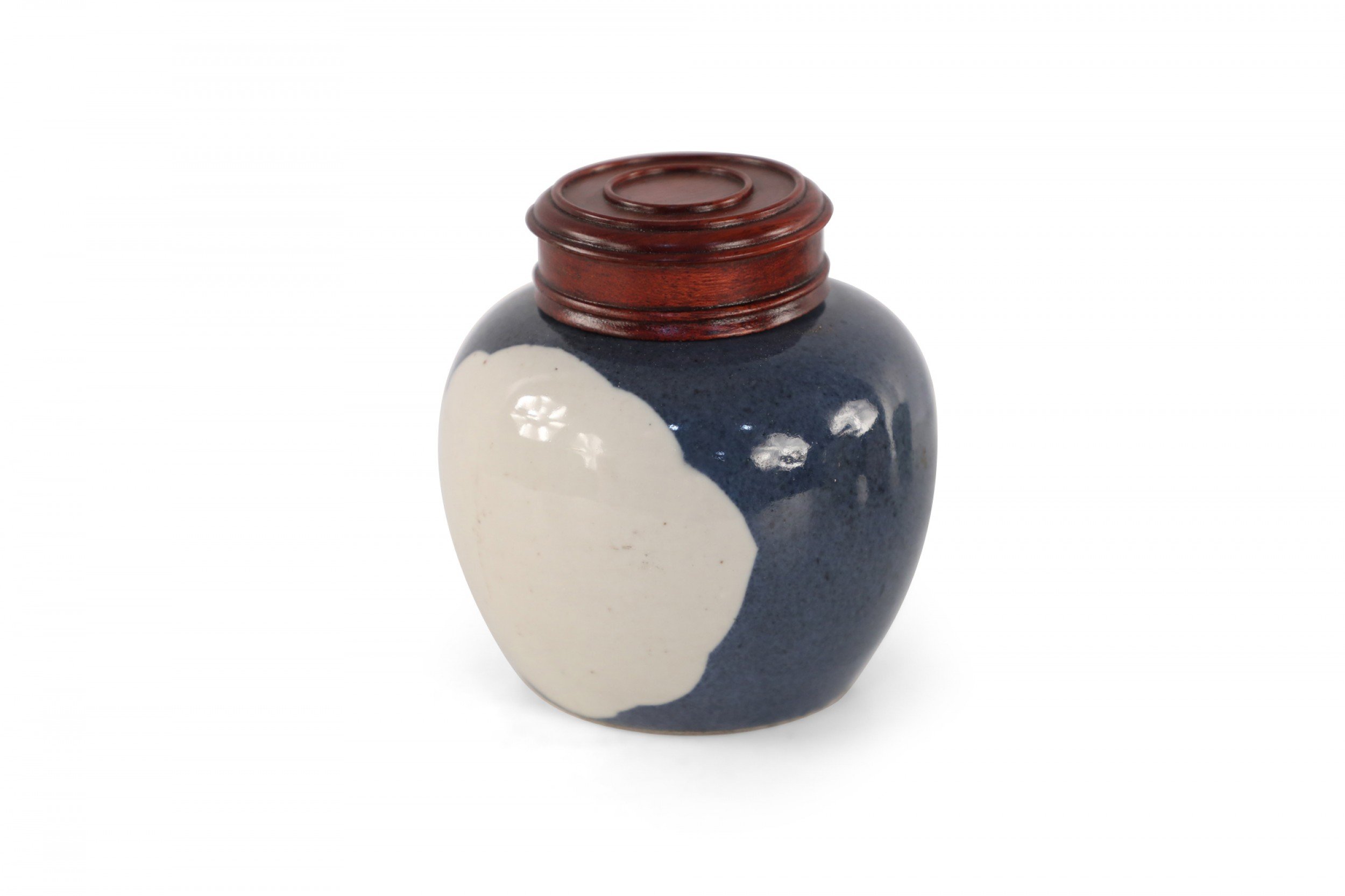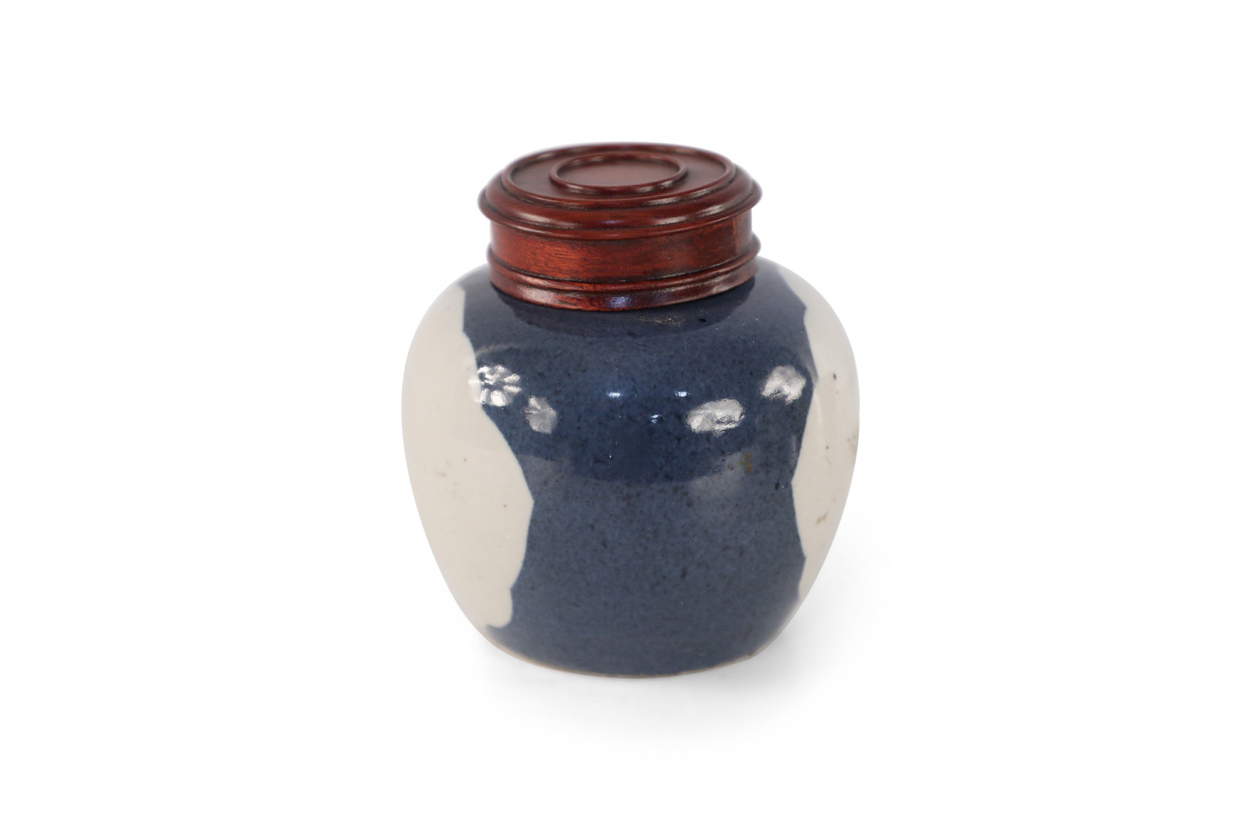 Chinese small porcelain watermelon jar with a dark blue background surrounding a white window pattern and turned wooden lid..