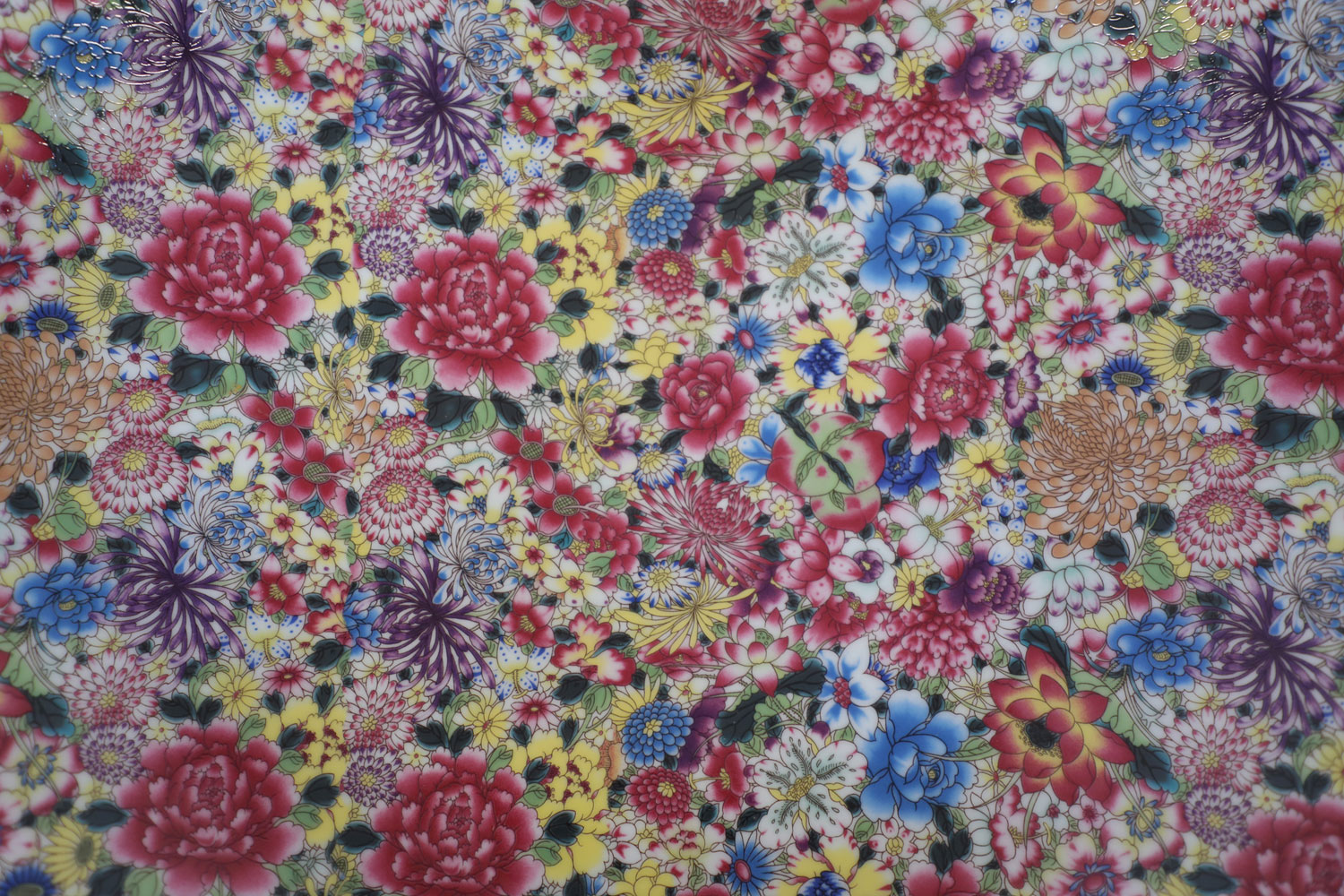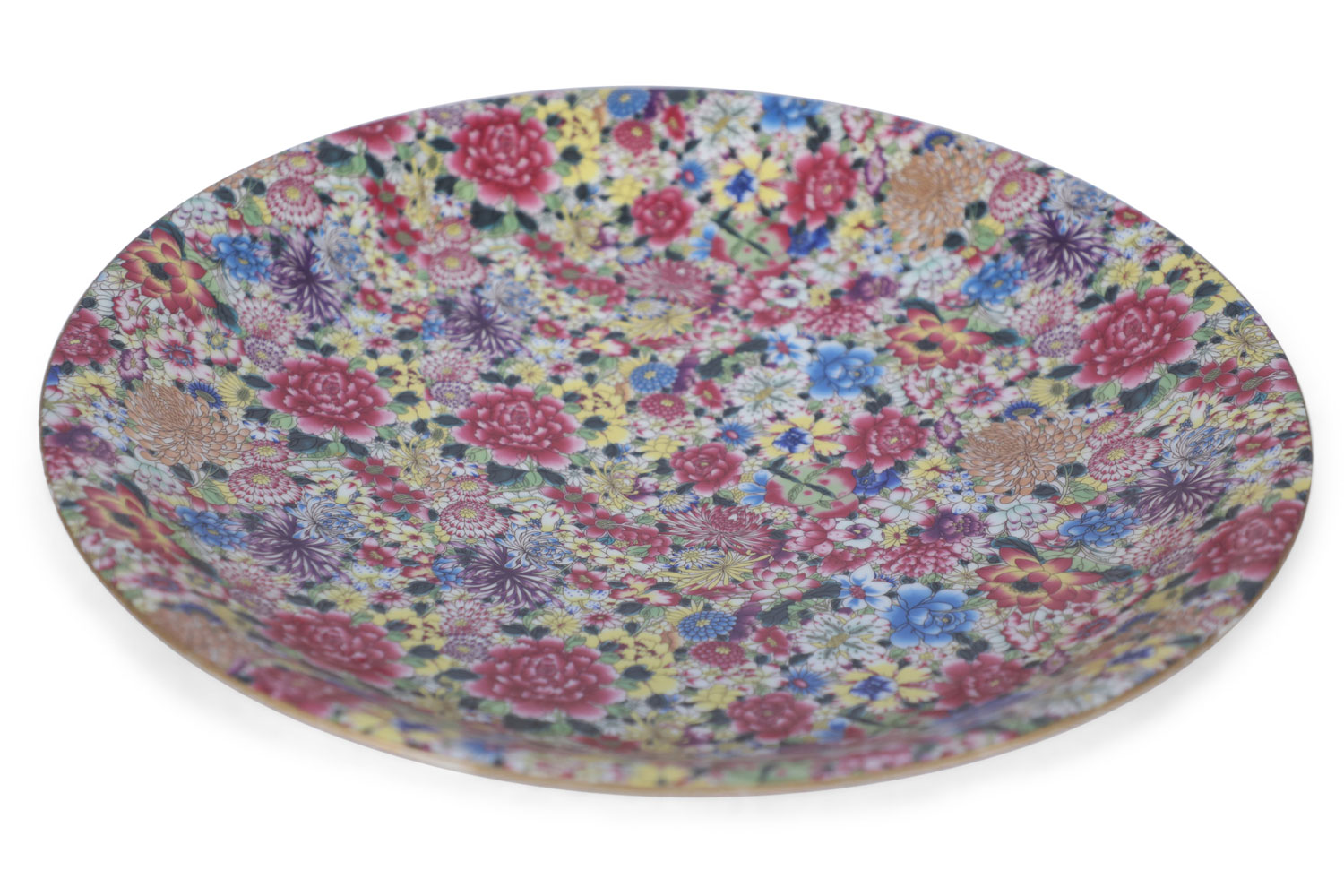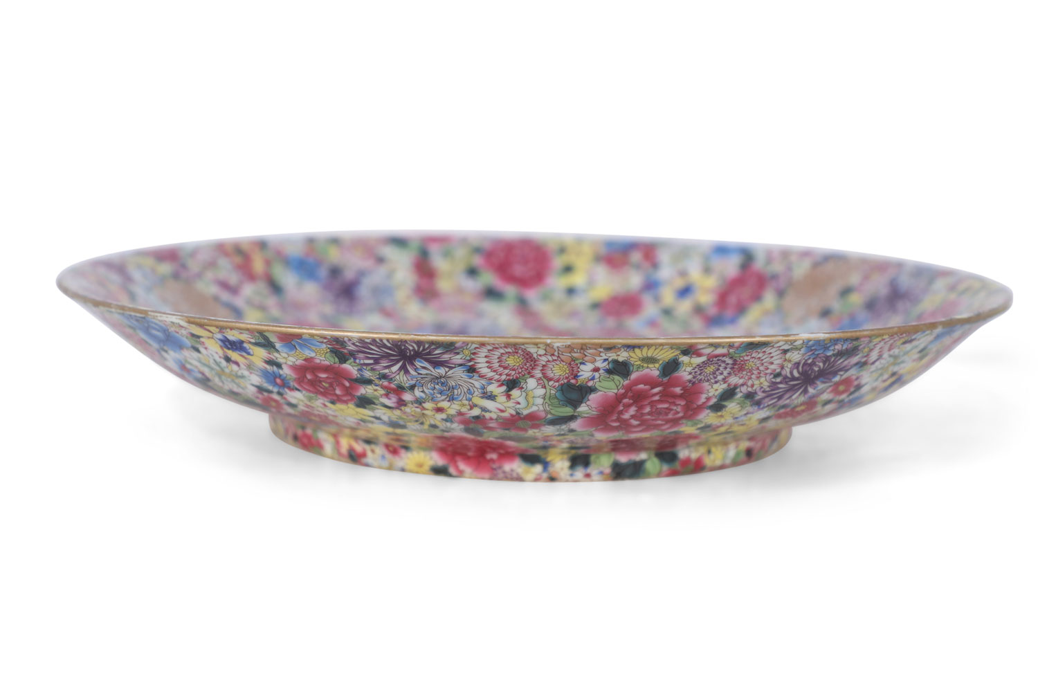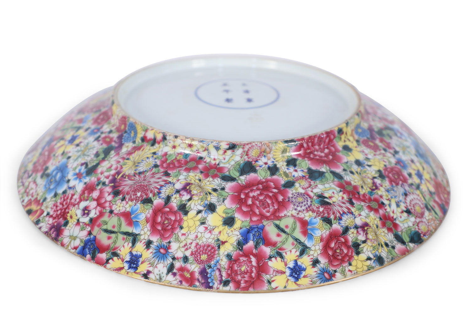 Chinese shallow porcelain bowl with a "thousand flower"" pattern that covers the bowl in such an abundant array of brightly colored florals that neither the branches, nor the porcelain ground are visible (mark on bottom, see photos).