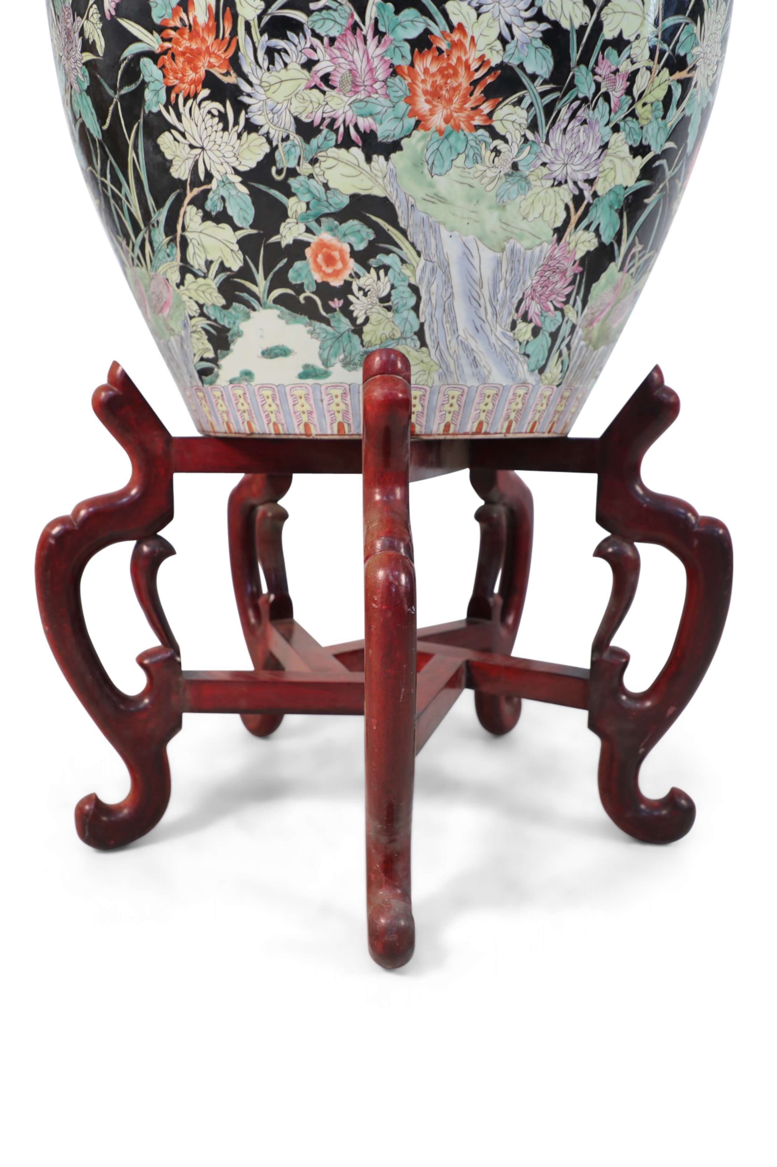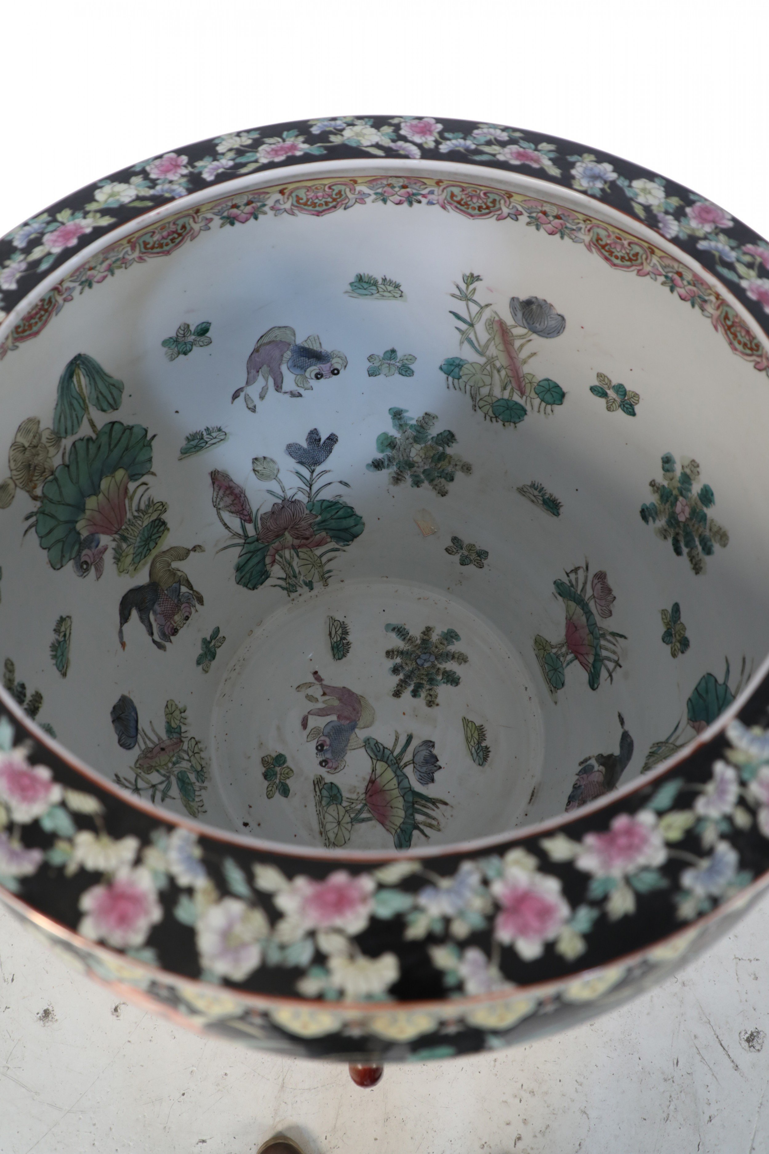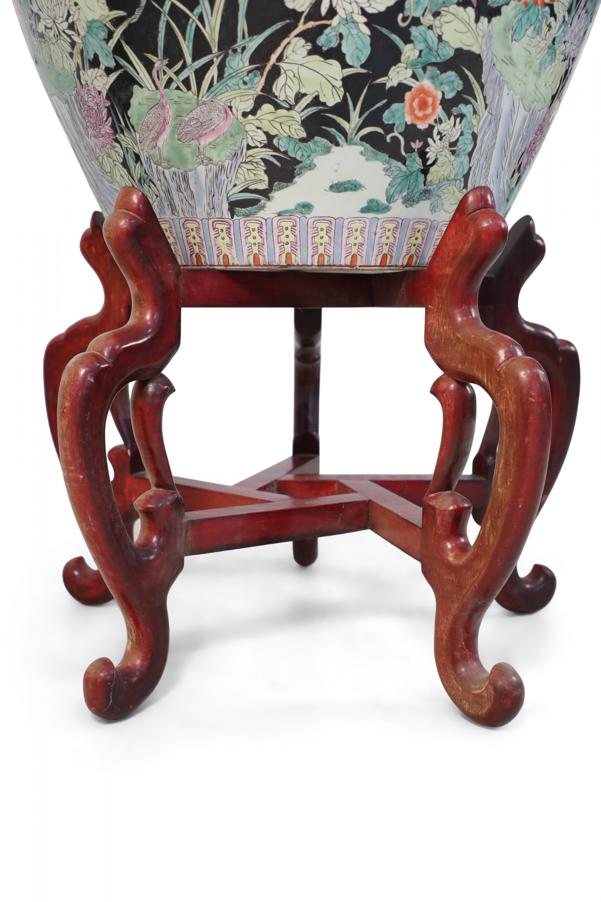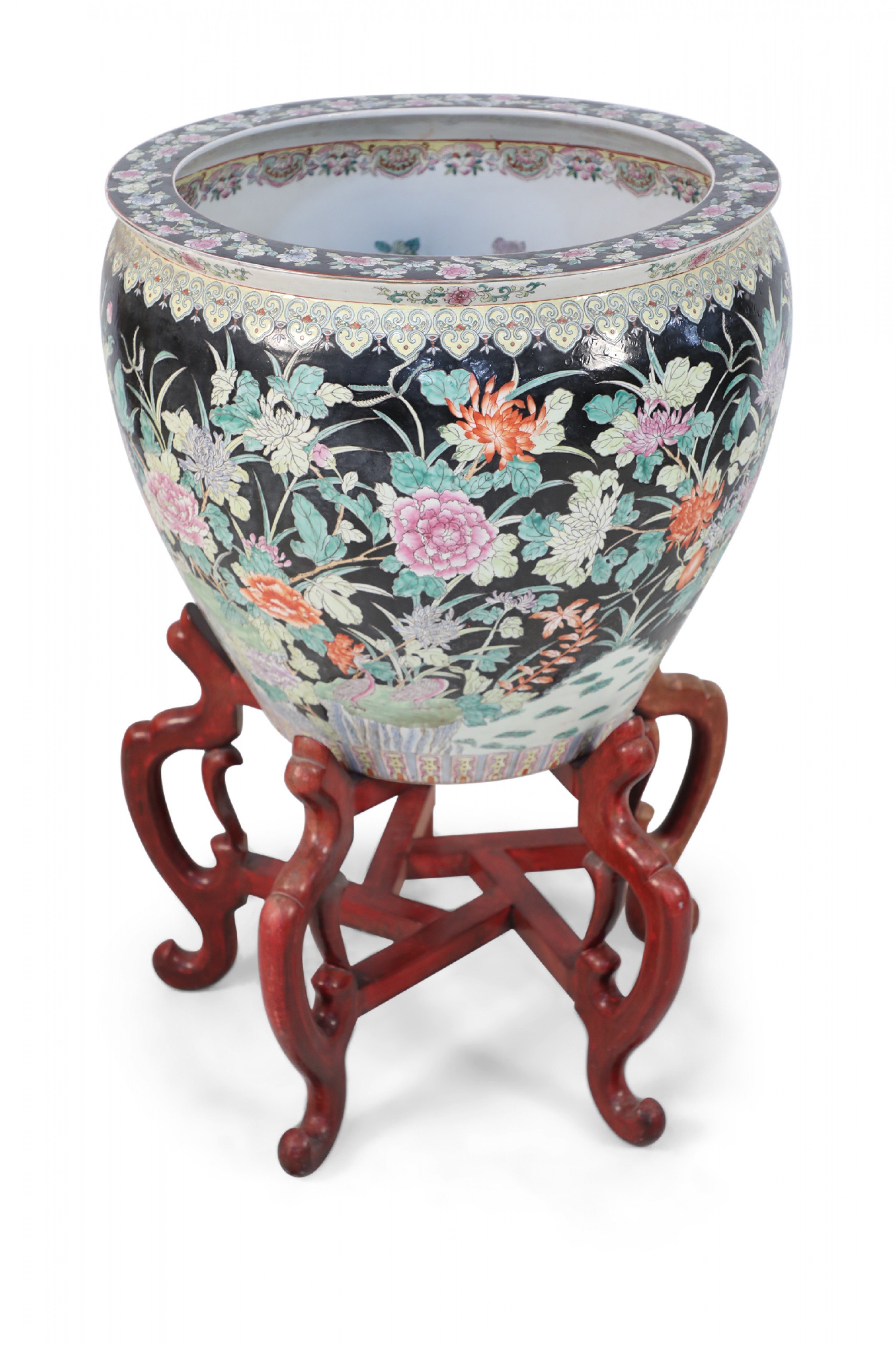 Chinese porcelain planter painted with florals and greenery over a black ground on the exterior and fish amidst seaweed along the interior. The pot sits atop a 5-footed wooden stand connected by stretchers.
