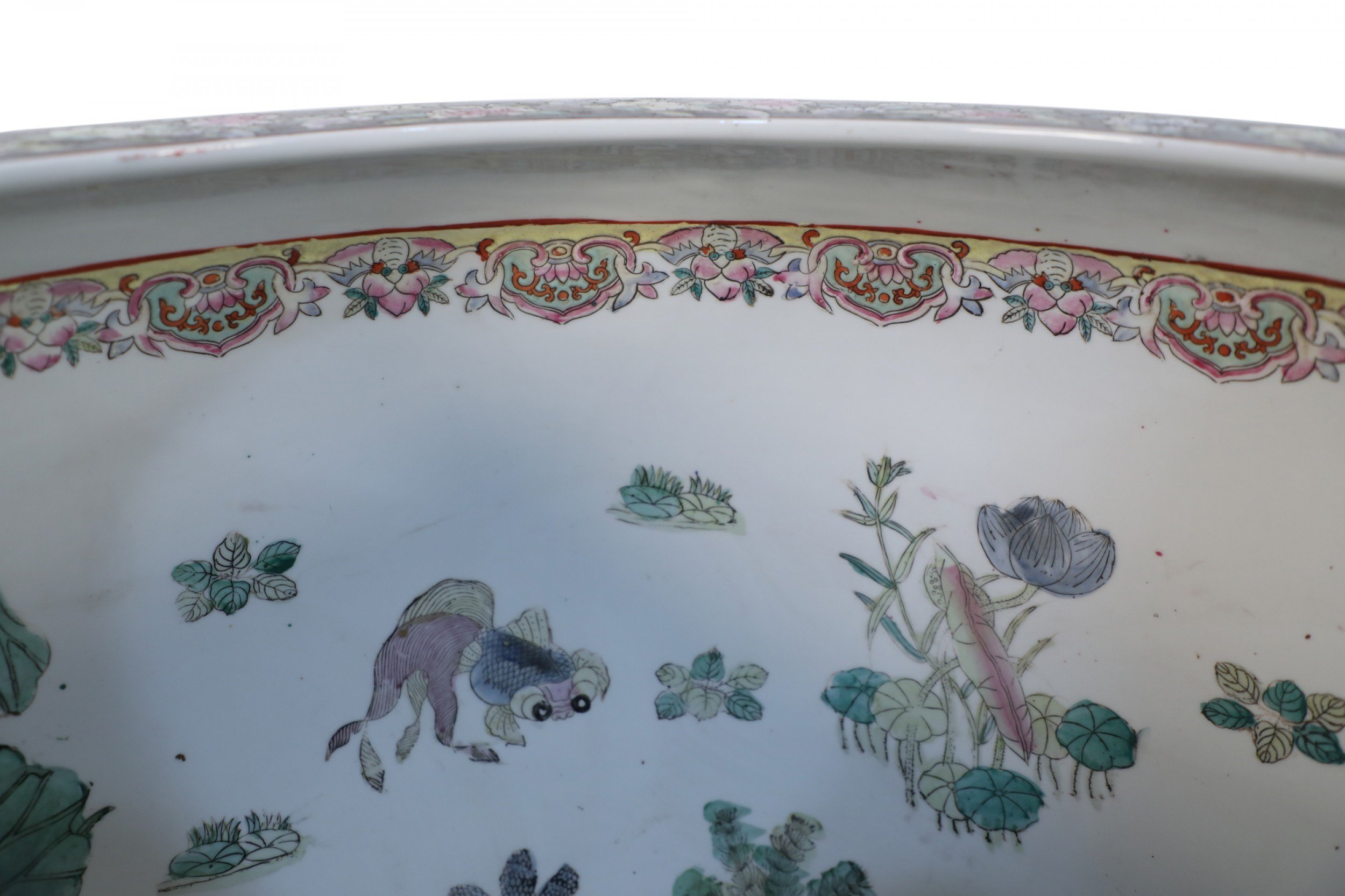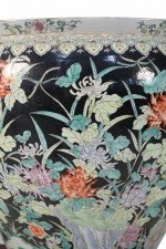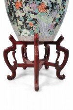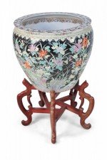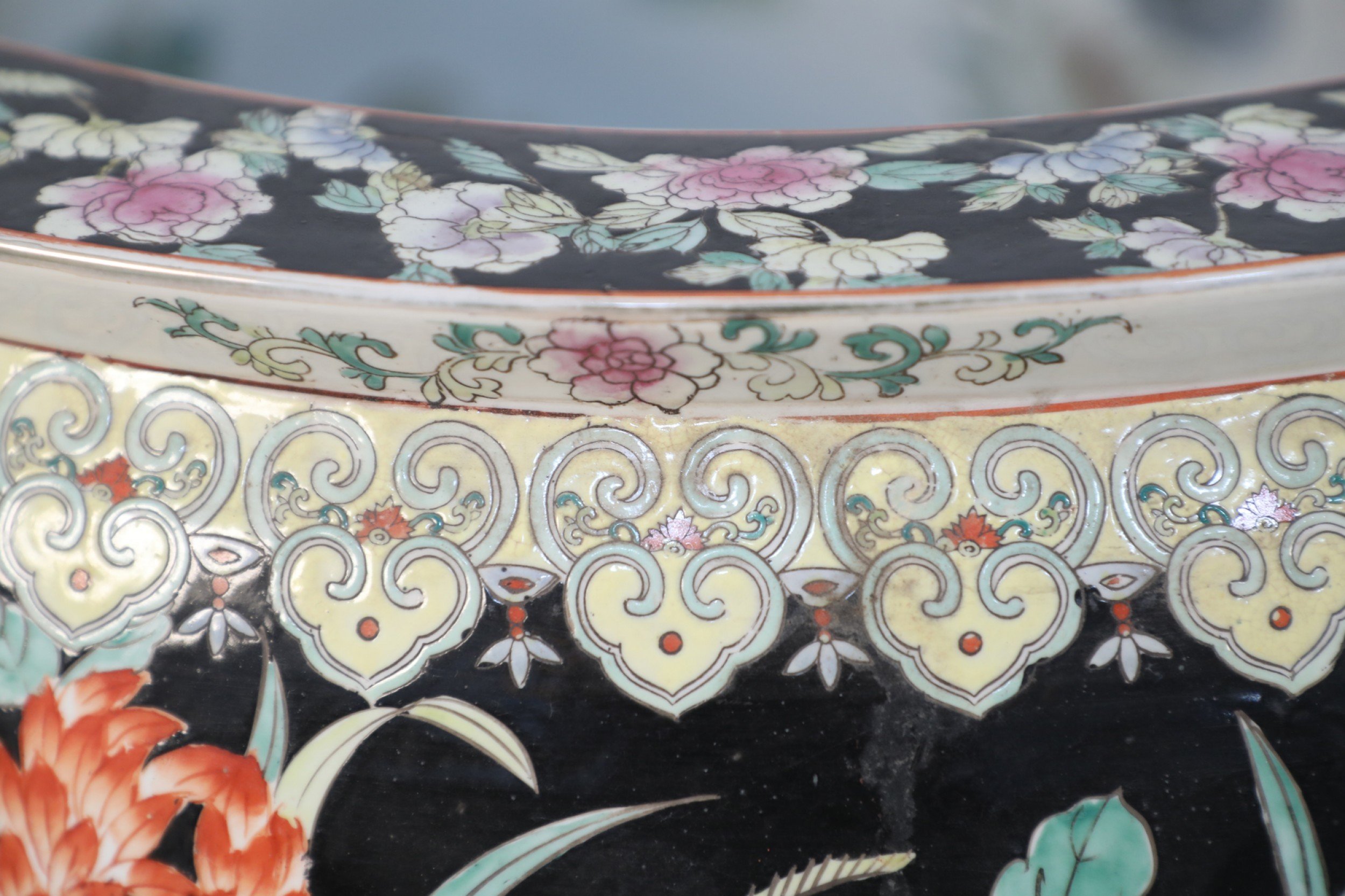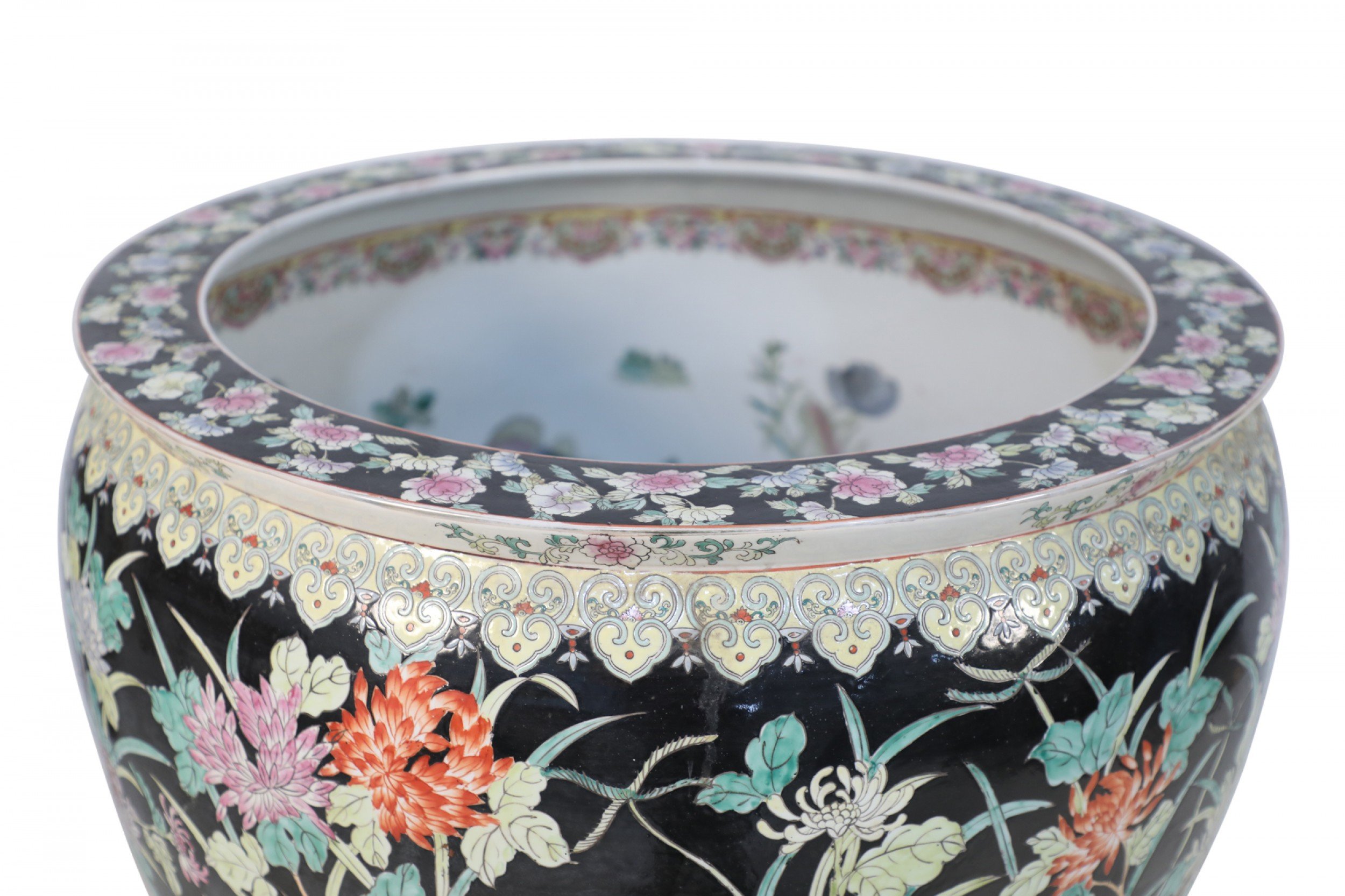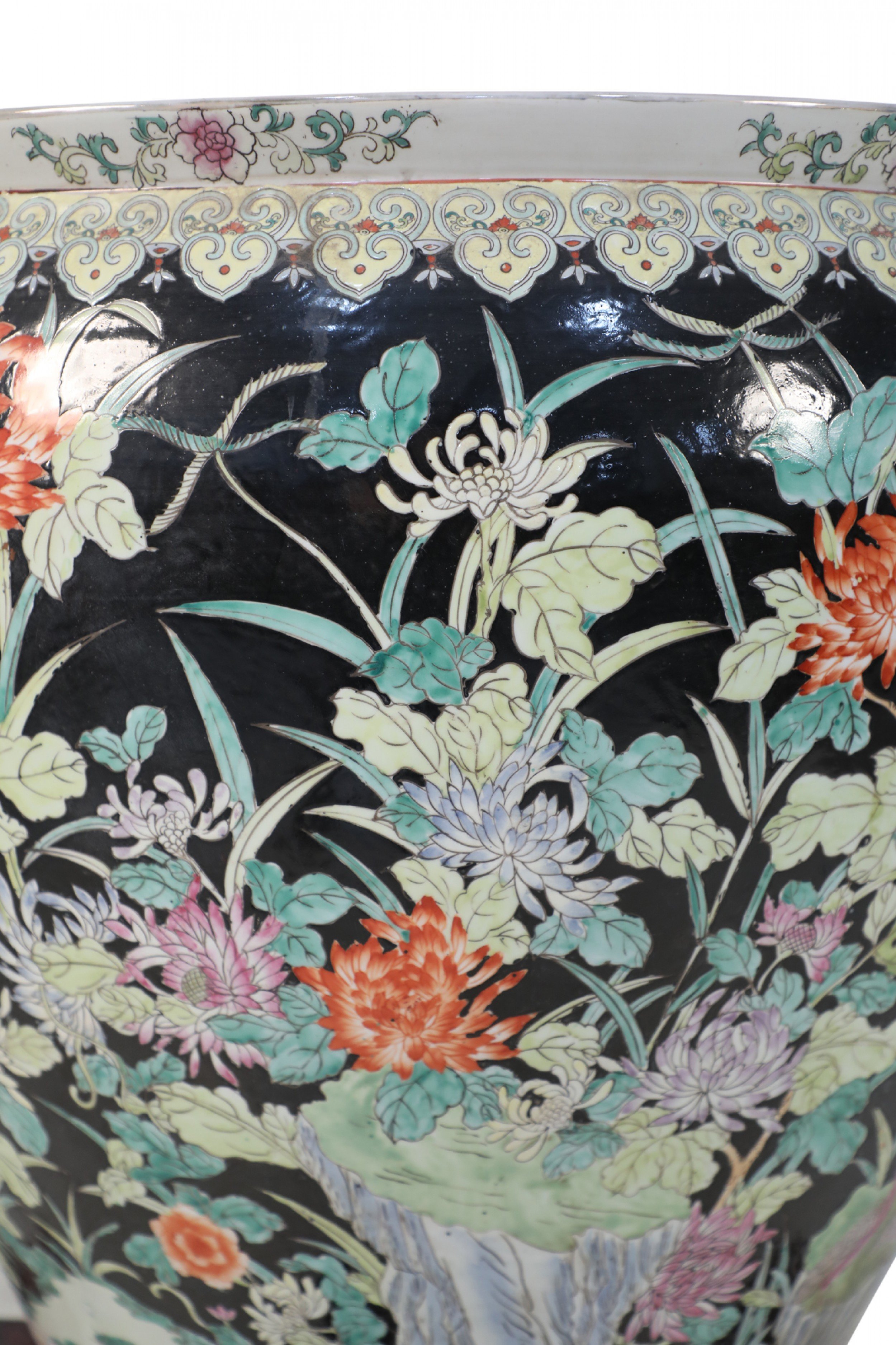 Chinese porcelain planter painted with florals and greenery over a black ground on the exterior and fish amidst seaweed along the interior. The pot sits atop a 5-footed wooden stand connected by stretchers.