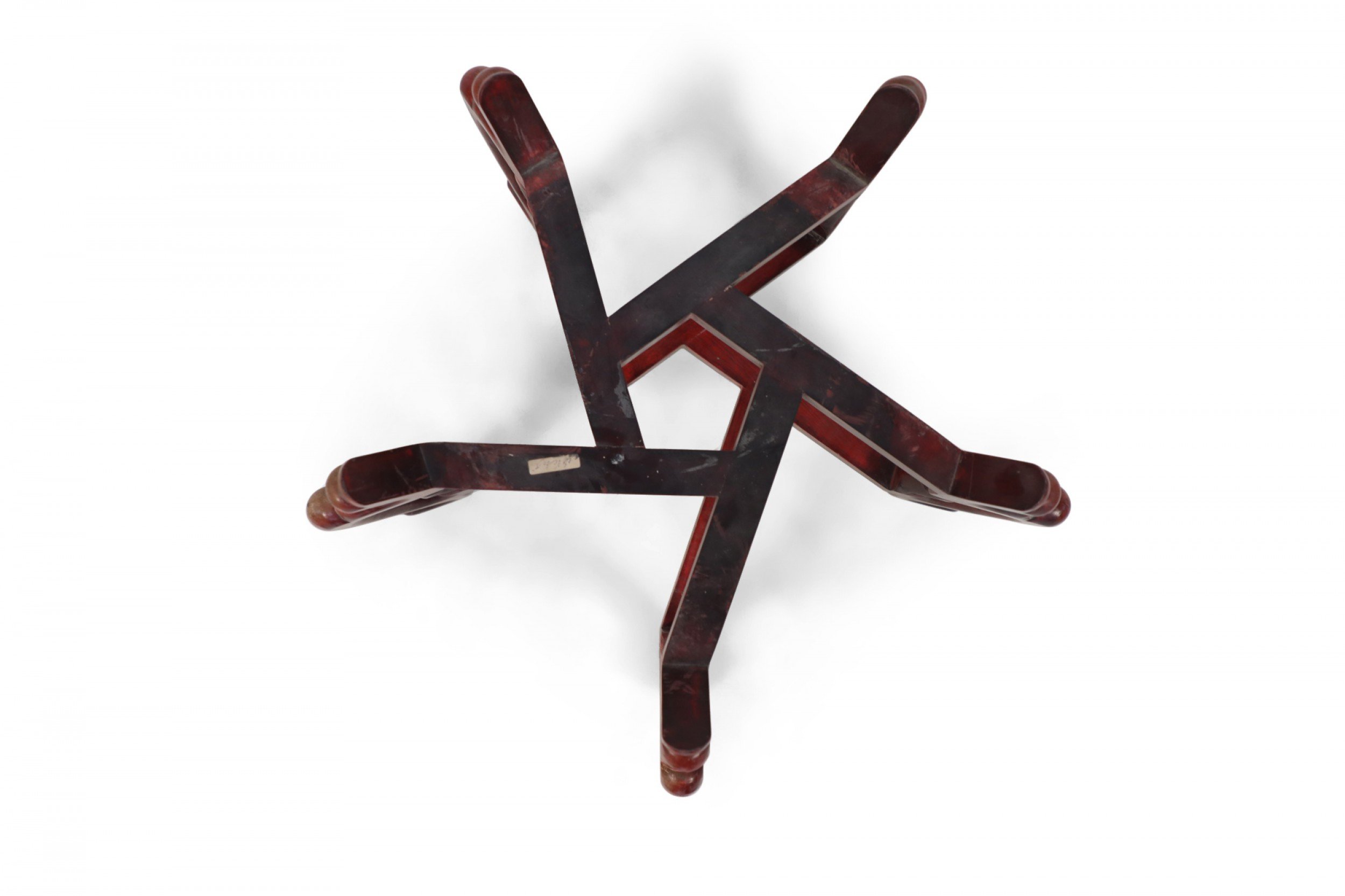 Chinese porcelain planter painted with florals and greenery over a black ground on the exterior and fish amidst seaweed along the interior. The pot sits atop a 5-footed wooden stand connected by stretchers..