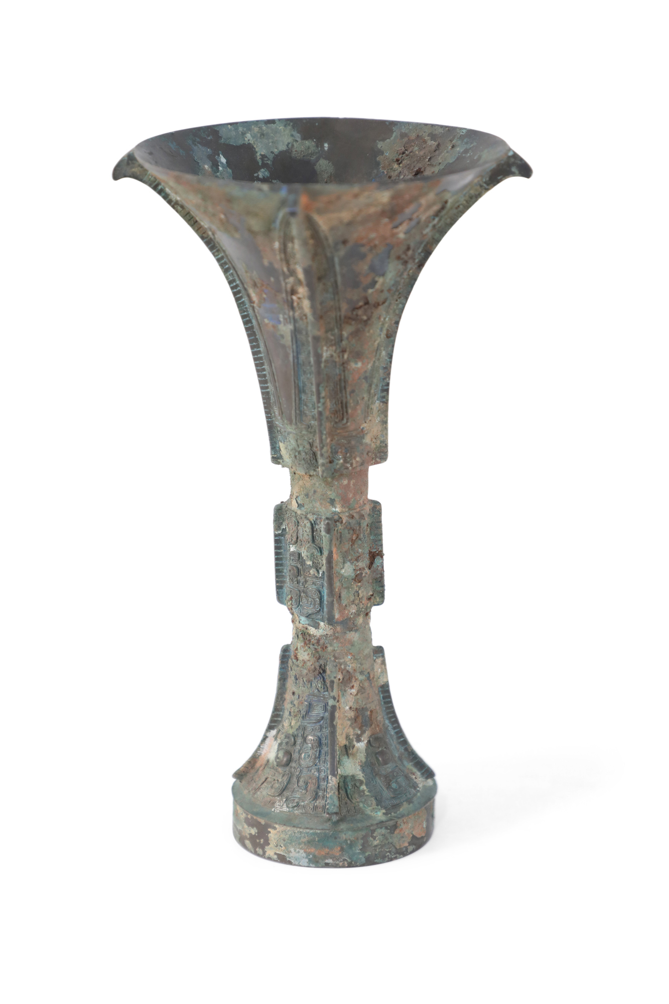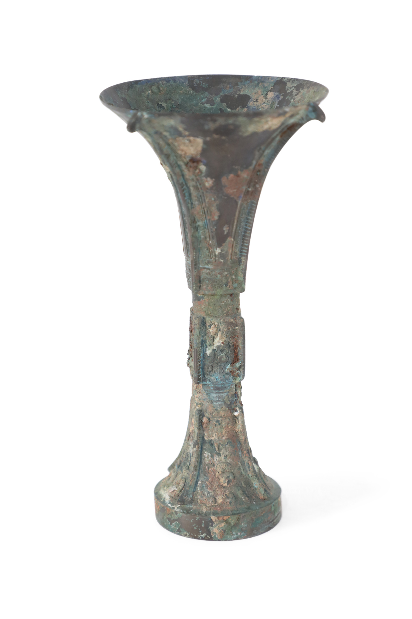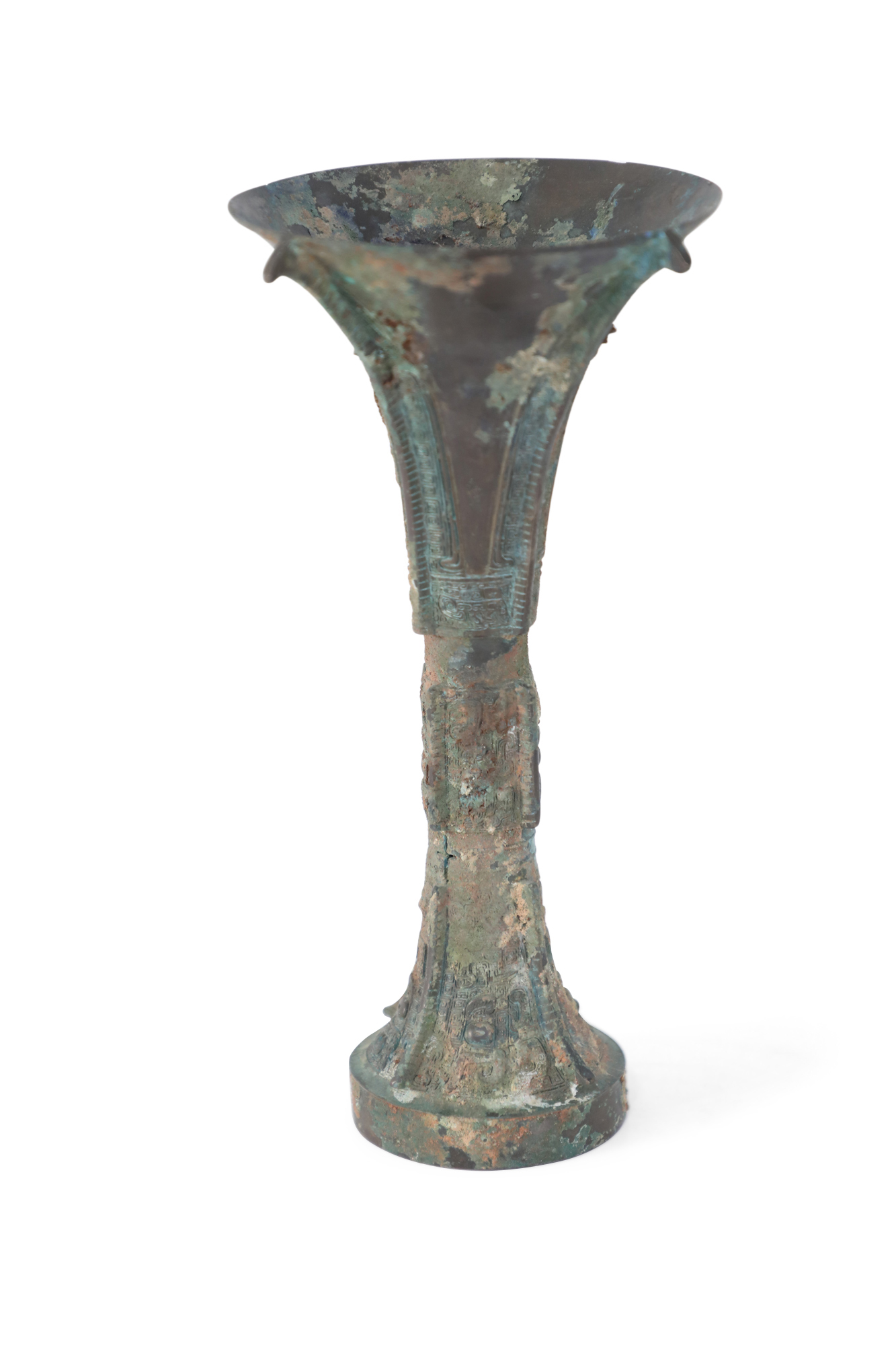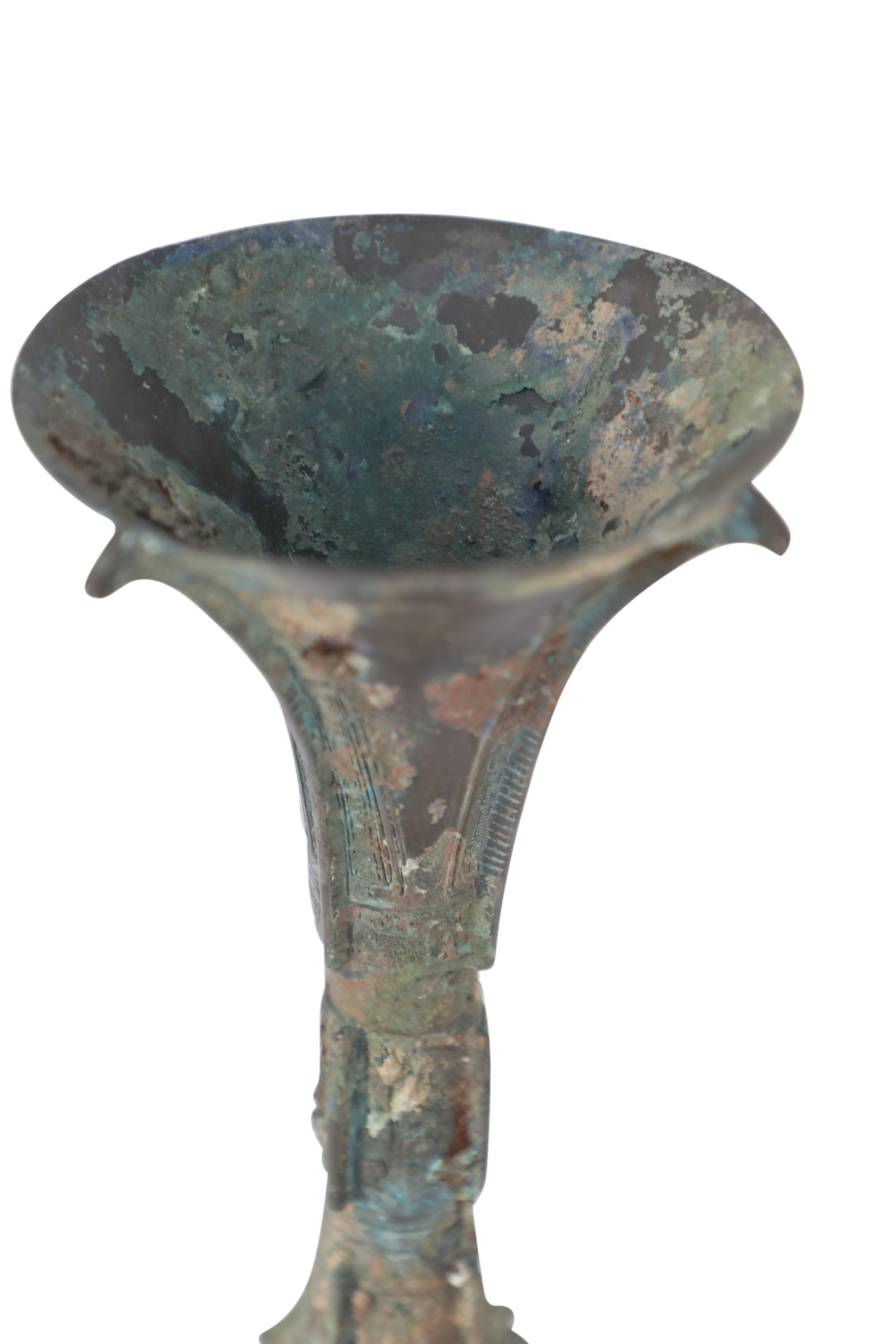 Antique Chinese Han Dynasty-style copy of a patinated bronze wine goblet with a fluted, conical form carved in intricate designs running up the surface, intercepted by two indented bands..