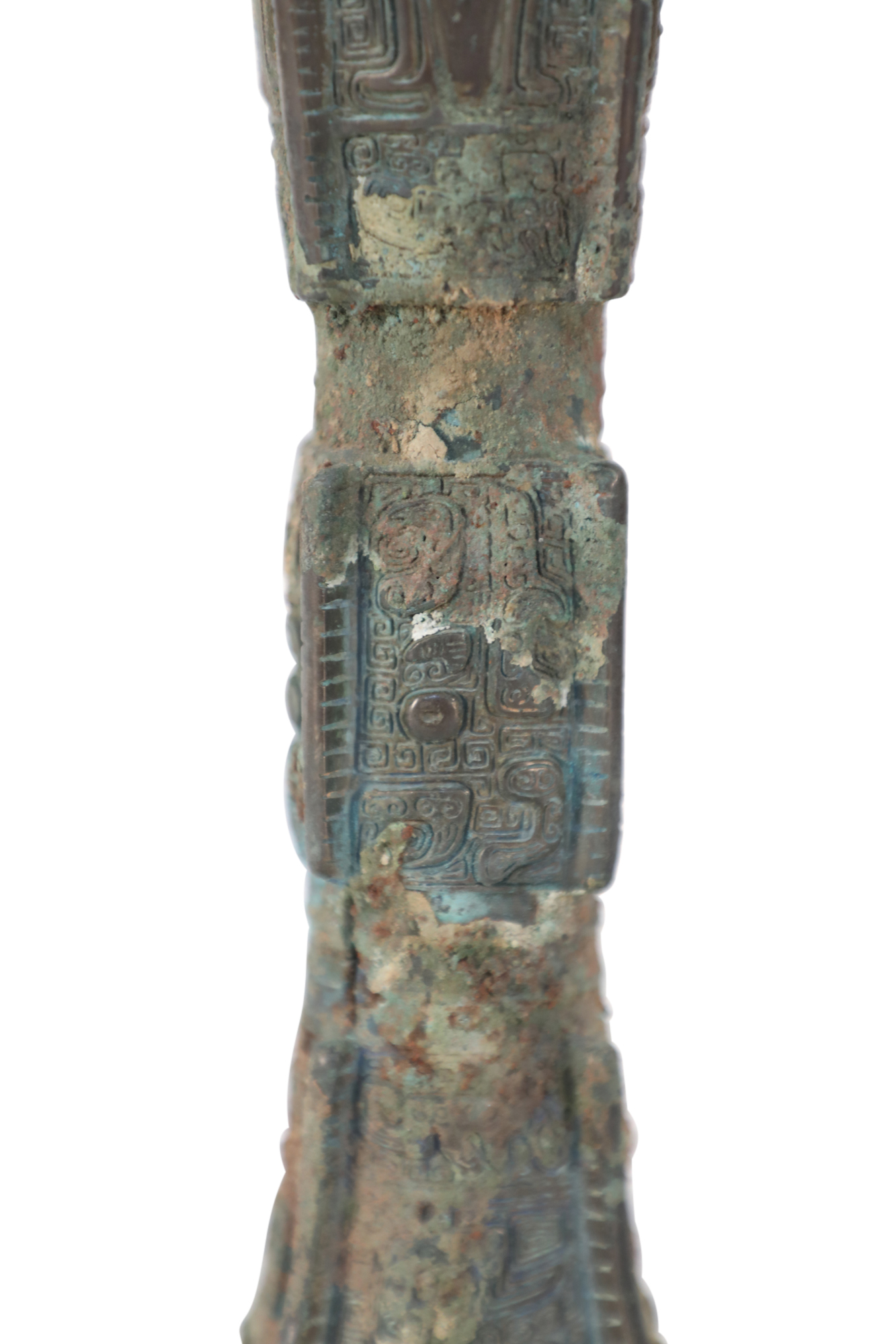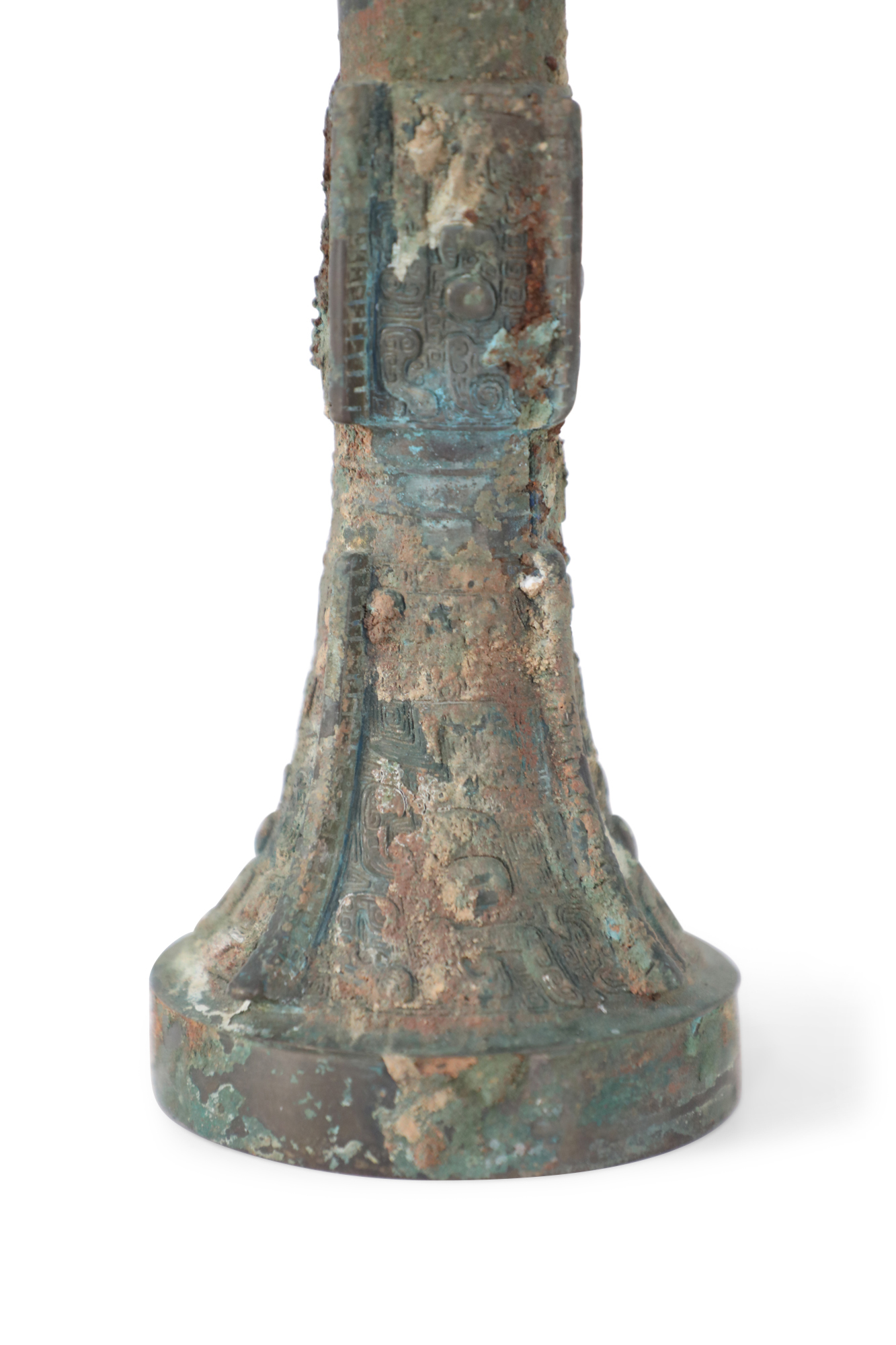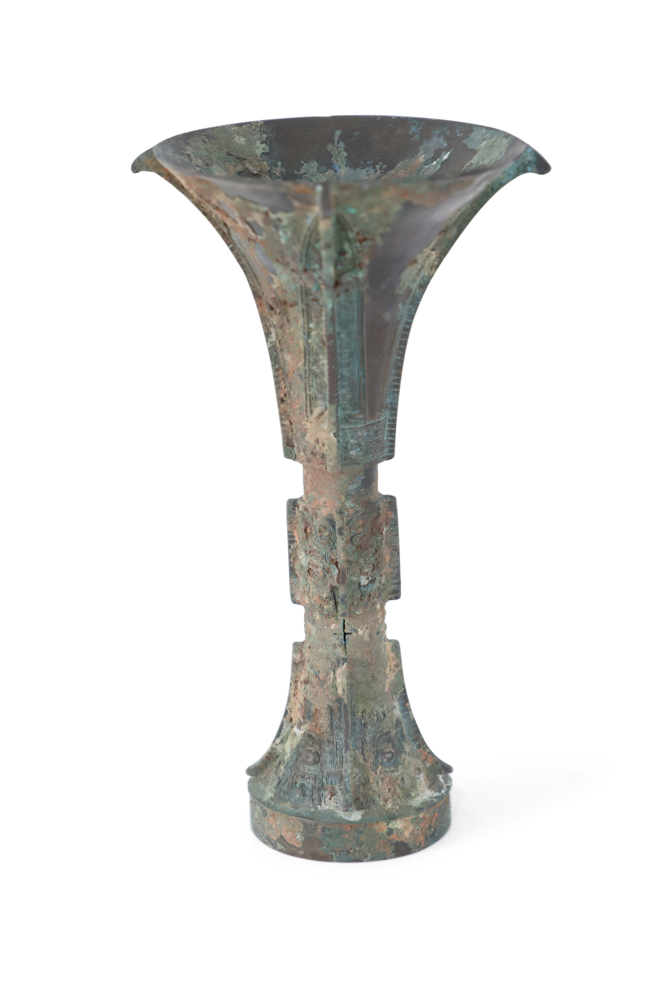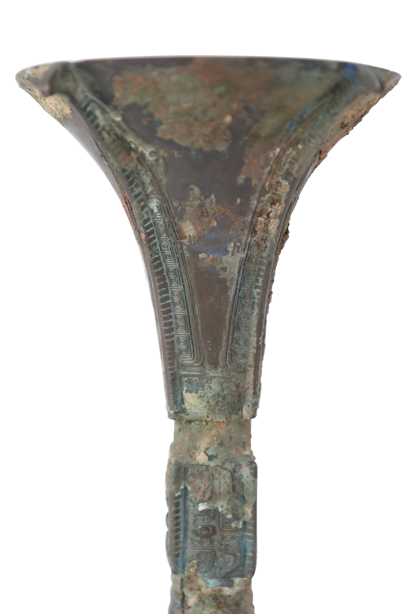 Antique Chinese Han Dynasty-style copy of a patinated bronze wine goblet with a fluted, conical form carved in intricate designs running up the surface, intercepted by two indented bands..