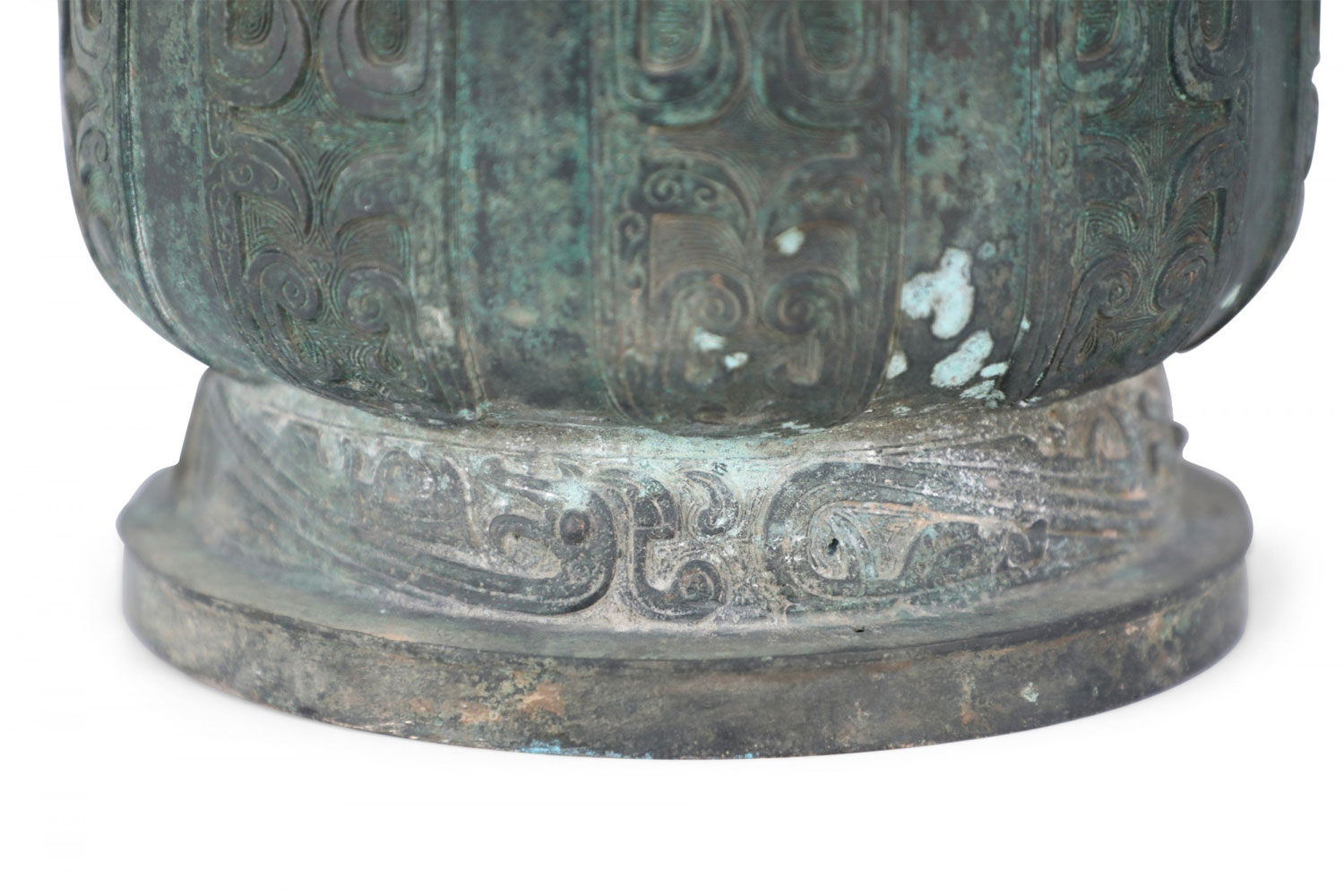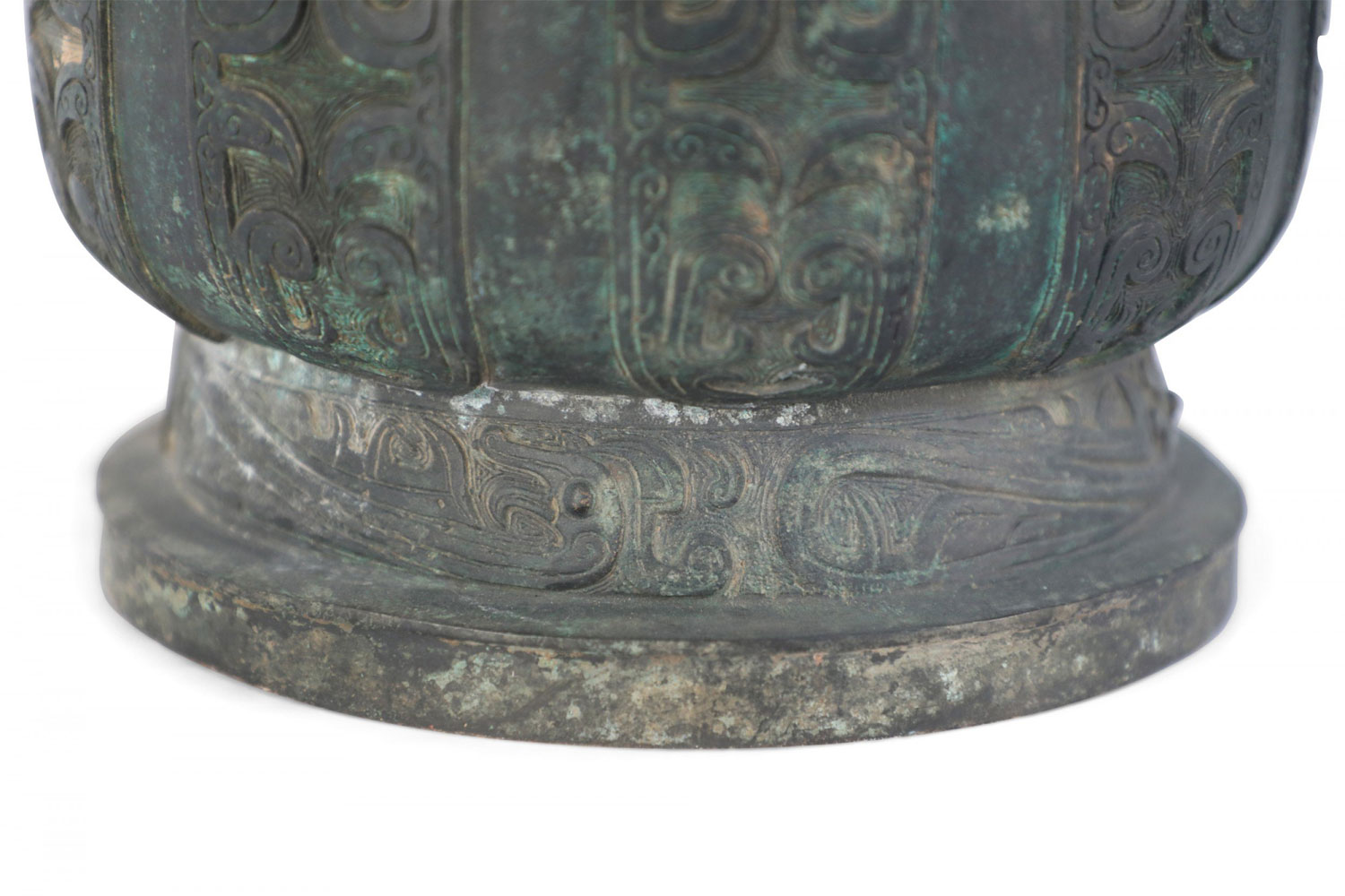 Antique Chinese Han Dynasty-style copy of a patinated bronze urn carved with raised geometric patterned bands wrapping its form, sitting atop a round foot, and fitted with two curved, upright handles..