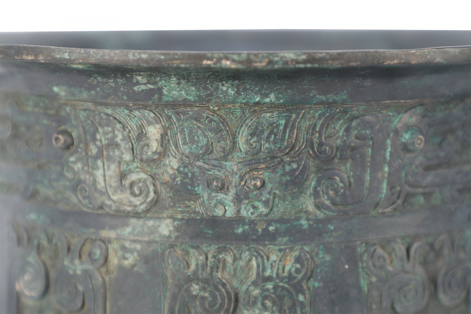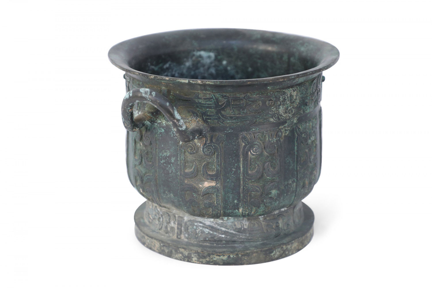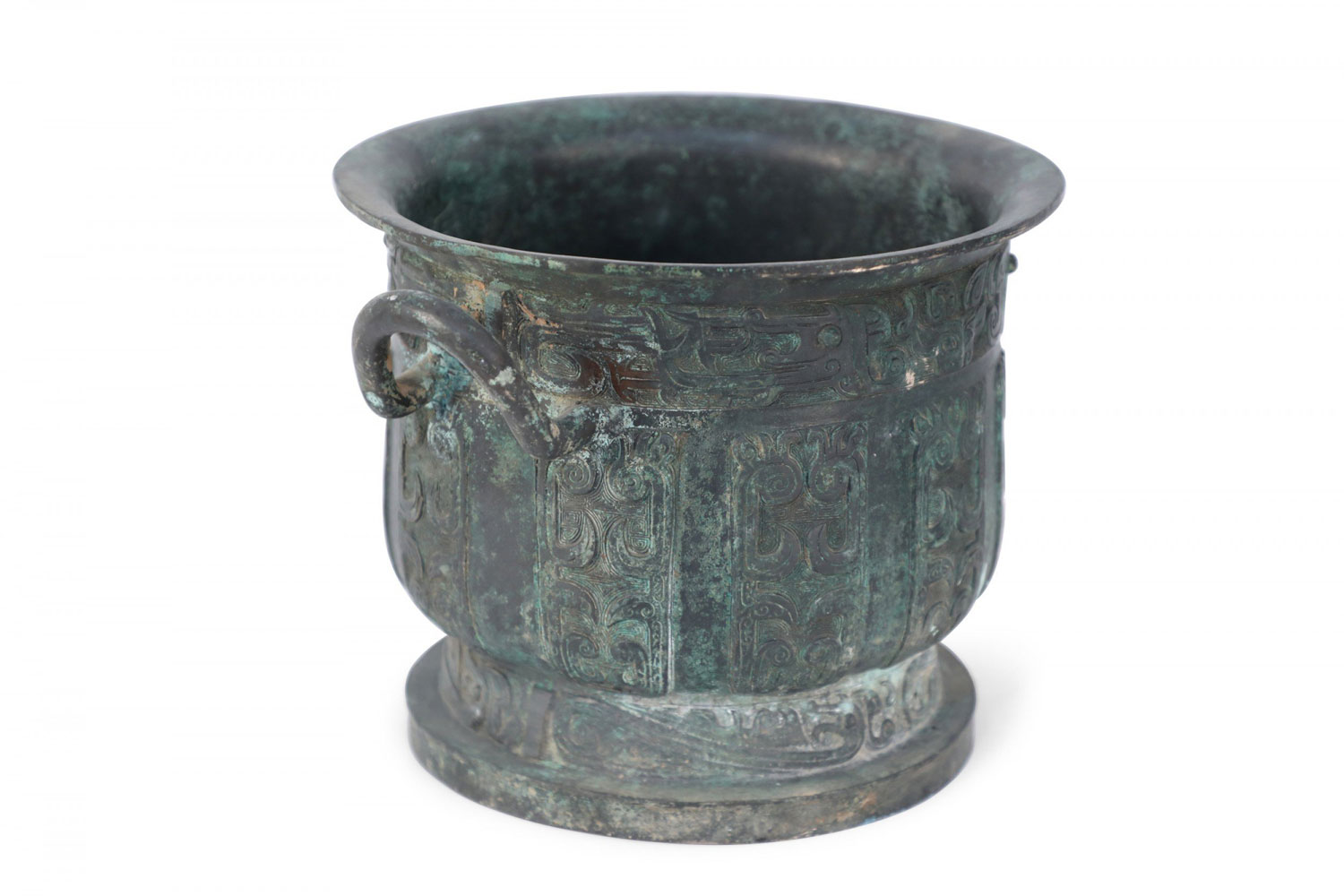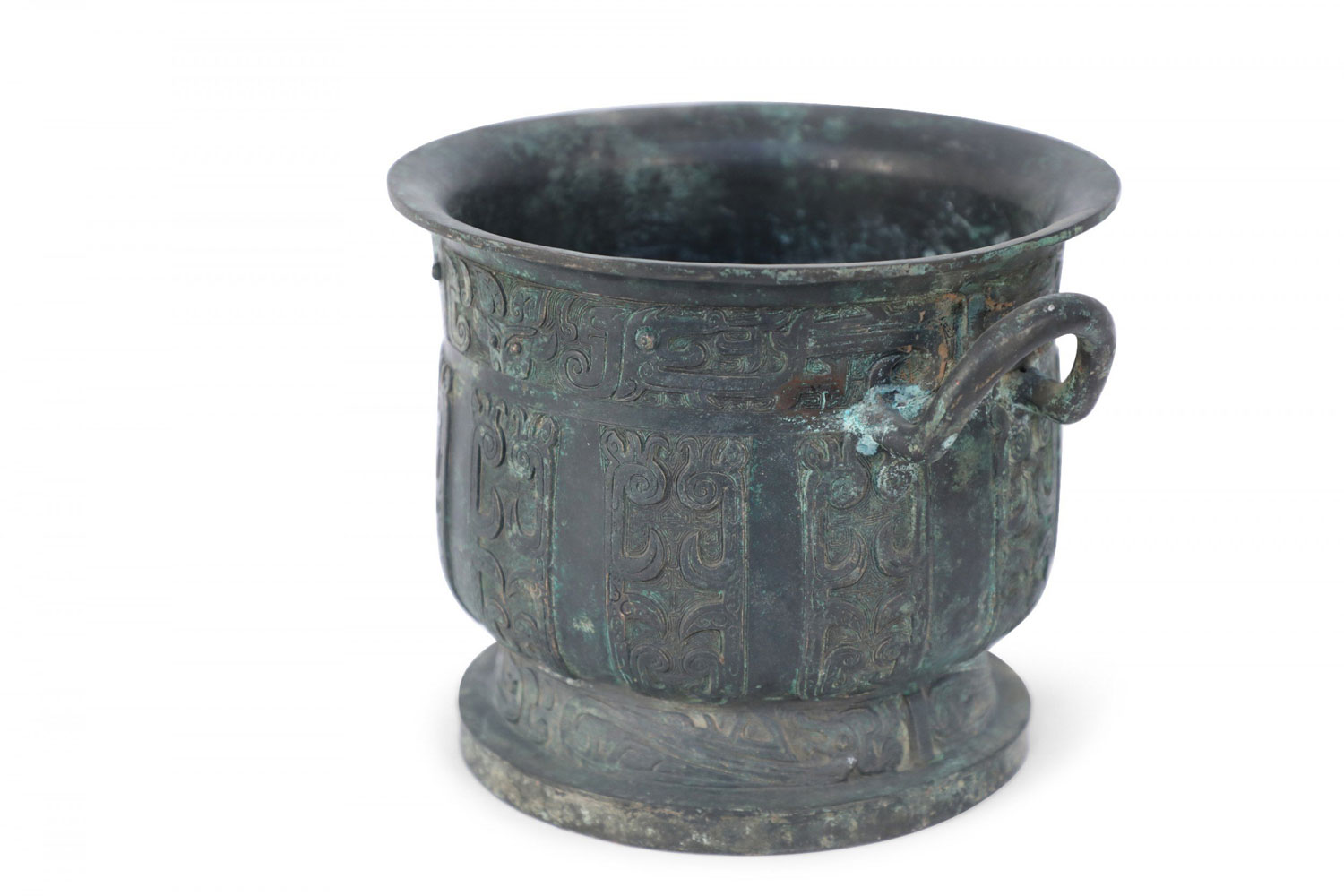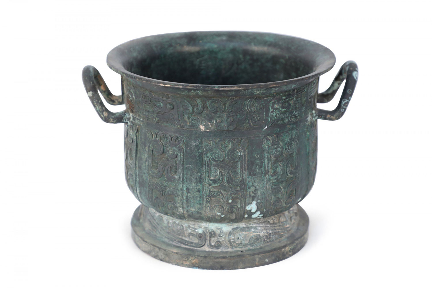 Antique Chinese Han Dynasty-style copy of a patinated bronze urn carved with raised geometric patterned bands wrapping its form, sitting atop a round foot, and fitted with two curved, upright handles.