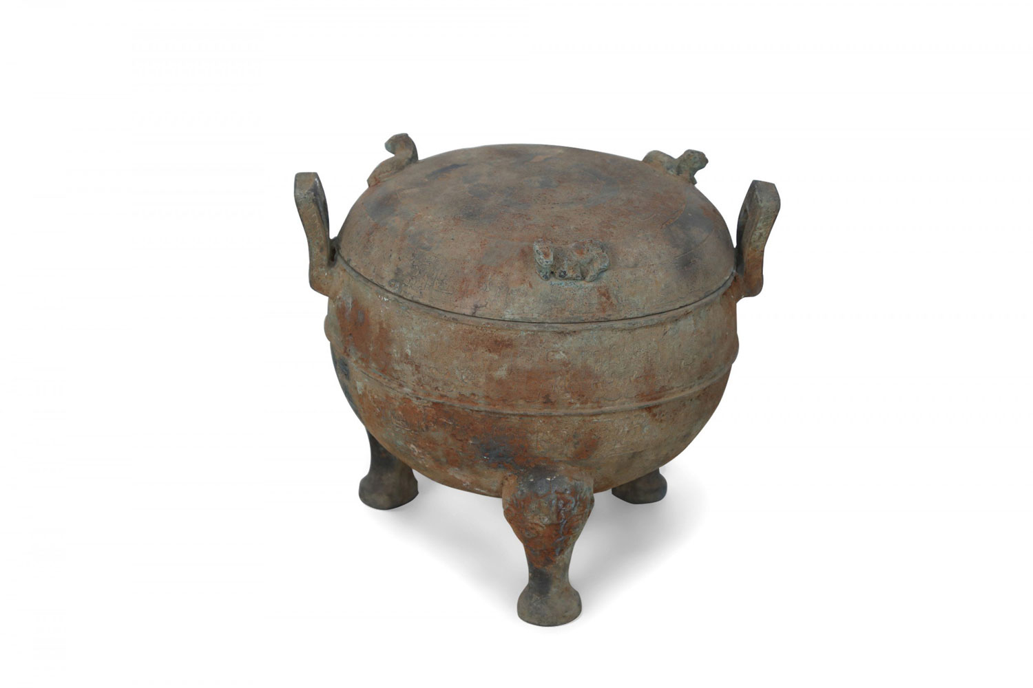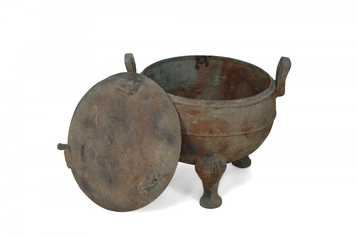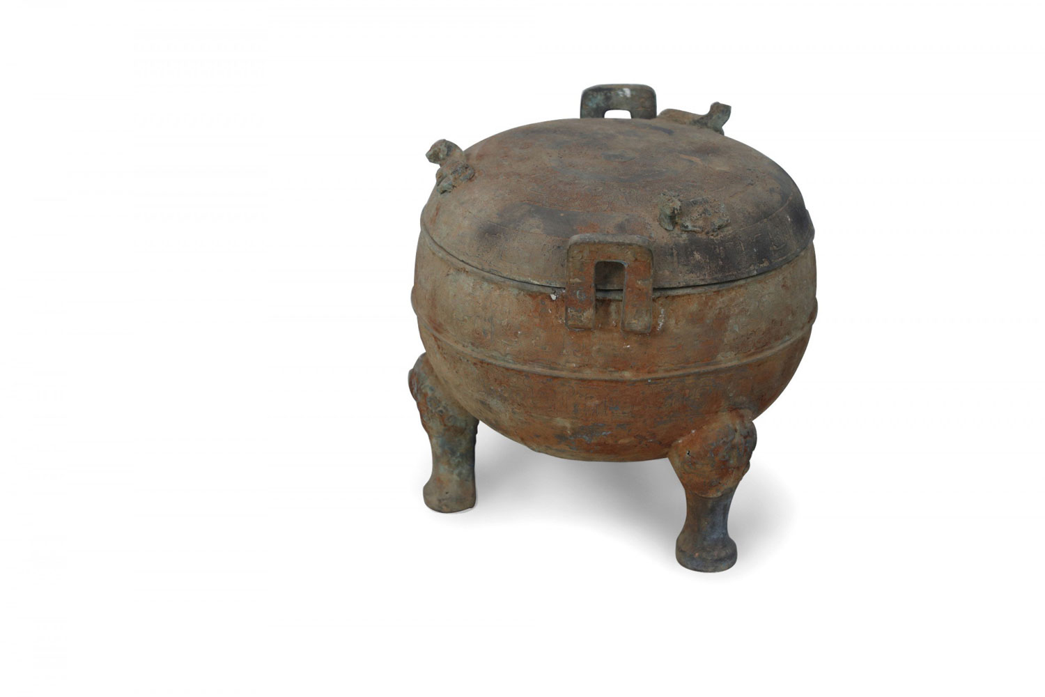 Chinese Han Dynasty Style Patinated Bronze Footed and Lidded Pot
