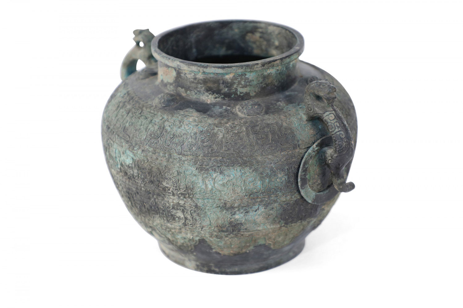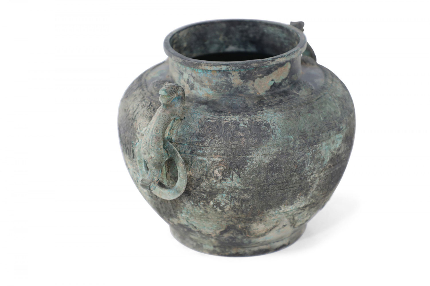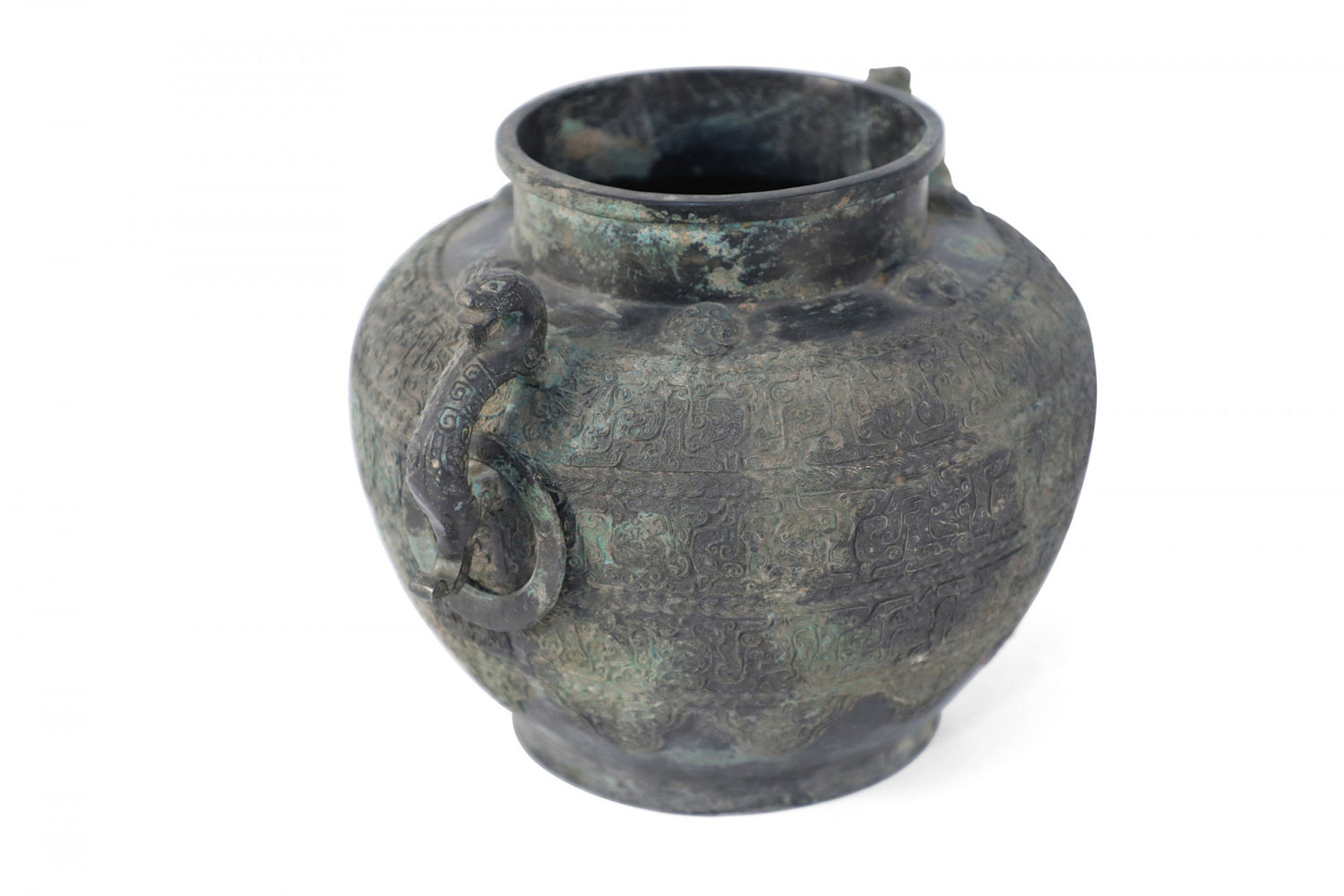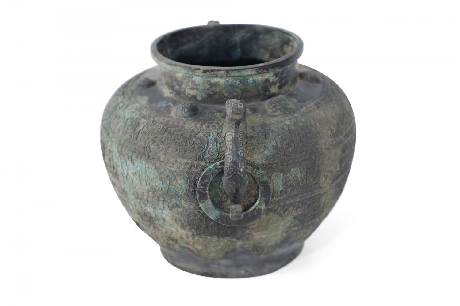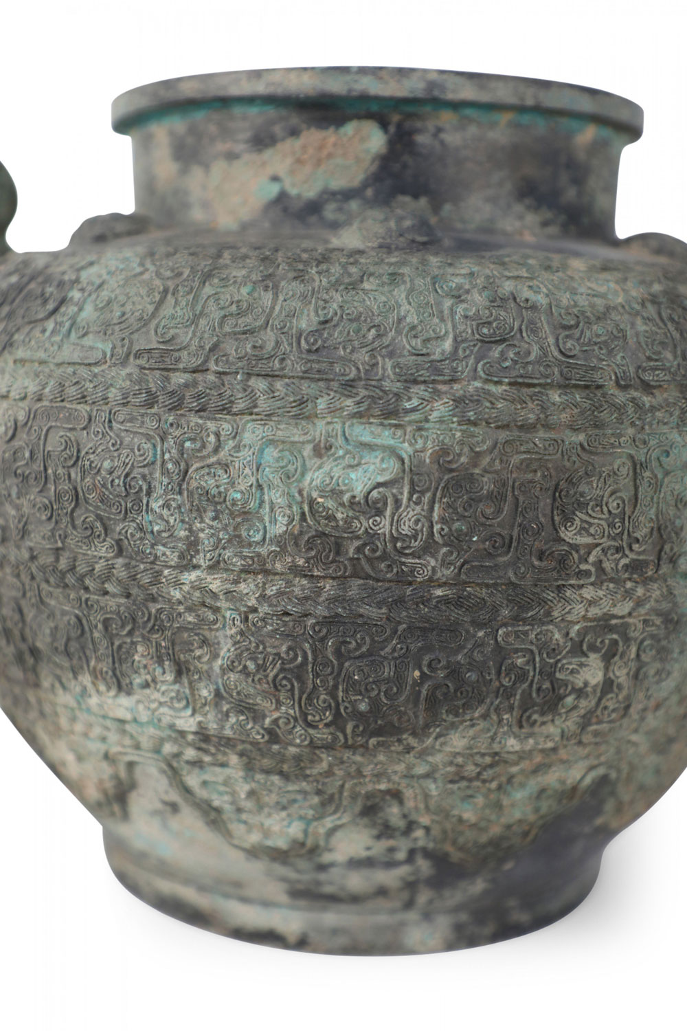 Antique Chinese Han Dynasty-style copy of a patinated bronze pot decorated with intricate raised pattern banding wrapping its form, two serpentine handles with hanging rings and a gray patina..