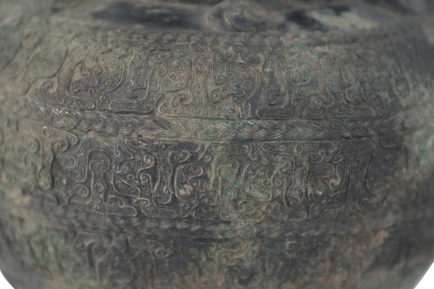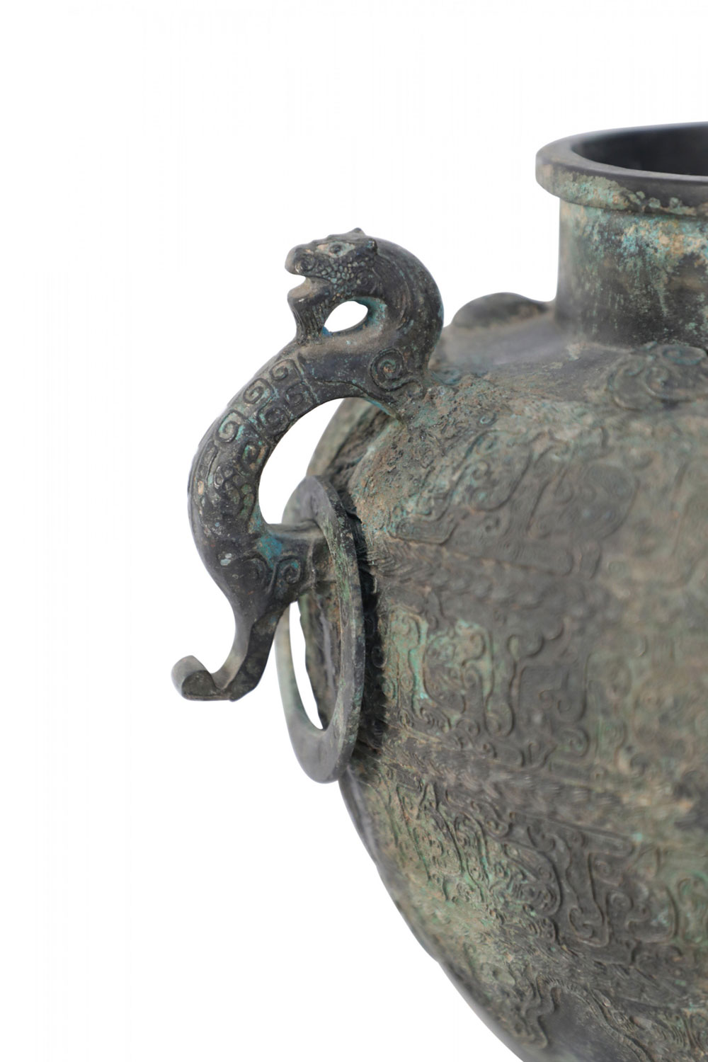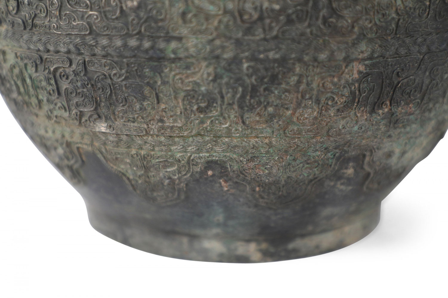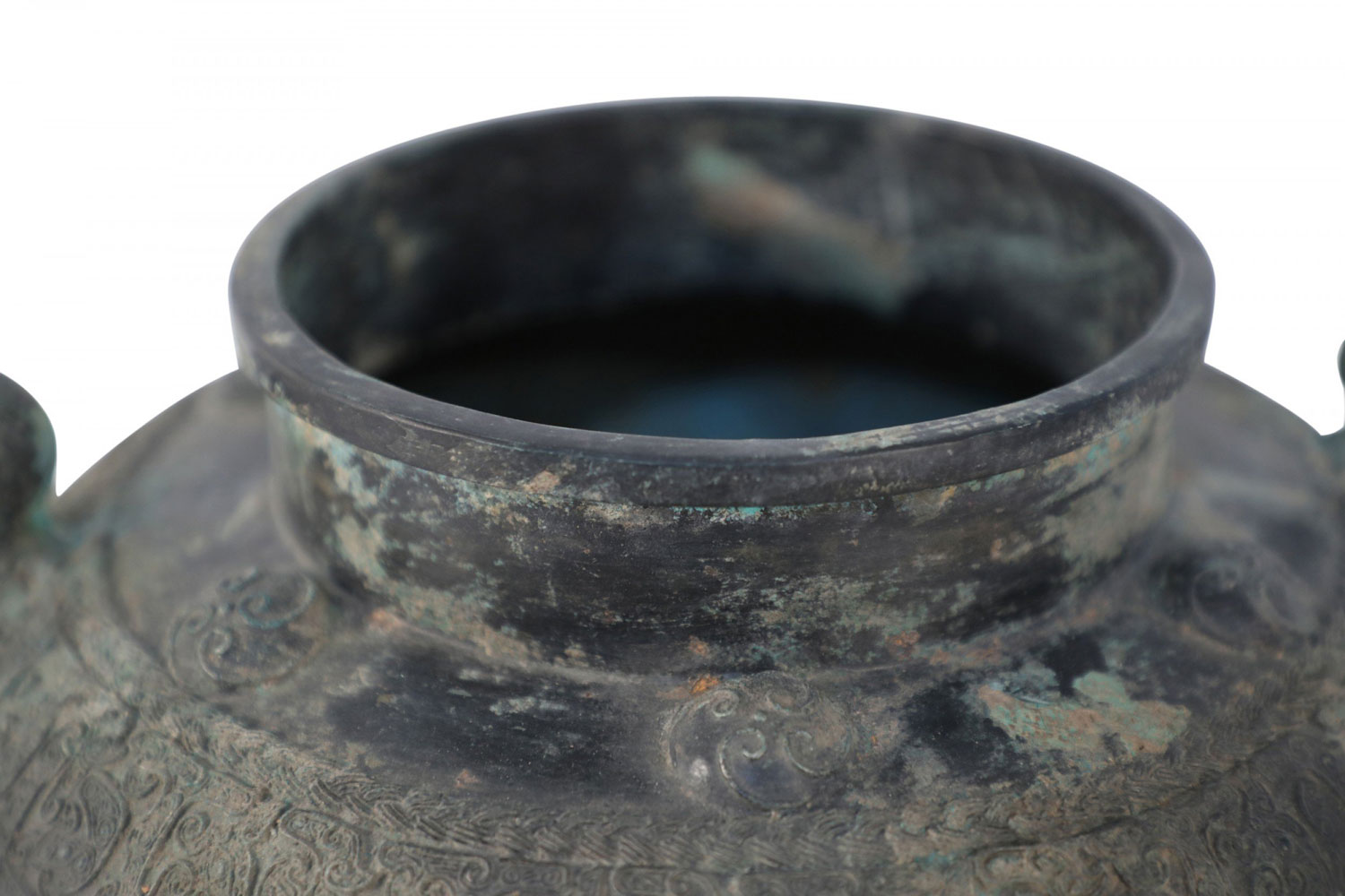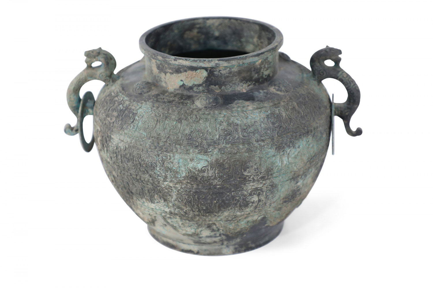 Antique Chinese Han Dynasty-style copy of a patinated bronze pot decorated with intricate raised pattern banding wrapping its form, two serpentine handles with hanging rings and a gray patina..