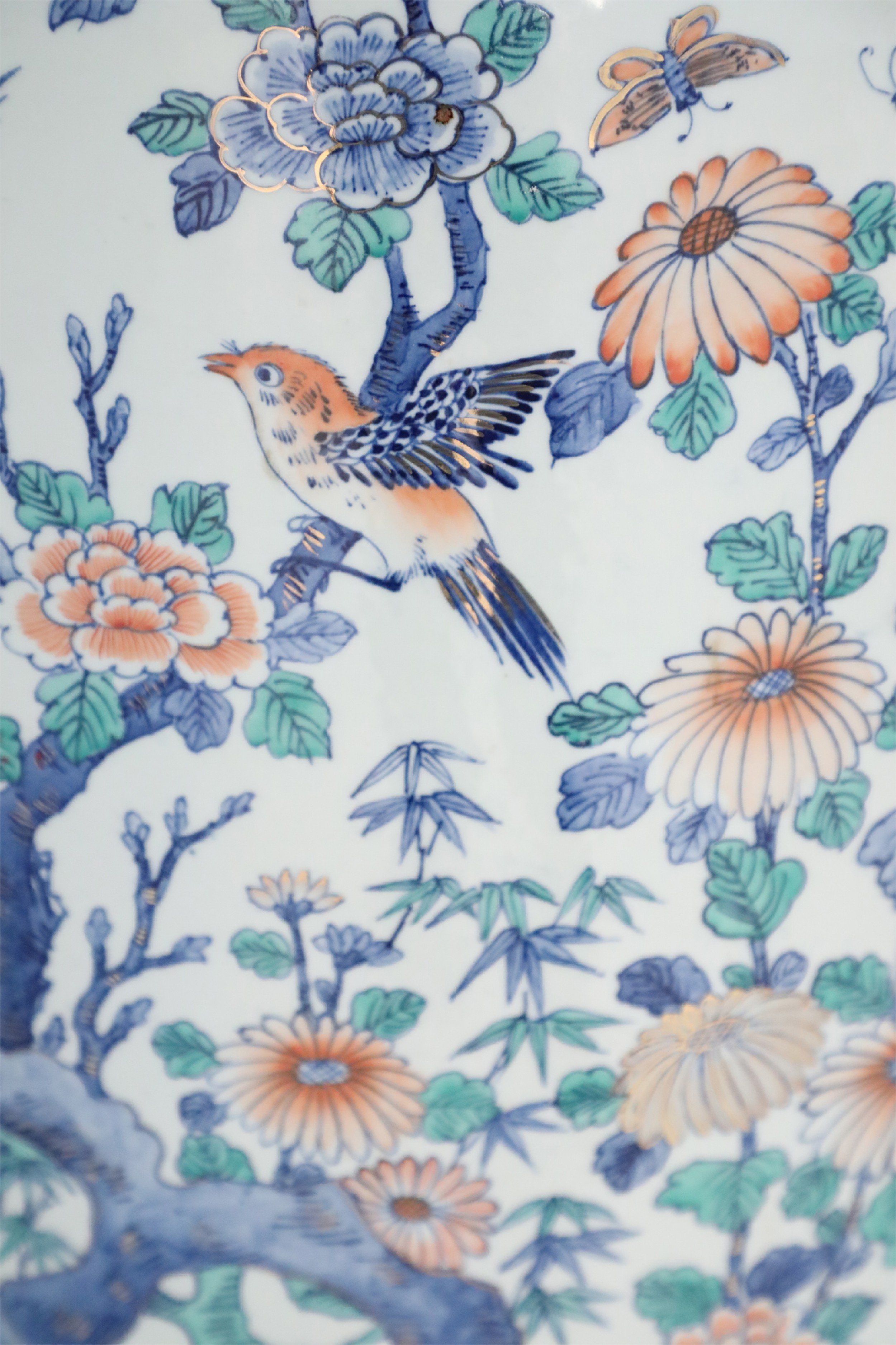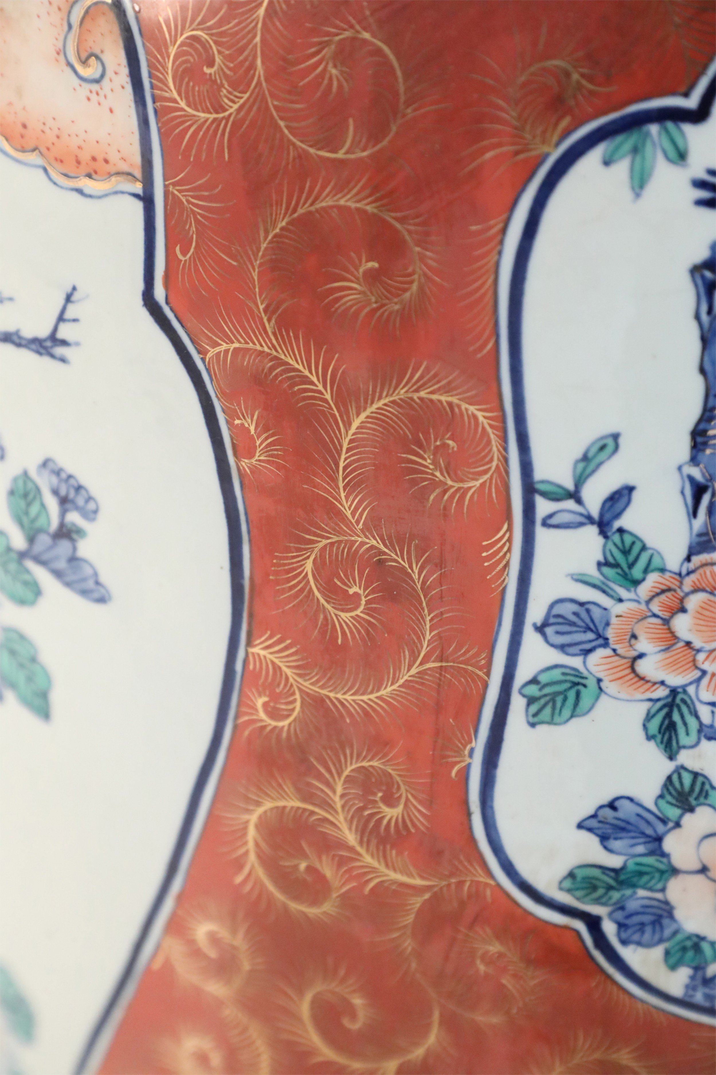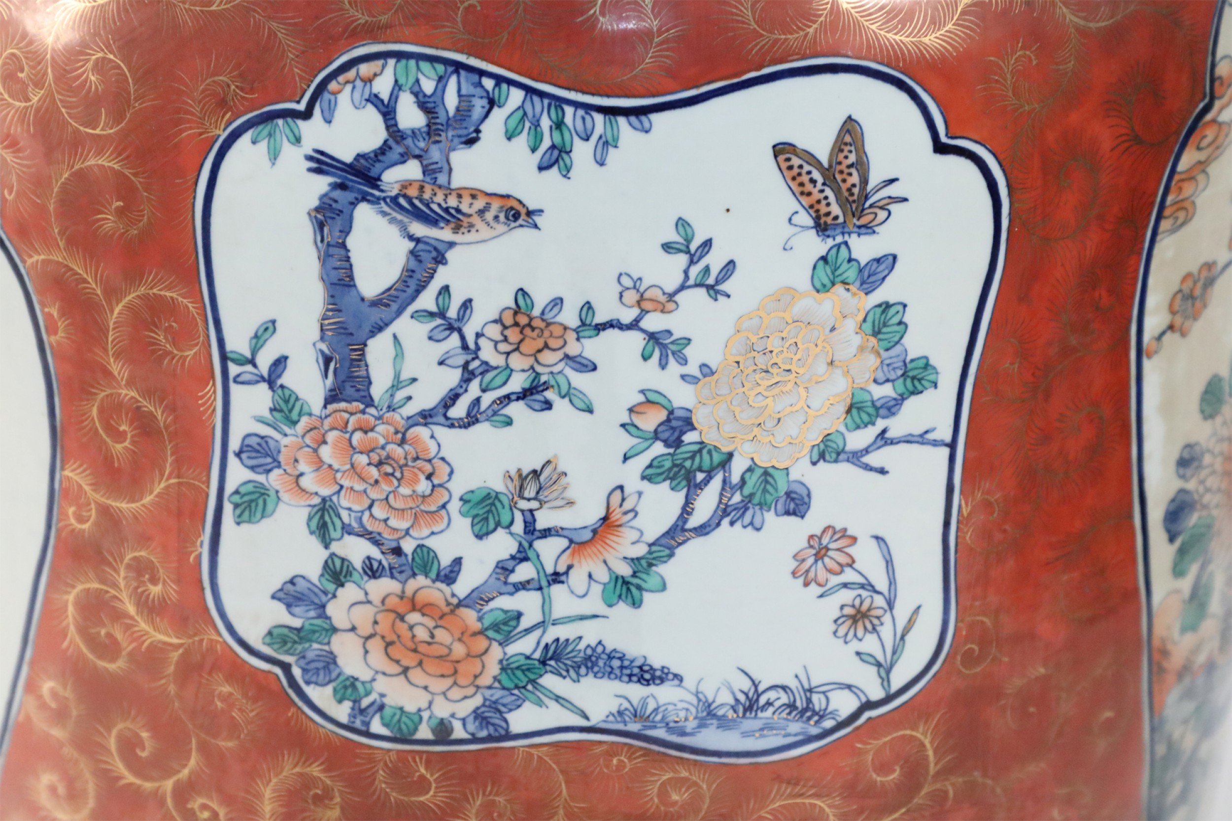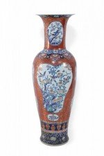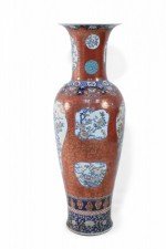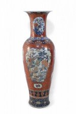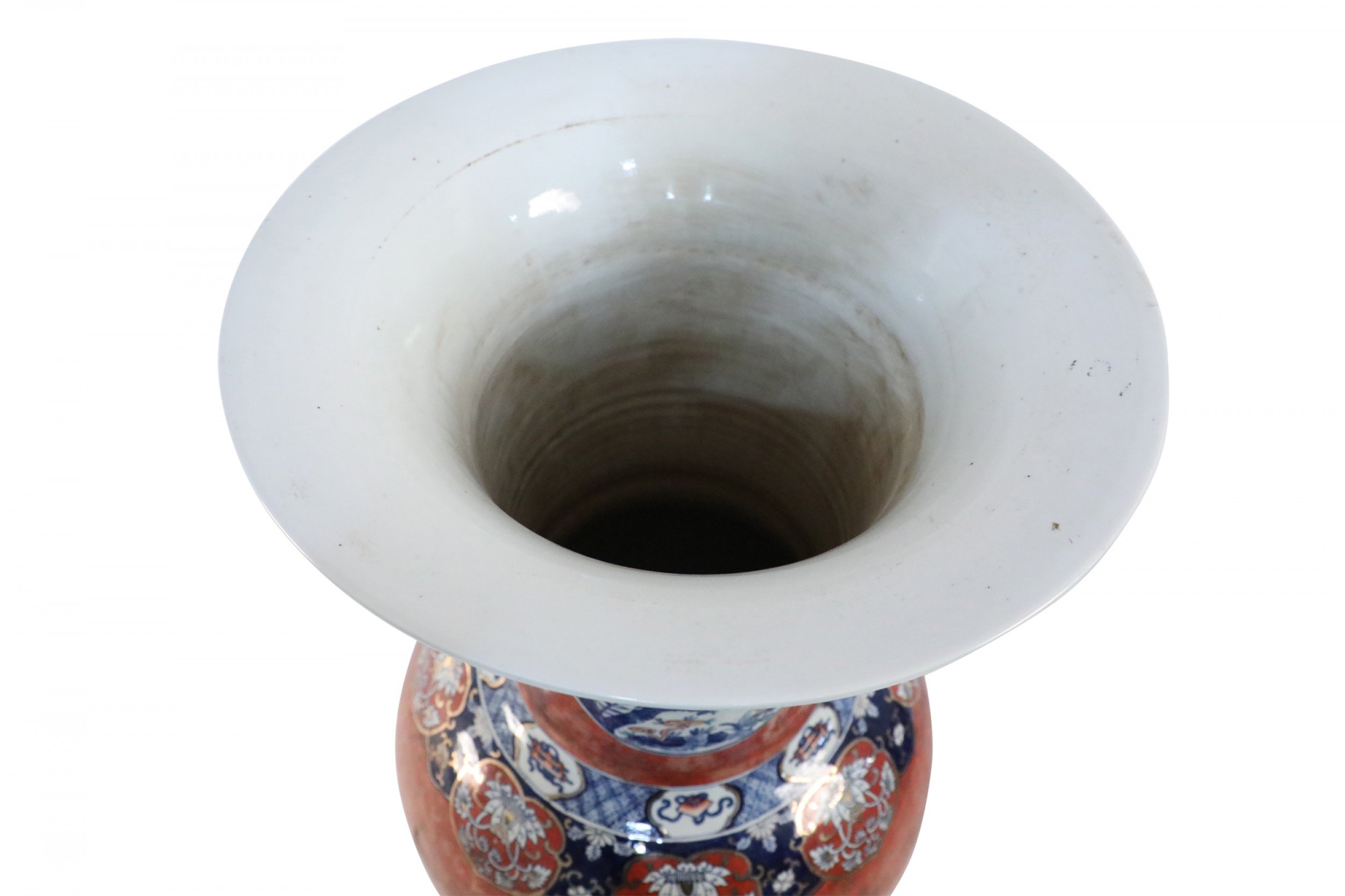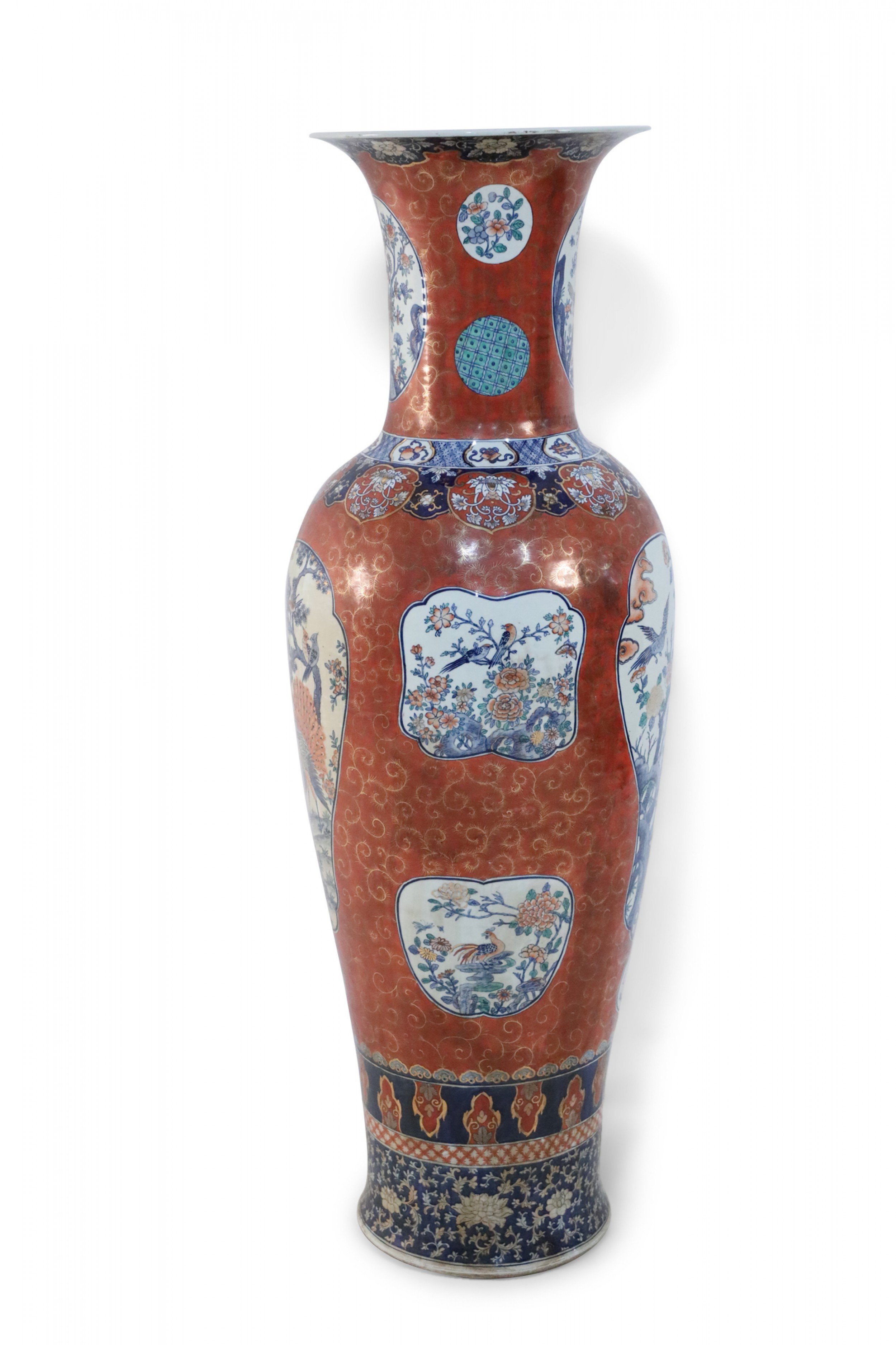 Chinese orange, white and blue monumental floor vase celebrating Japanese Imari ware in both palette and design, decorated with medallions of blooming florals and birds.