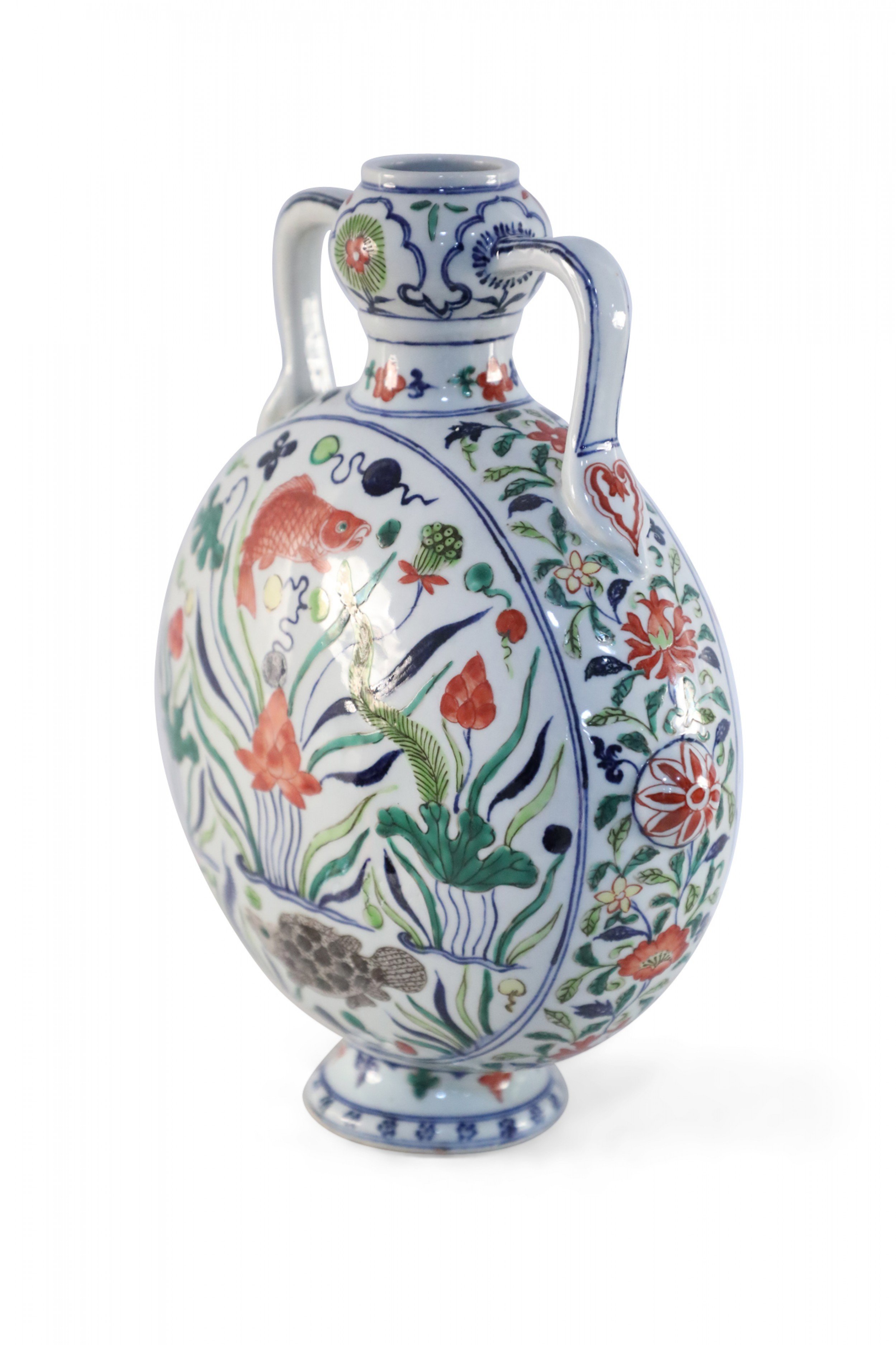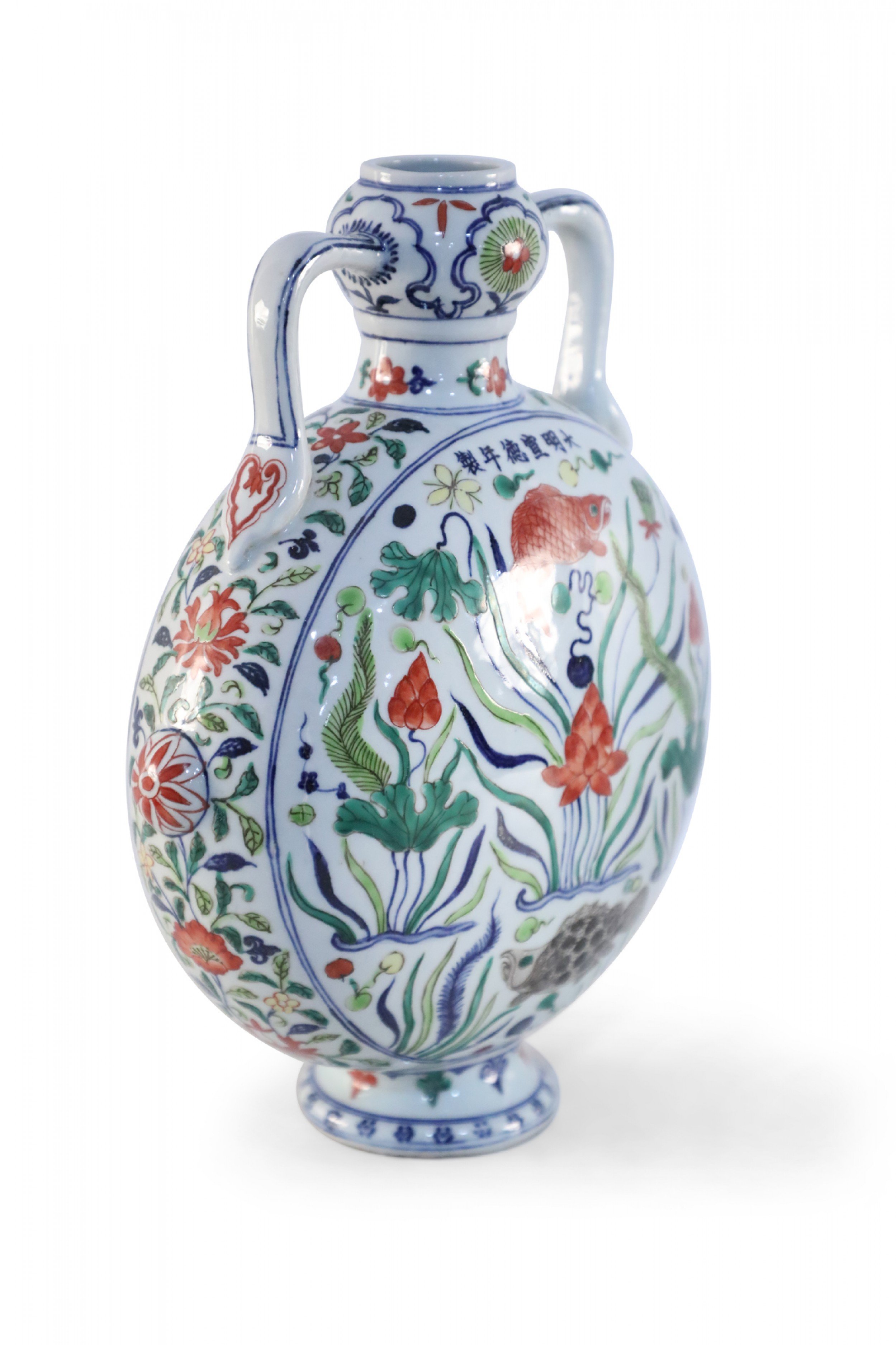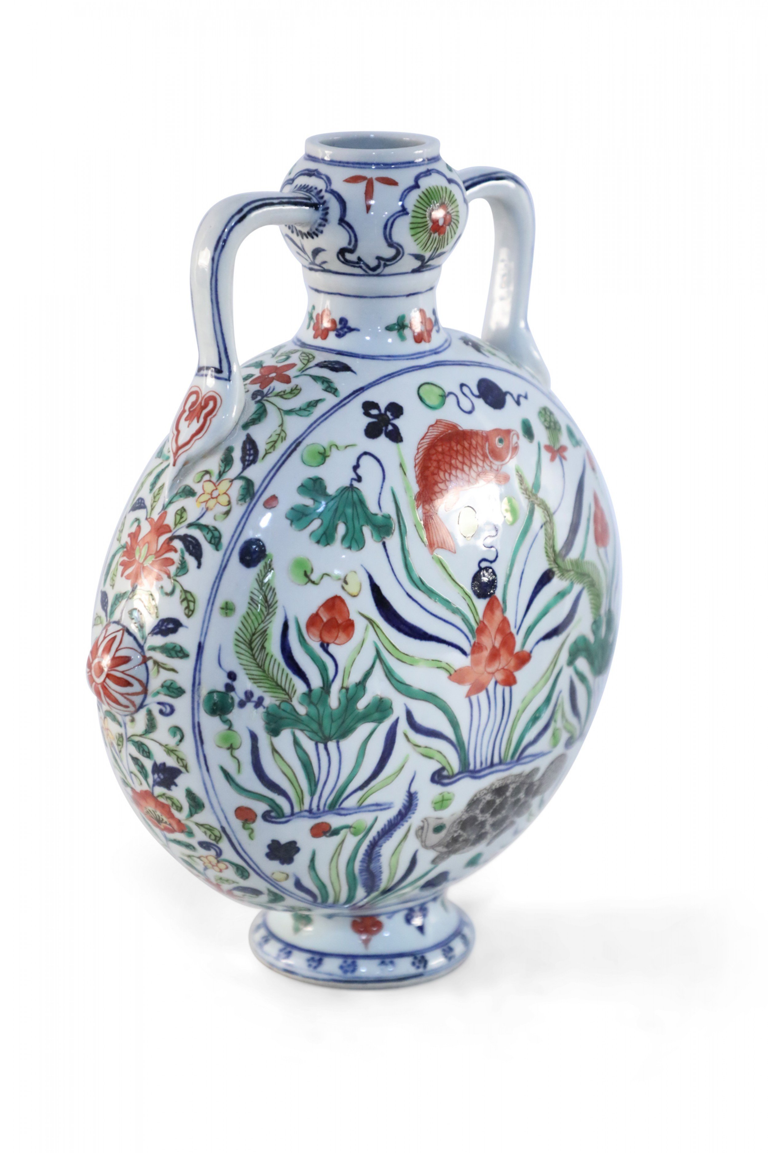 Antique Chinese (early 20th Century) white porcelain moon flask vase decorated with an underwater scene of seaweed, koi and turtles surrounded by flowers and topped with two handles.