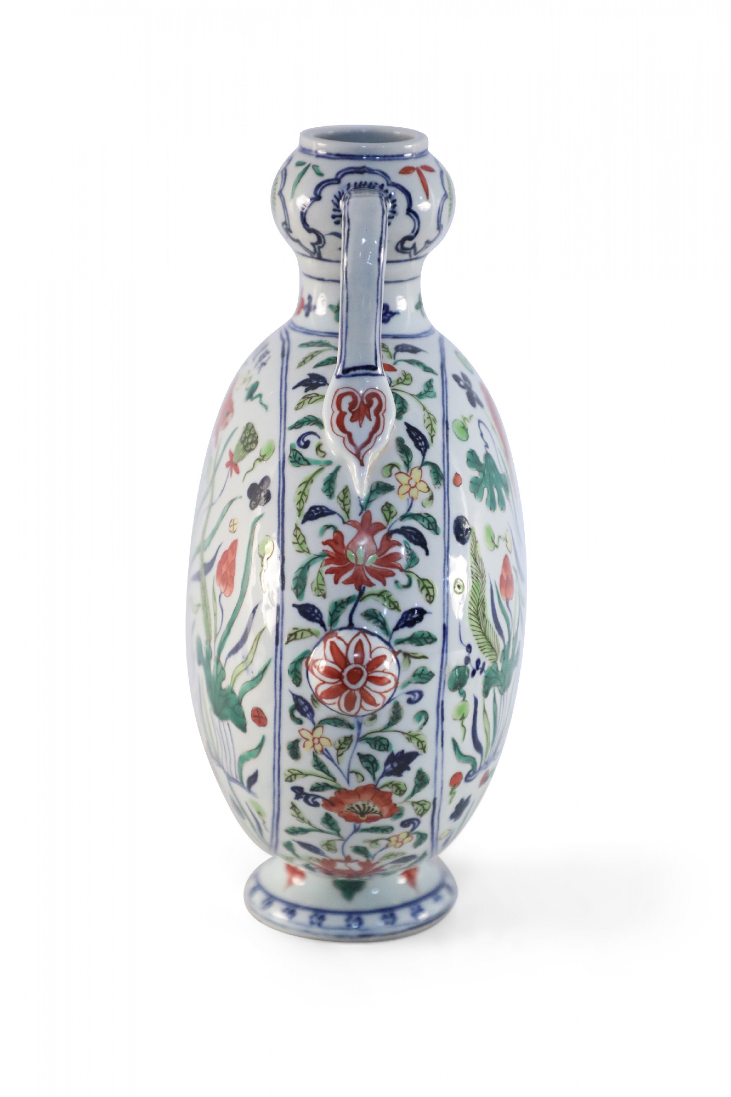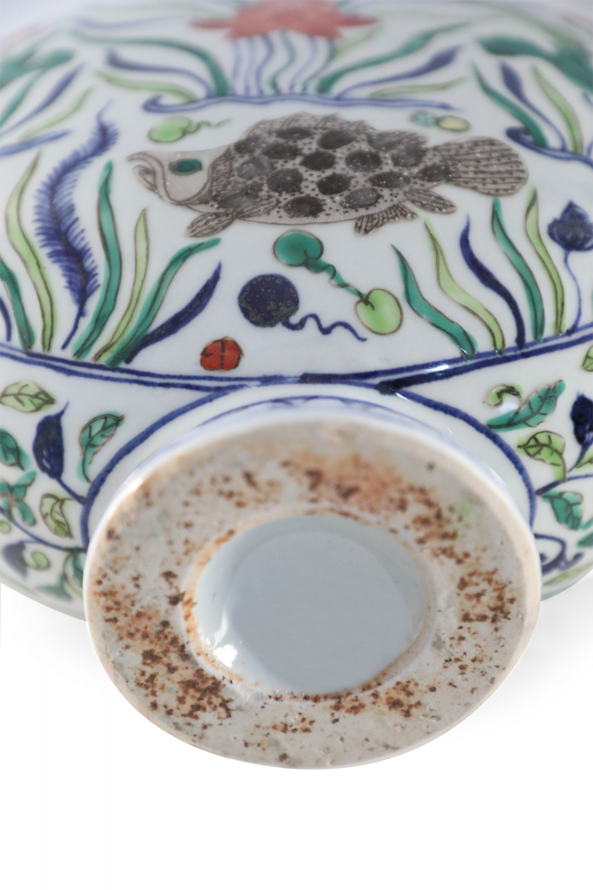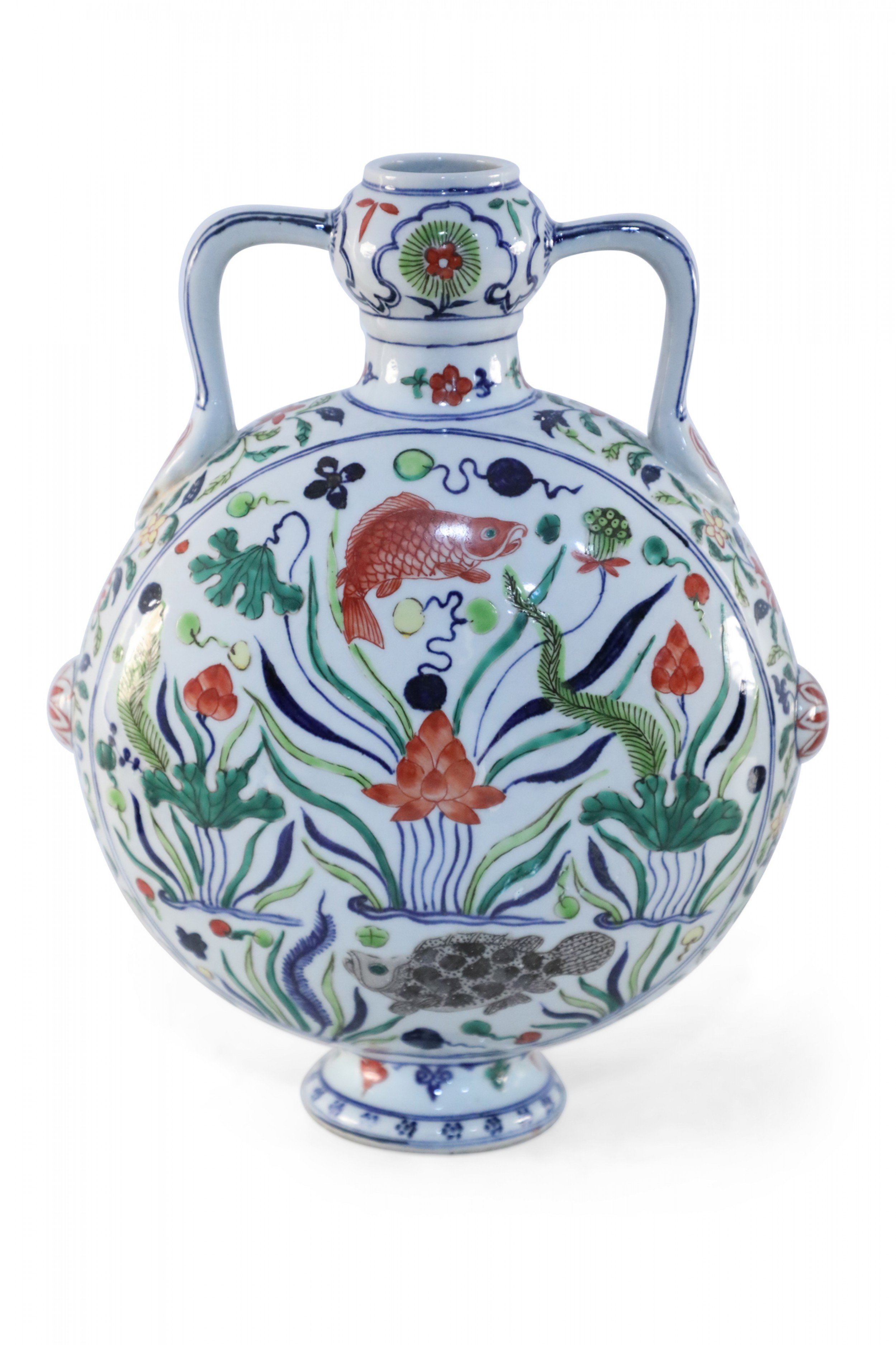 Antique Chinese (early 20th Century) white porcelain moon flask vase decorated with an underwater scene of seaweed, koi and turtles surrounded by flowers and topped with two handles.