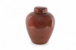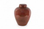 Chinese porcelain lidded ginger jar in a finish that shifts within a range of umber, red and maroon, adding dimension to its shape..