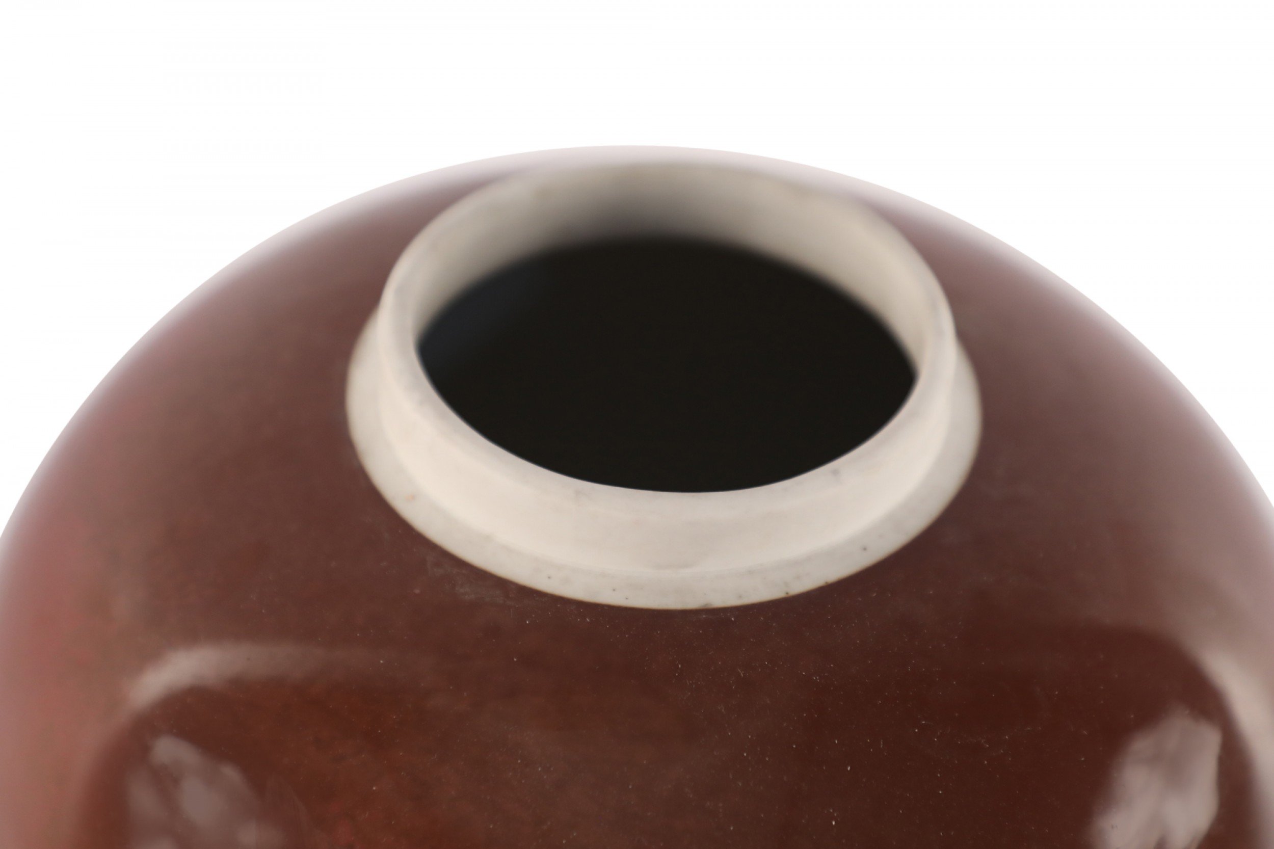 Chinese porcelain lidded ginger jar in a finish that shifts within a range of umber, red and maroon, adding dimension to its shape.