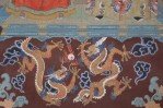 Set of 3 Ming King and Queen scroll wall hangings, shown seated with a paneled wall behind them and a brown rug with dragons underneath against a pale gold silk shantung background with tonal flowers and scroll designs with a sage green top and bottom. (PRICED EACH).