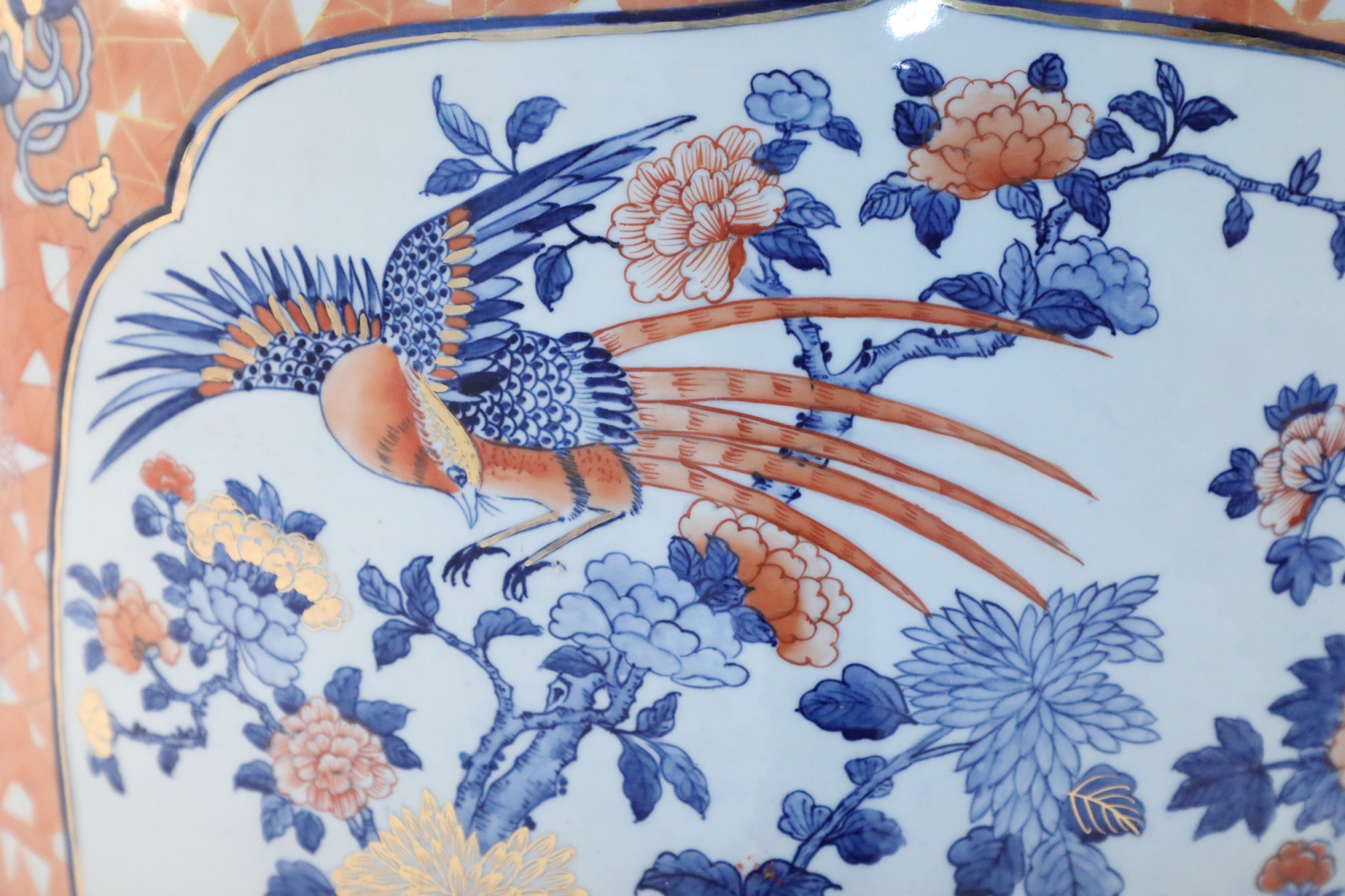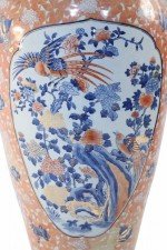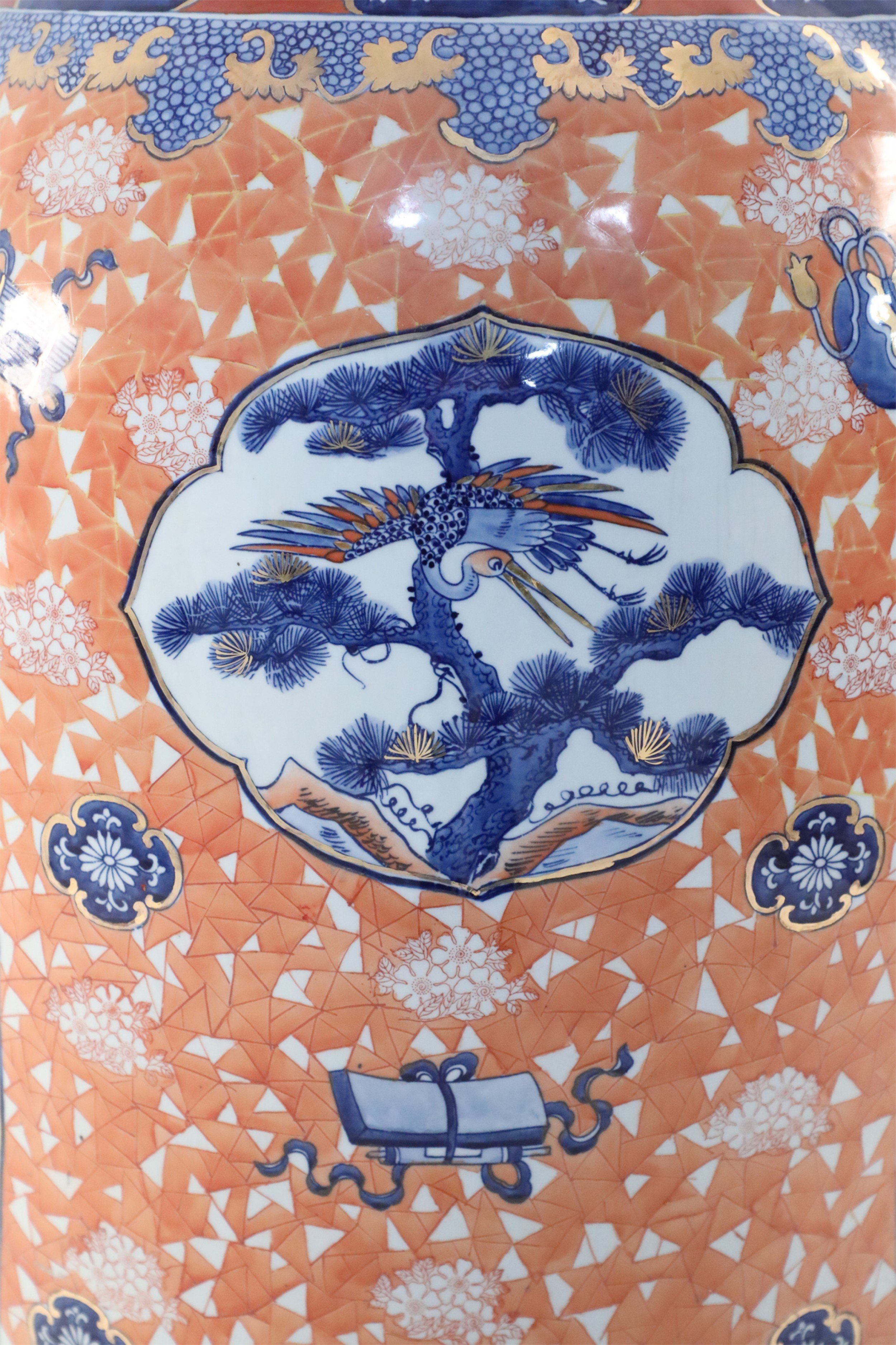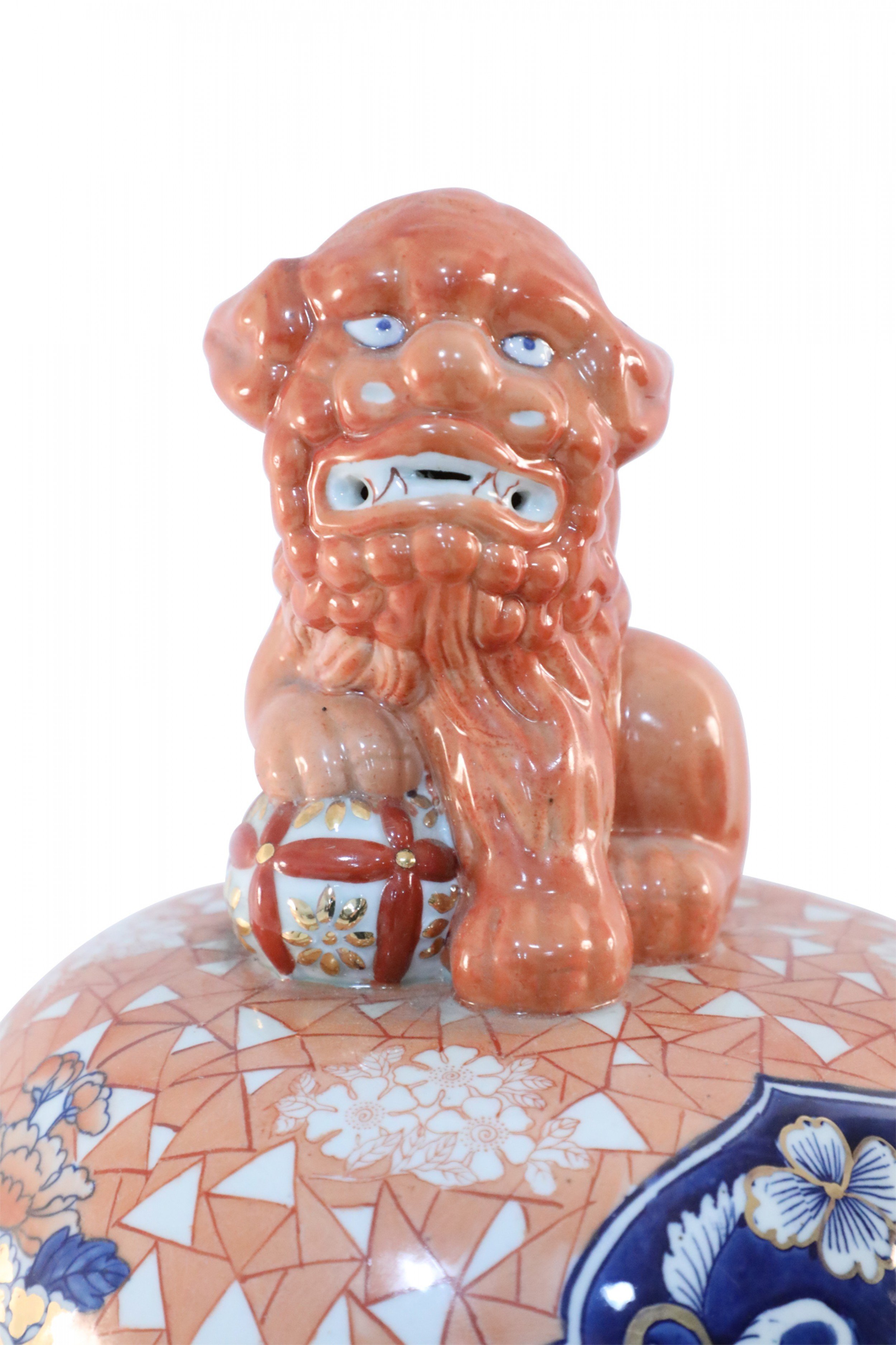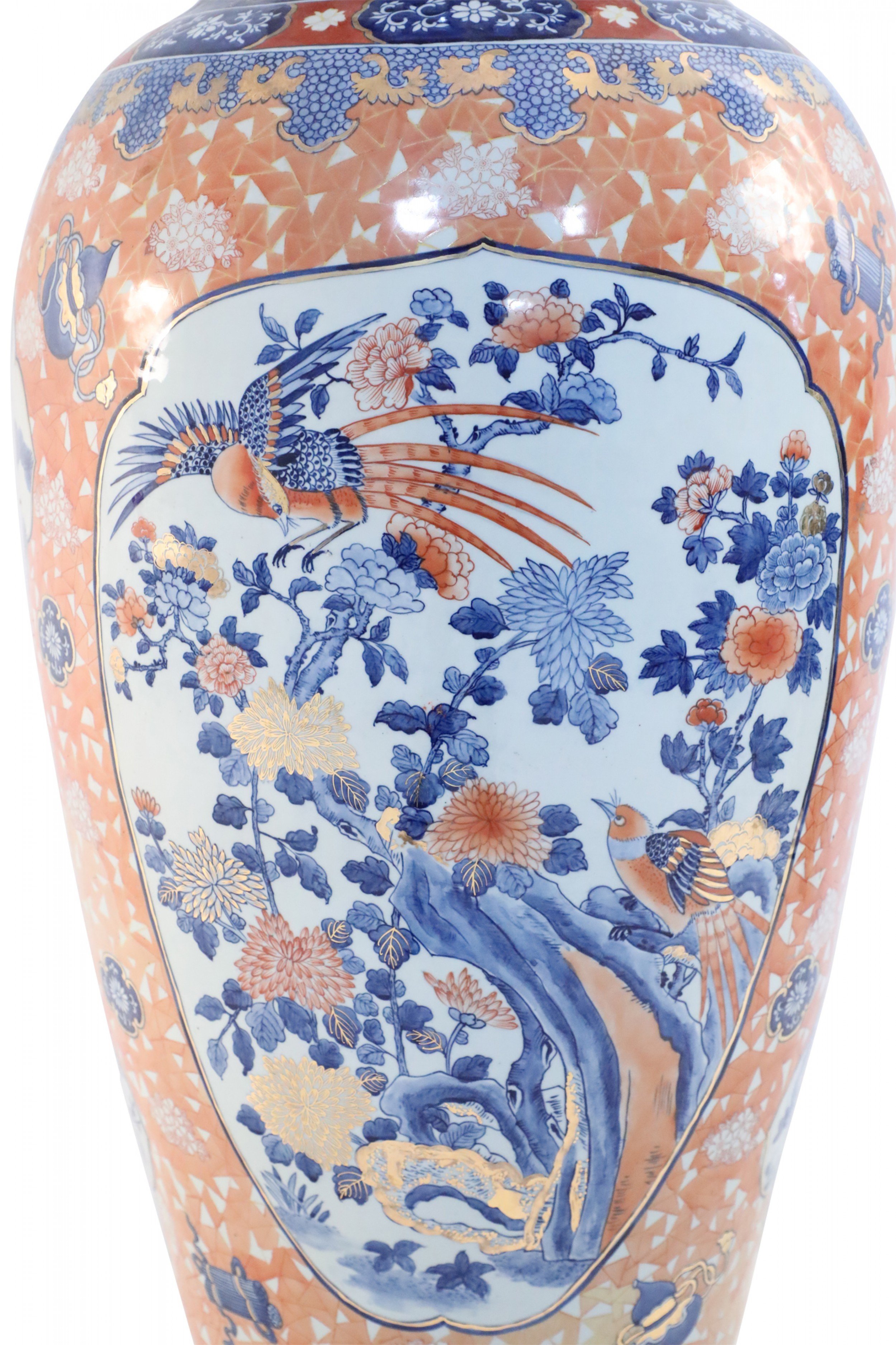 Chinese monumental, lidded porcelain floor vase celebrating Japanese Imari ware in both palette and design, featuring natural scenes of birds and flowering trees set against a light-orange, geometric-patterned background, and topped with a foo dog-finial lid.