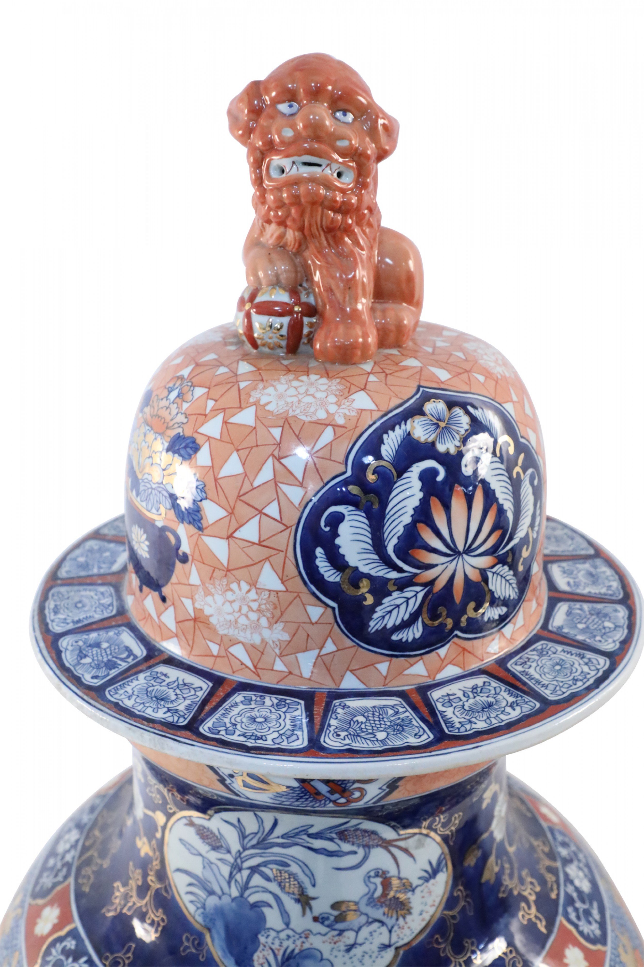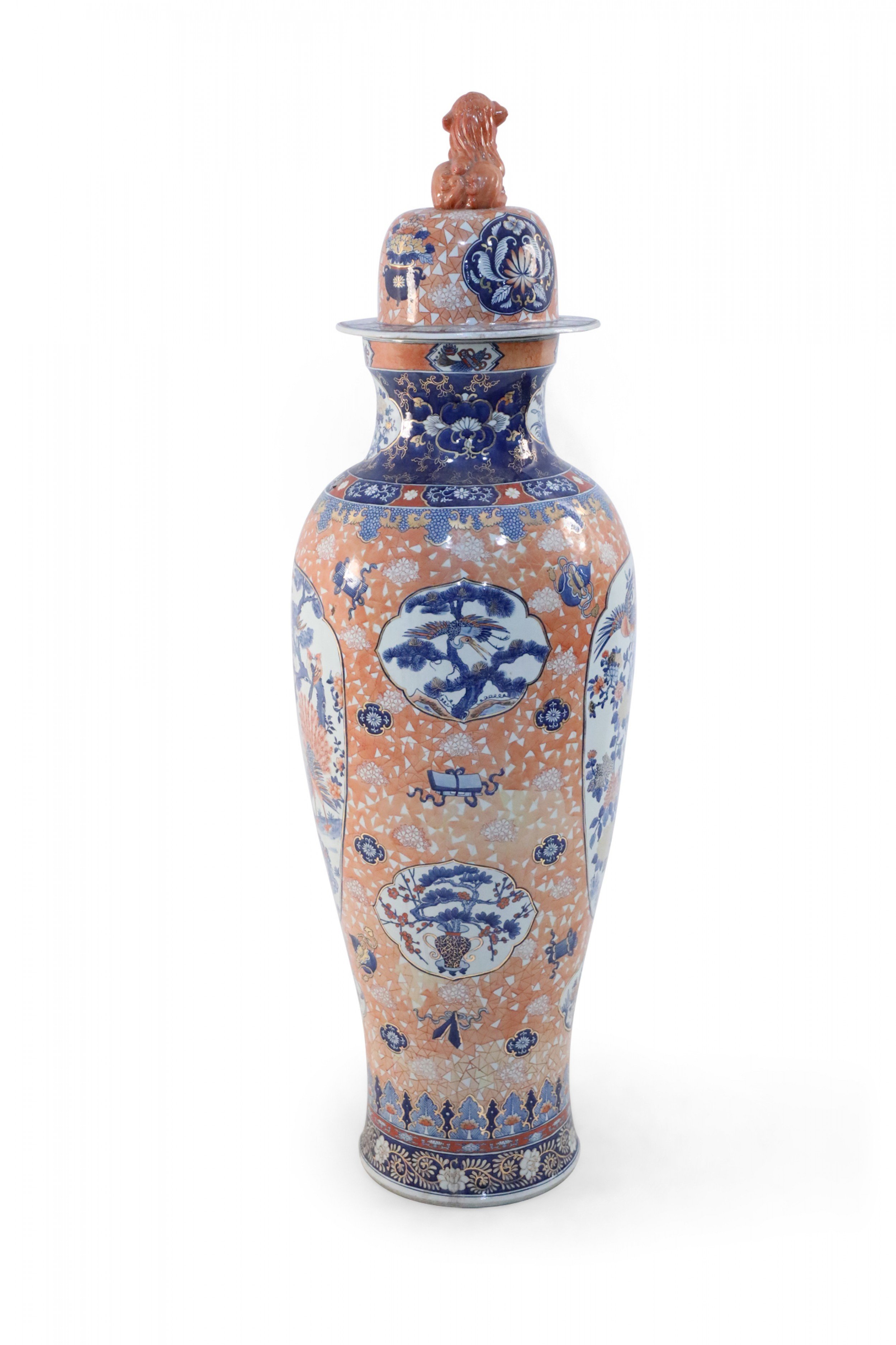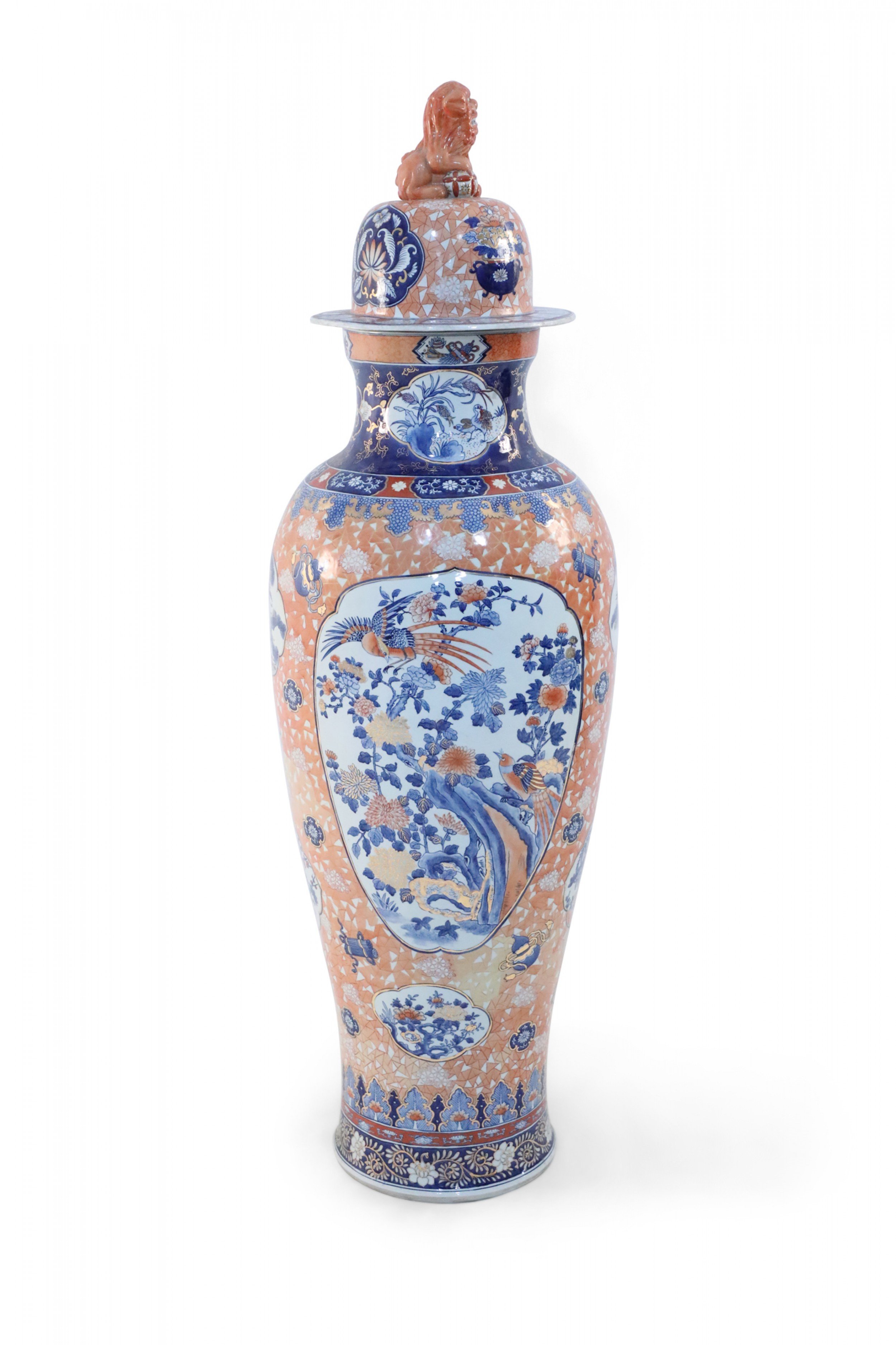 Chinese monumental, lidded porcelain floor vase celebrating Japanese Imari ware in both palette and design, featuring natural scenes of birds and flowering trees set against a light-orange, geometric-patterned background, and topped with a foo dog-finial lid..