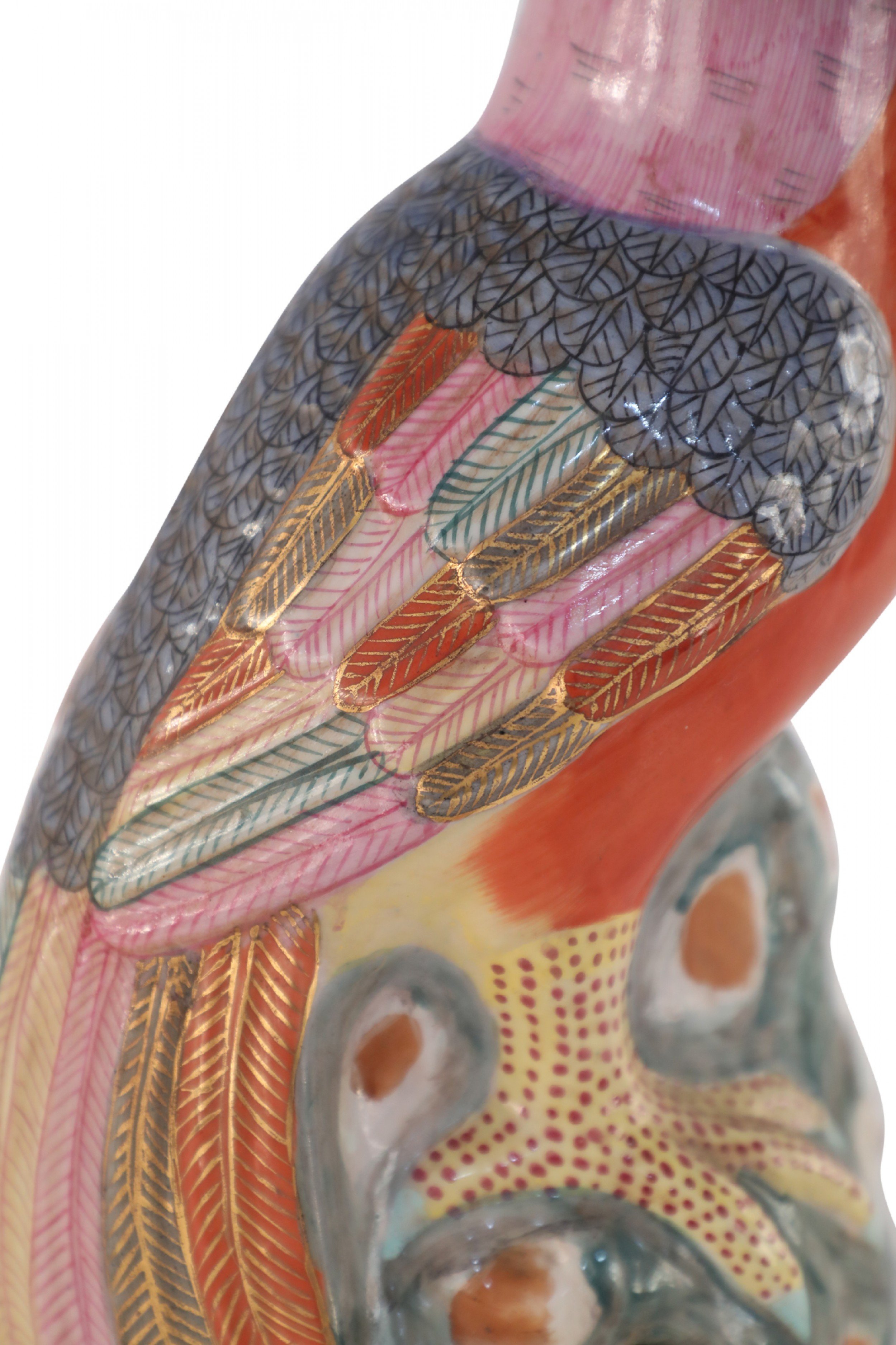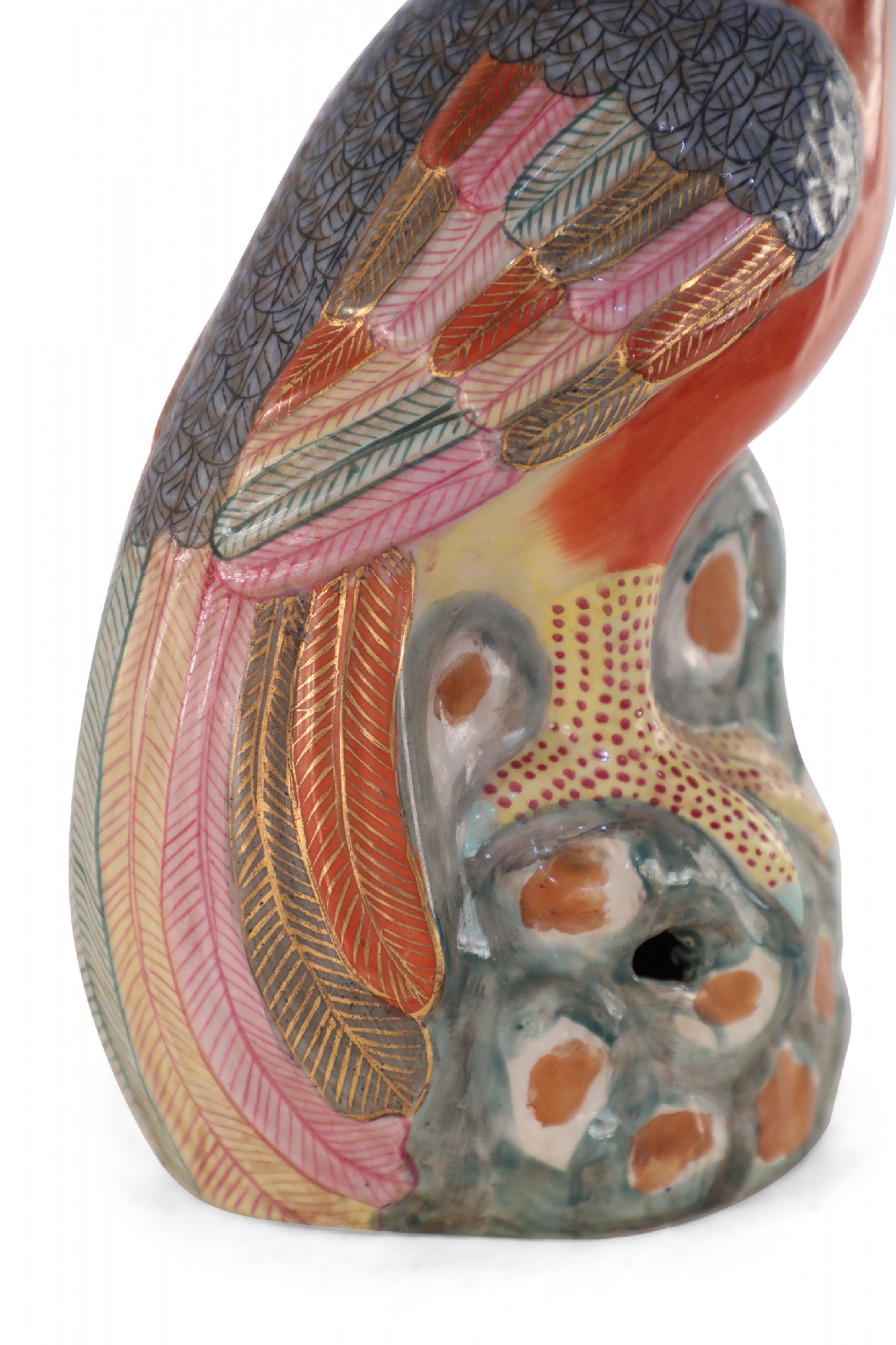Antique Chinese (Mid 20th Century) glazed porcelain statue of a pheasant with colorful, gold-outlined plumes perched on a rocky formation of green and brown. (Smaller version available: NWL2187)