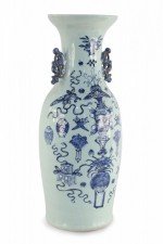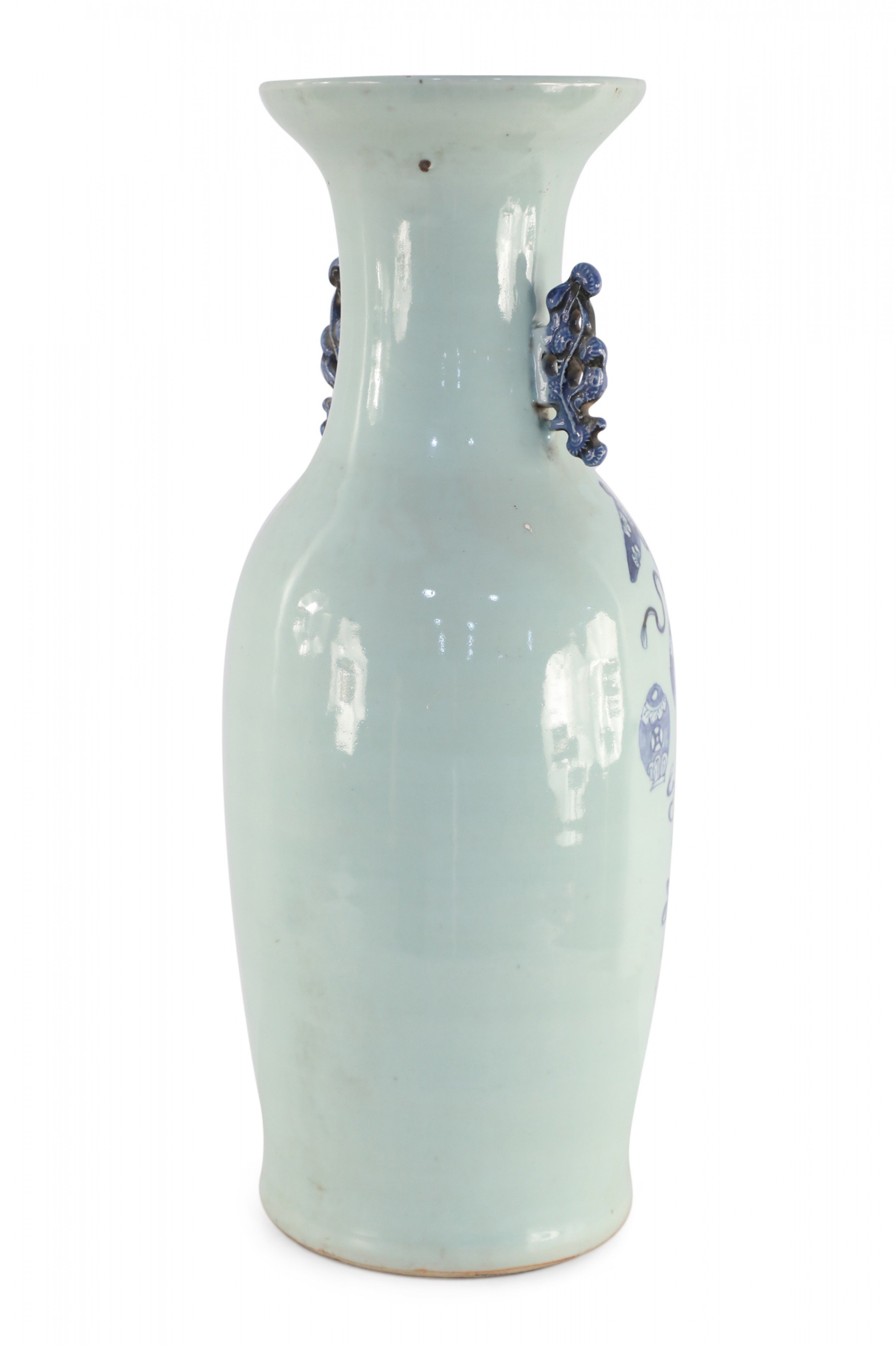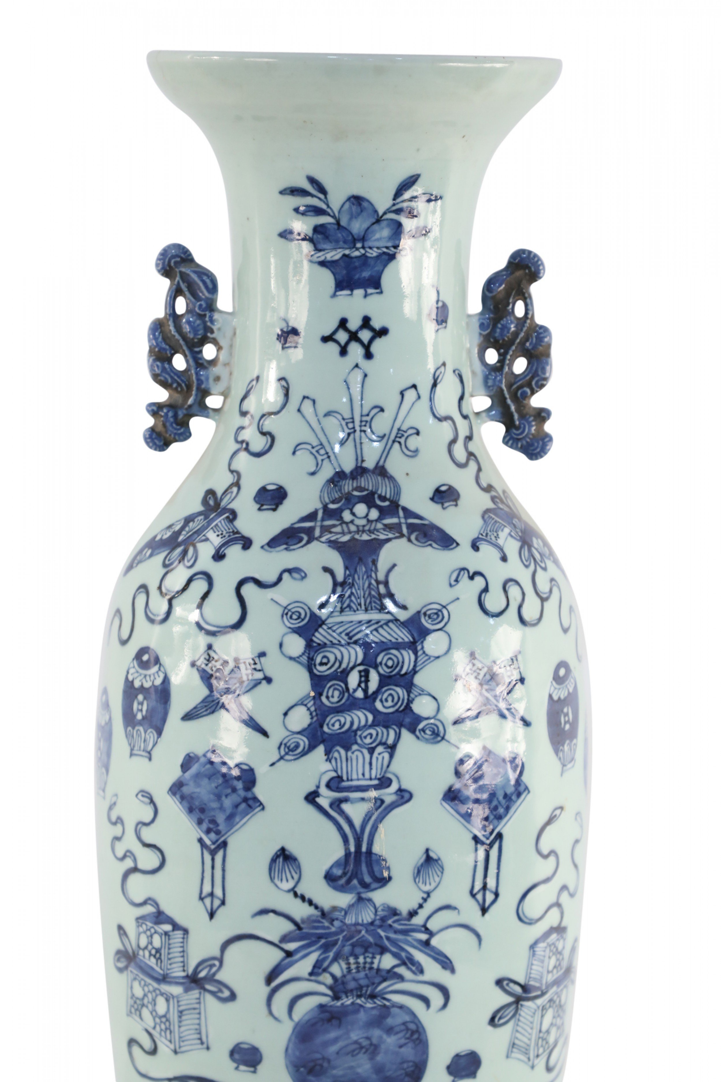 Antique Chinese (Late 19th Century) large, off-white porcelain urn painted with a blue pattern featuring Buddhist symbols and other shapes with accented blue scrolled handles.