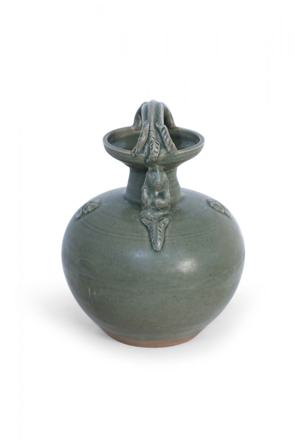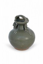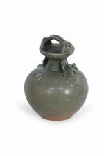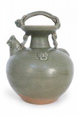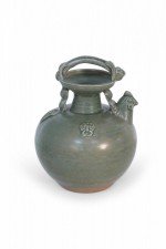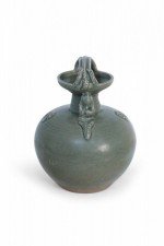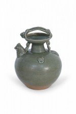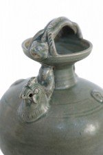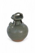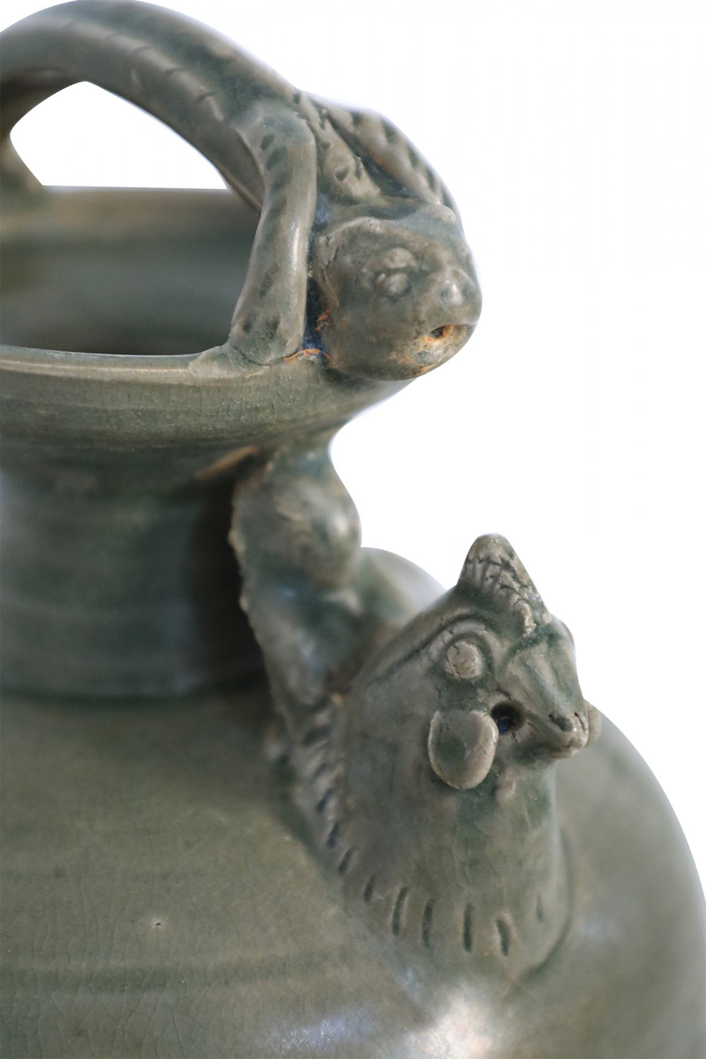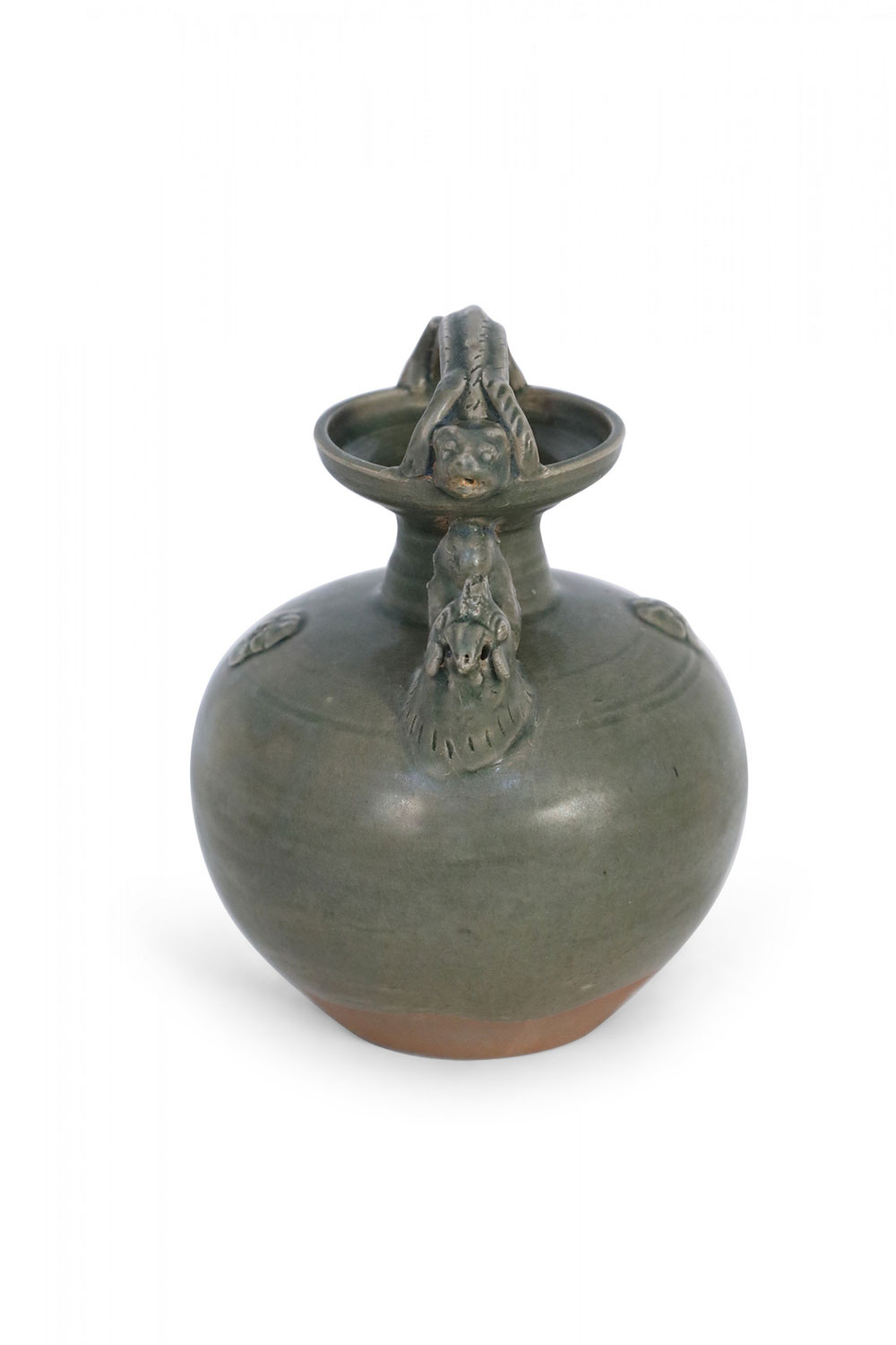 Chinese olive green ceramic jug formed with a handle stretching over the mouth, and an opening for contents within a chicken head emerging from the side..