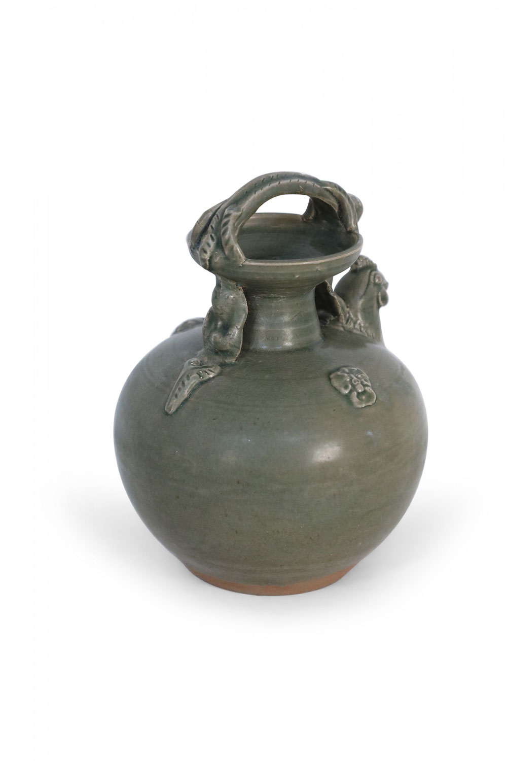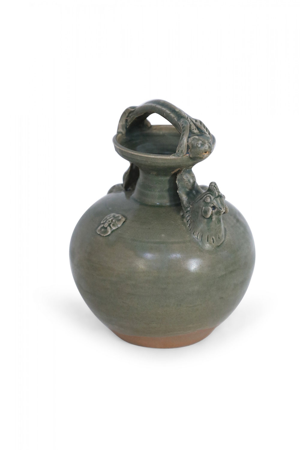 Chinese olive green ceramic jug formed with a handle stretching over the mouth, and an opening for contents within a chicken head emerging from the side.