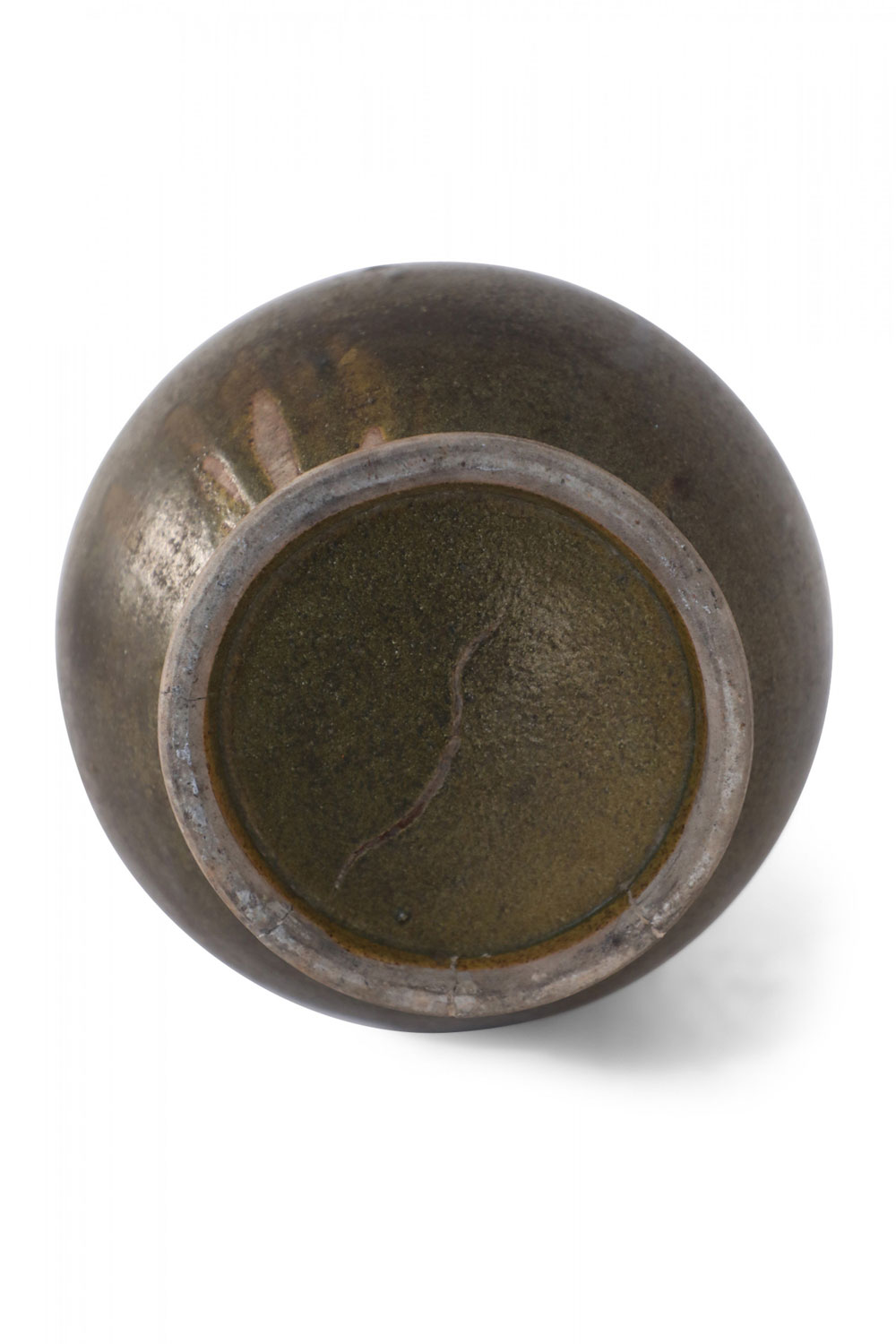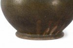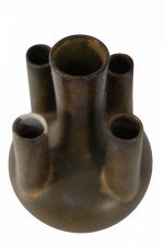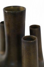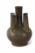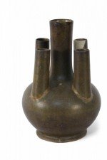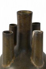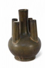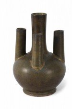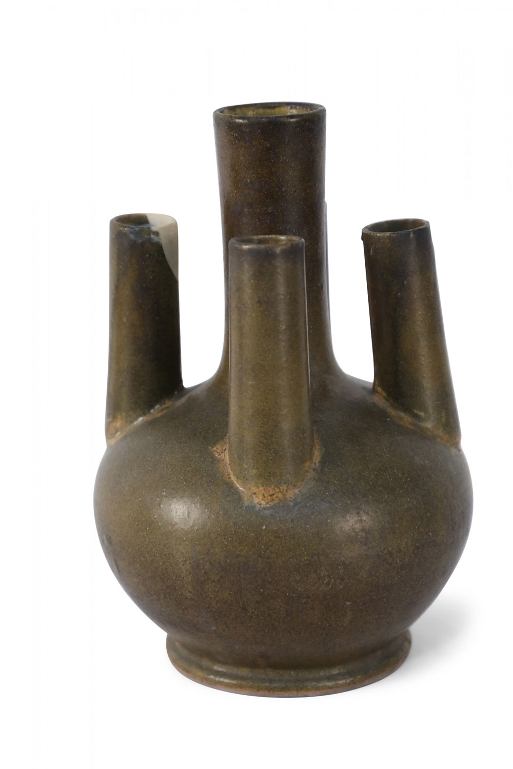 Chinese olive green and brown glaze porcelain vase with one tall tube surrounded by four shorter tubes, all extending from a bulbous shape, on a circular foot..