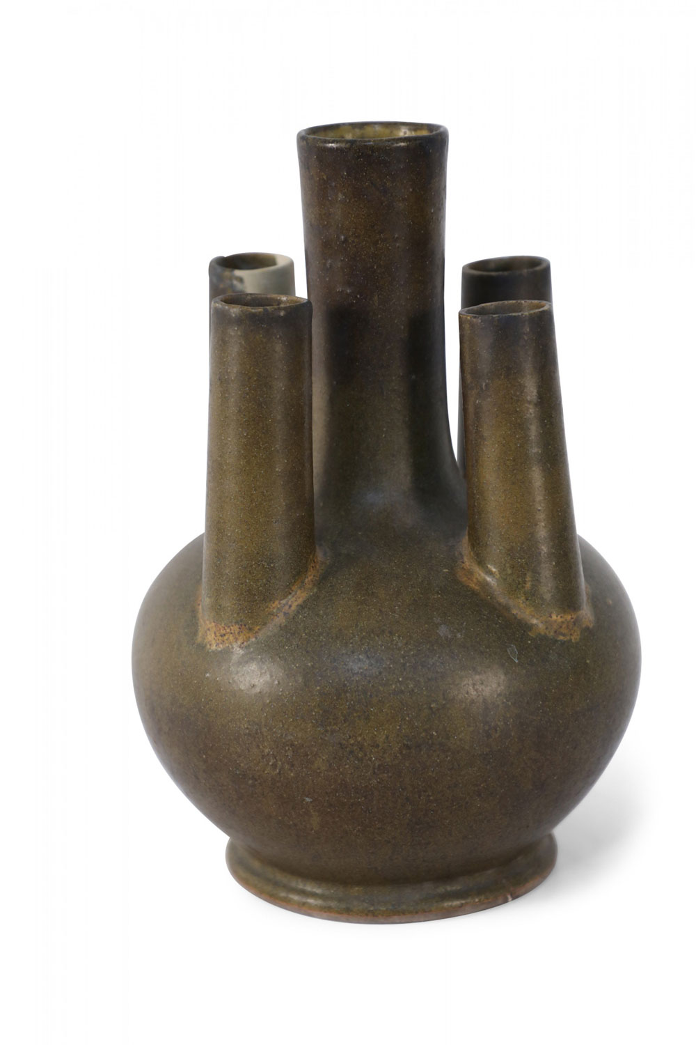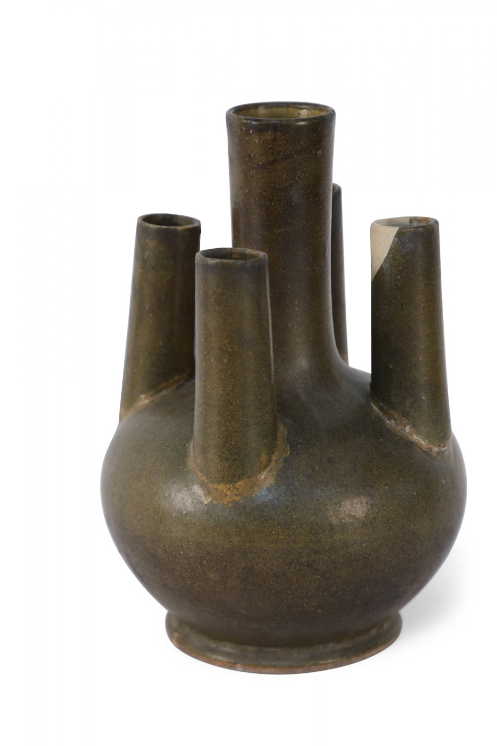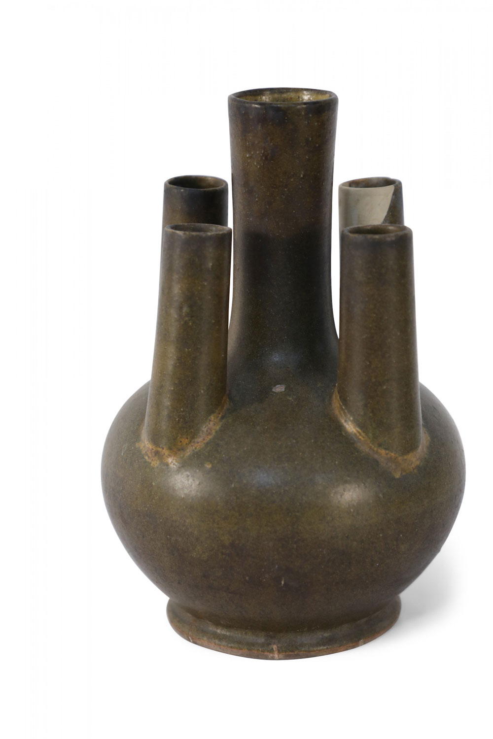 Chinese olive green and brown glaze porcelain vase with one tall tube surrounded by four shorter tubes, all extending from a bulbous shape, on a circular foot.