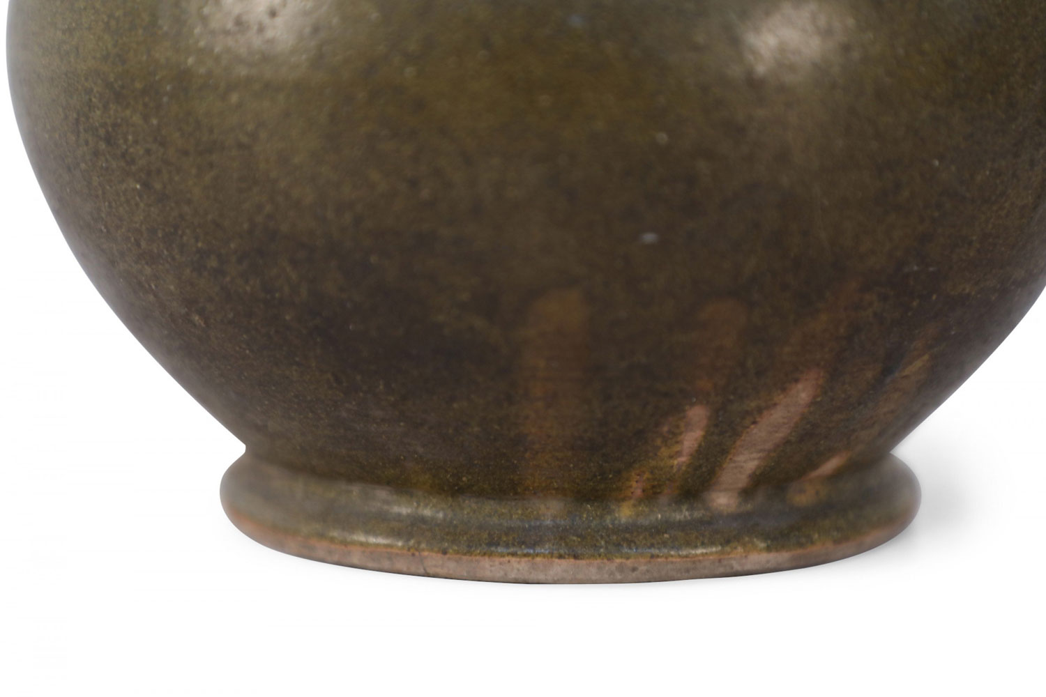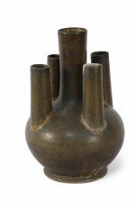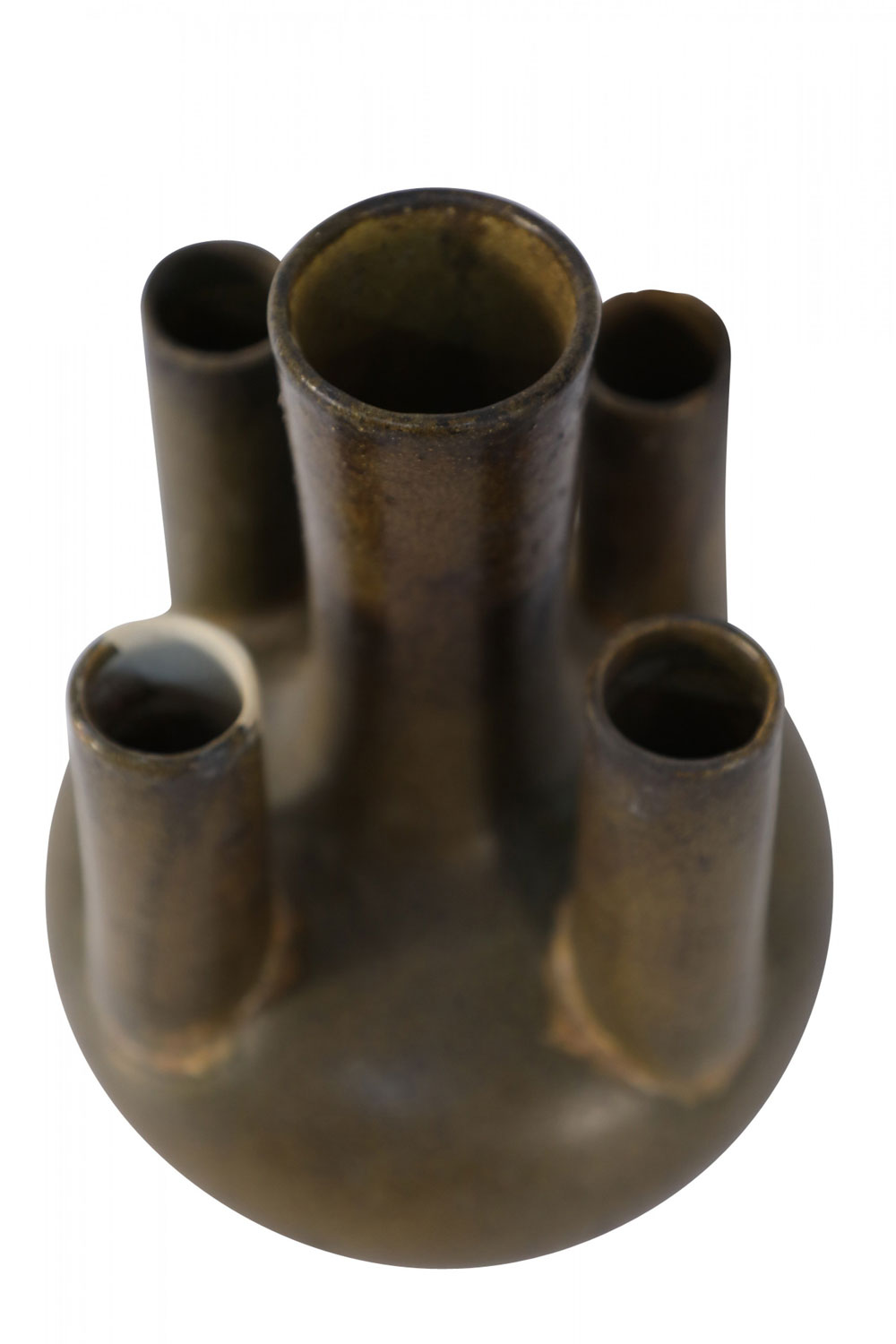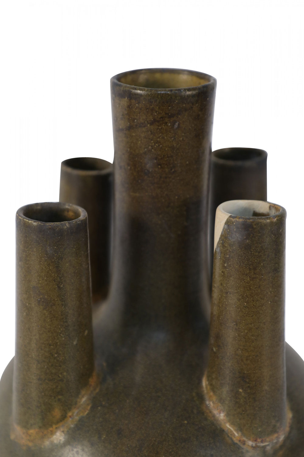 Chinese olive green and brown glaze porcelain vase with one tall tube surrounded by four shorter tubes, all extending from a bulbous shape, on a circular foot.