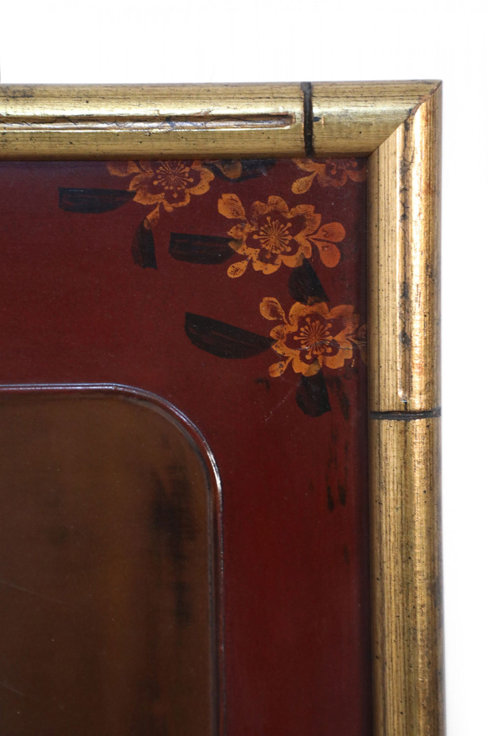 Chinese panel art featuring a raised bird perched on a flowering tree branch detailed in pieces of mother of pearl against a burgundy and brown floral bordered background in a carved faux bamboo giltwood frame with decorative iron hanging hardware at the top..