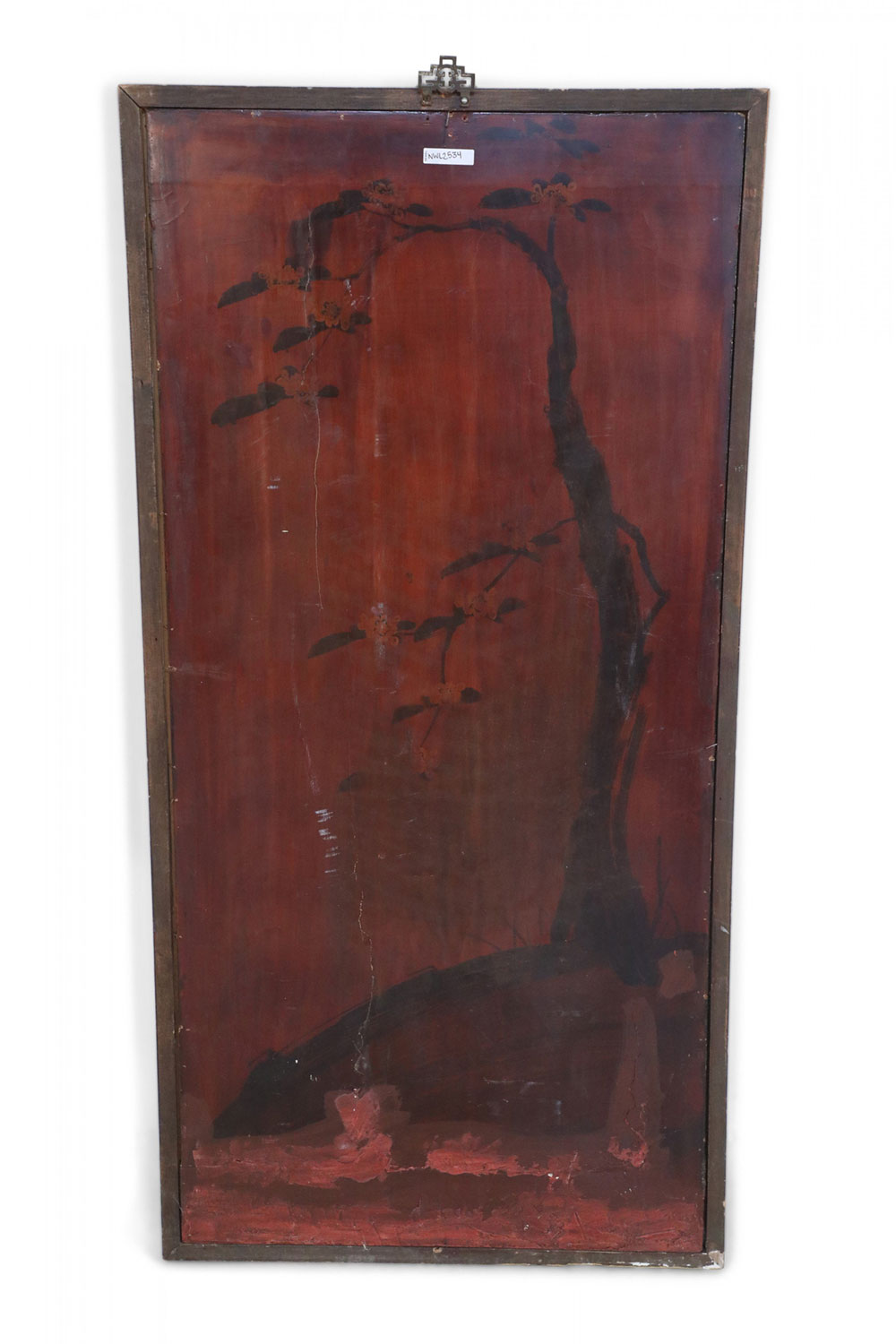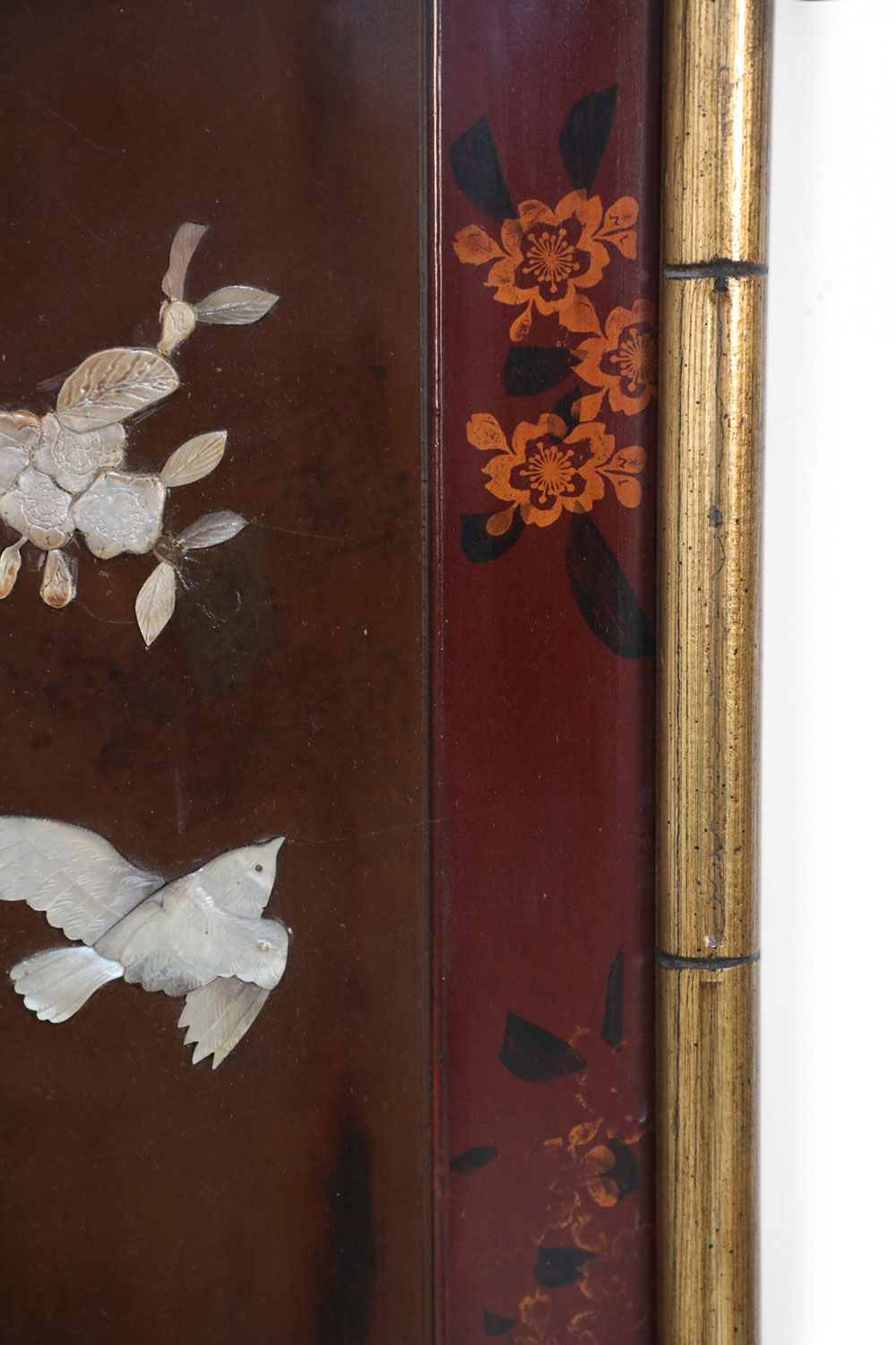 Chinese panel art featuring a raised bird perched on a flowering tree branch detailed in pieces of mother of pearl against a burgundy and brown floral bordered background in a carved faux bamboo giltwood frame with decorative iron hanging hardware at the top.
