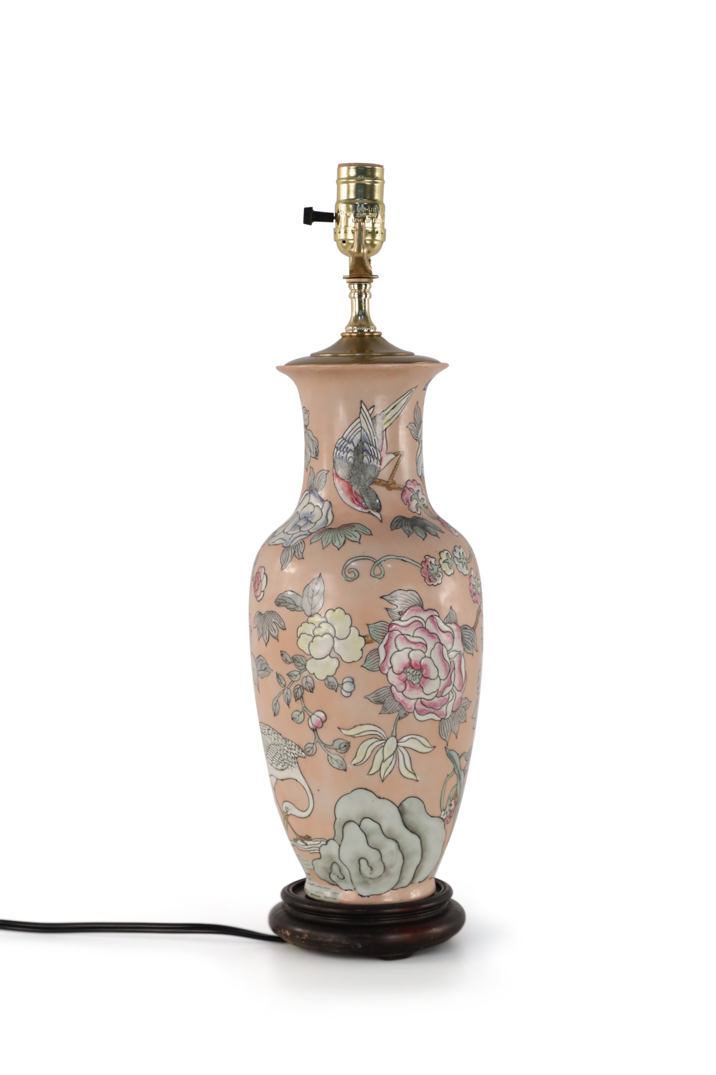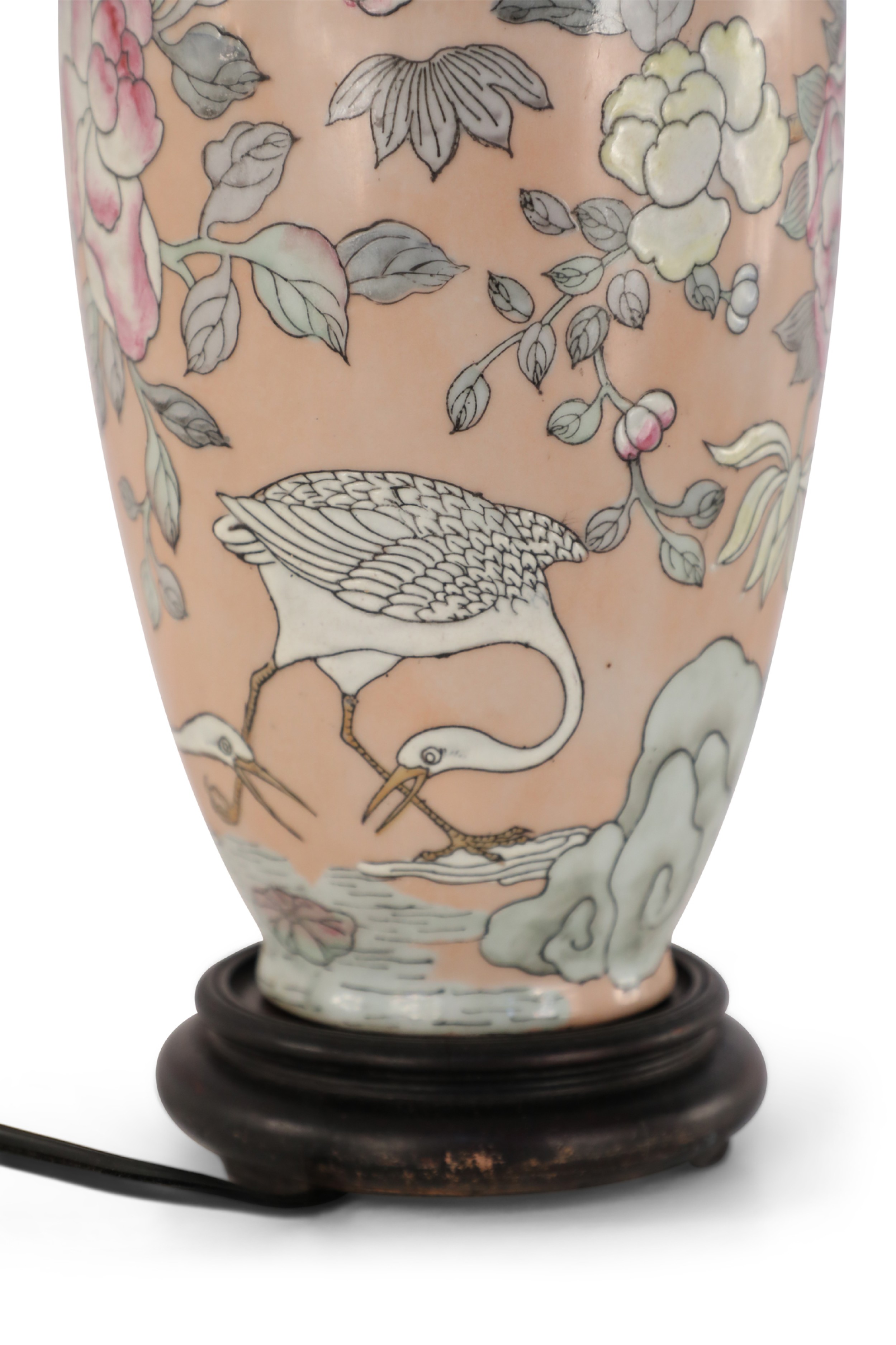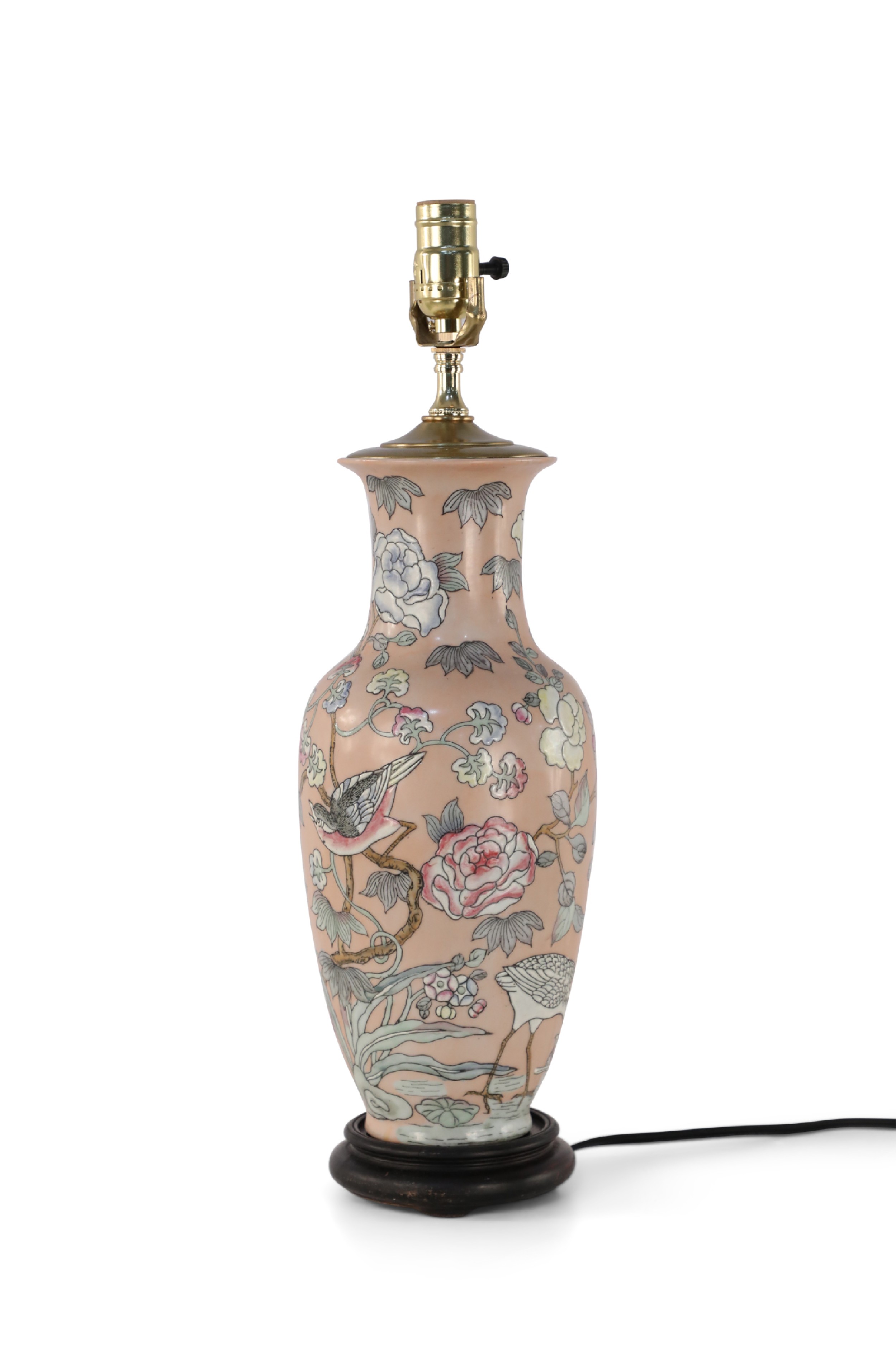 Chinese pink ceramic table lamp made from a baluster-shaped vase decorated with ducks in natural surroundings emphasized with linework and orange dragonflies, on a wooden base with brass hardware..