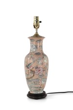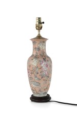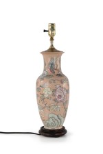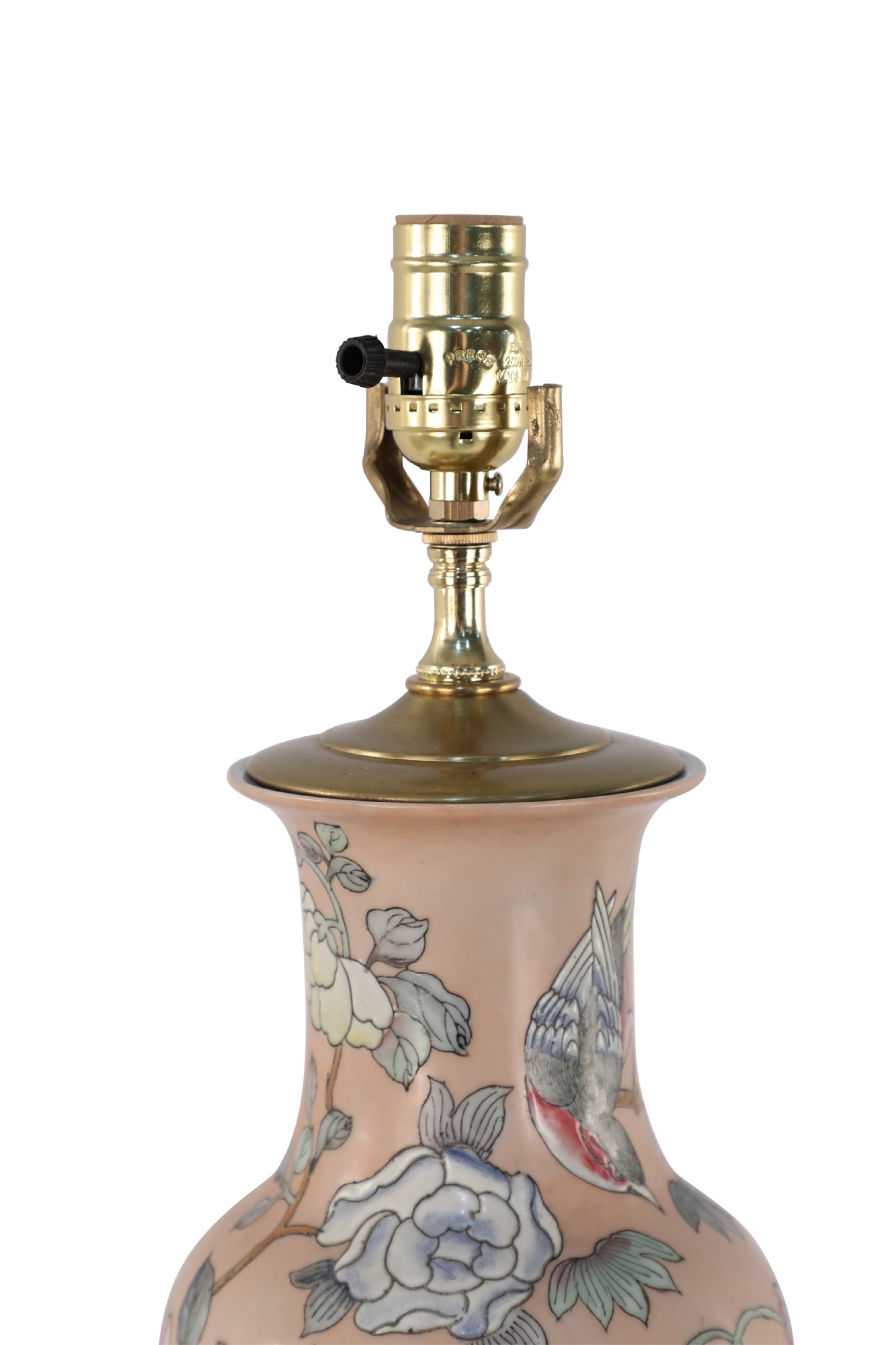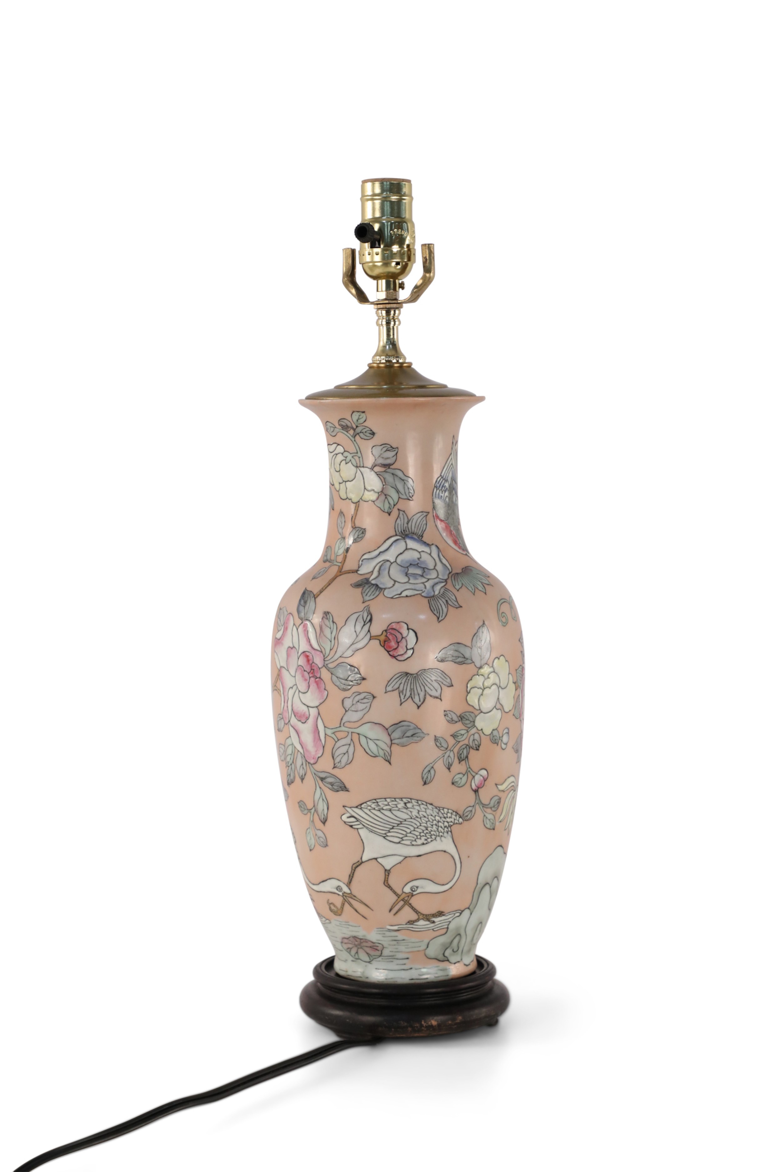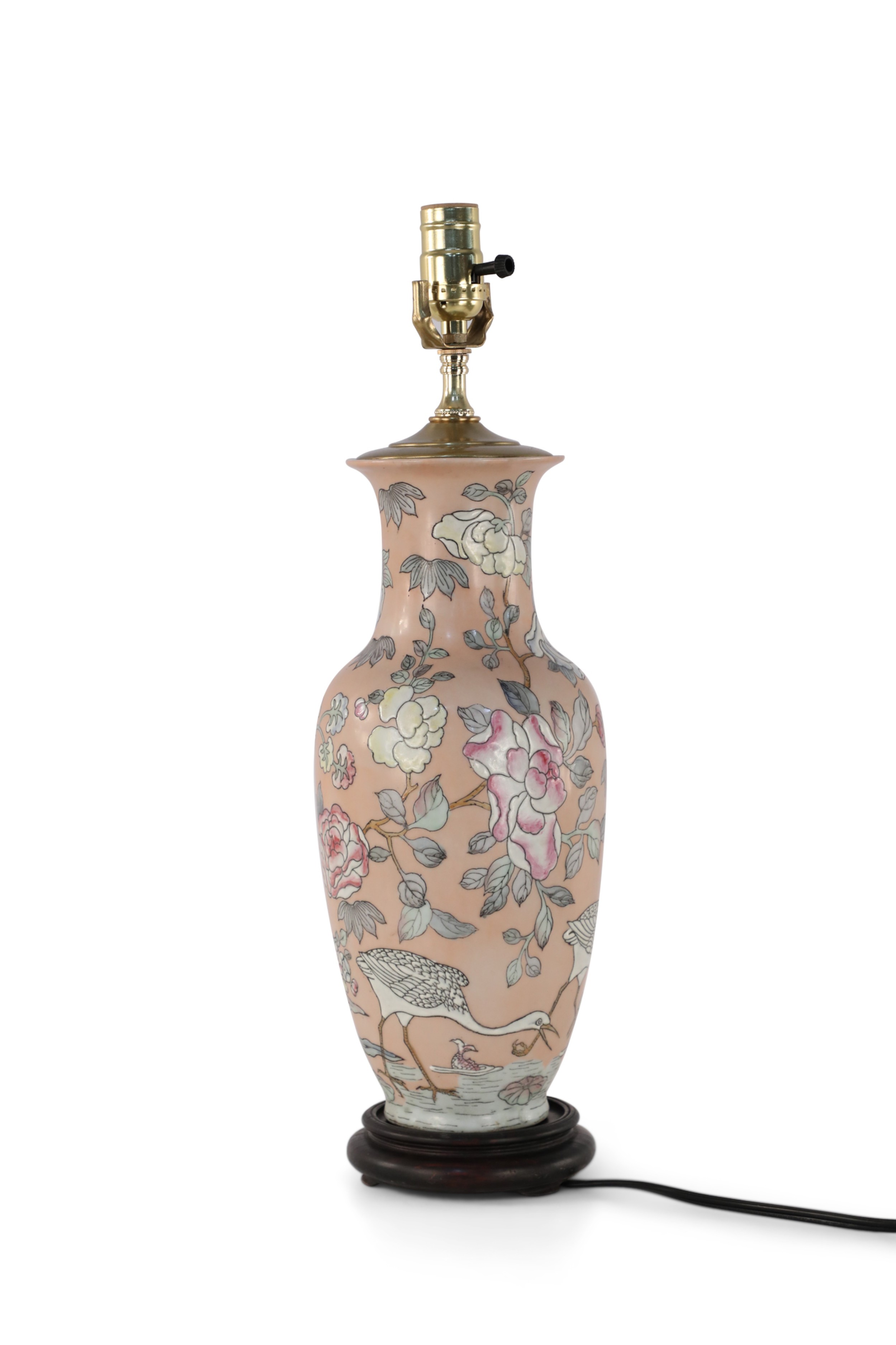 Chinese pink ceramic table lamp made from a baluster-shaped vase decorated with ducks in natural surroundings emphasized with linework and orange dragonflies, on a wooden base with brass hardware.