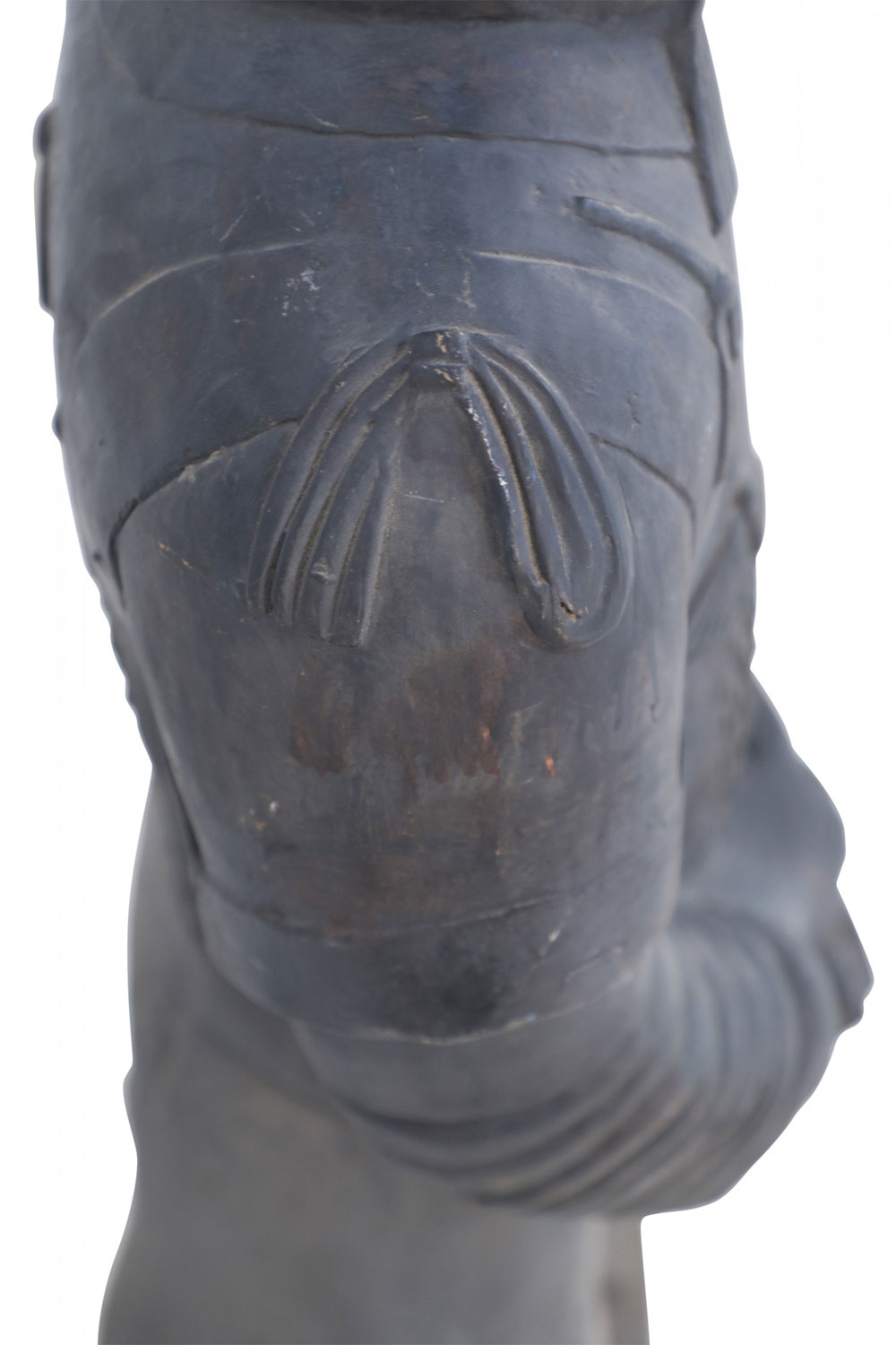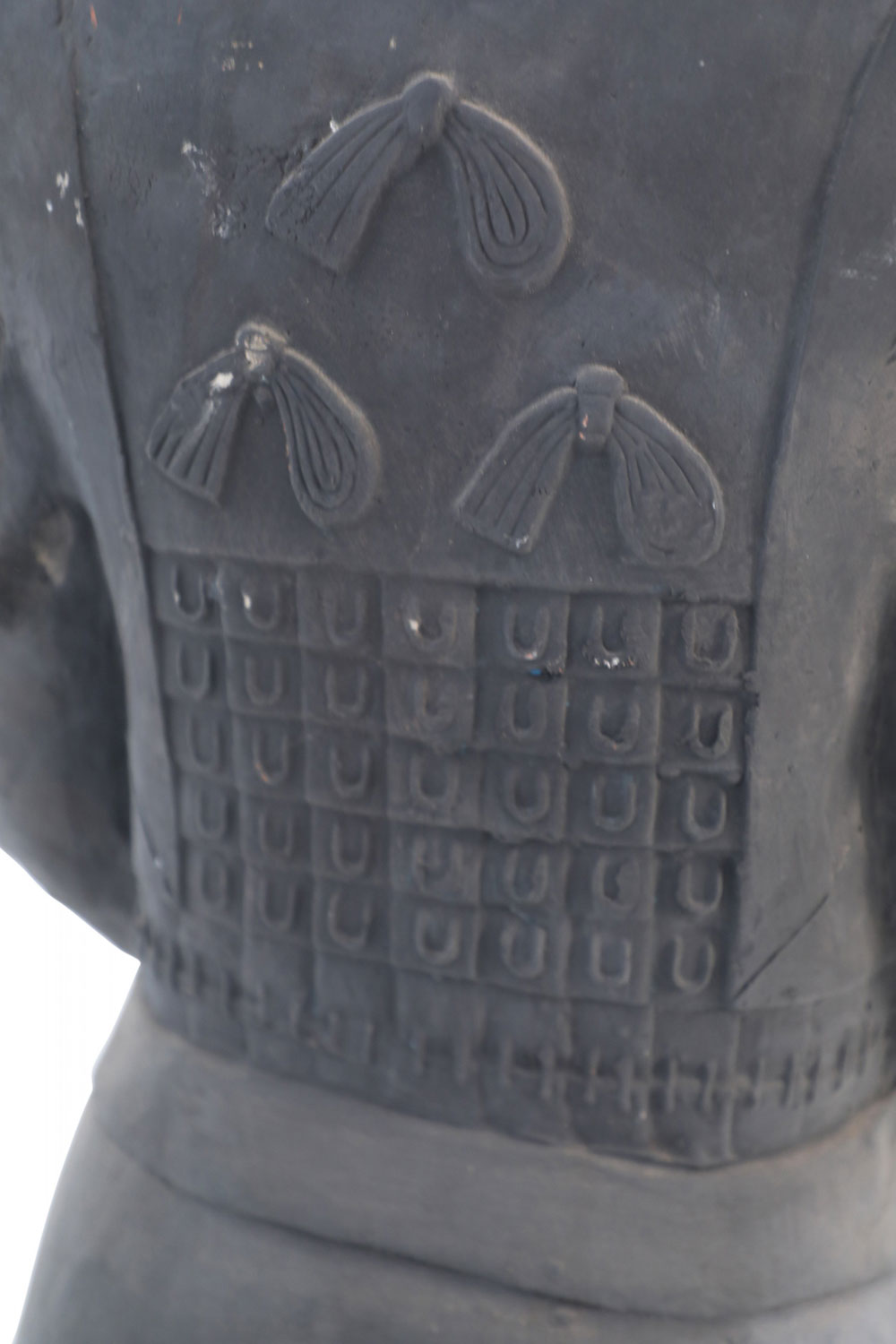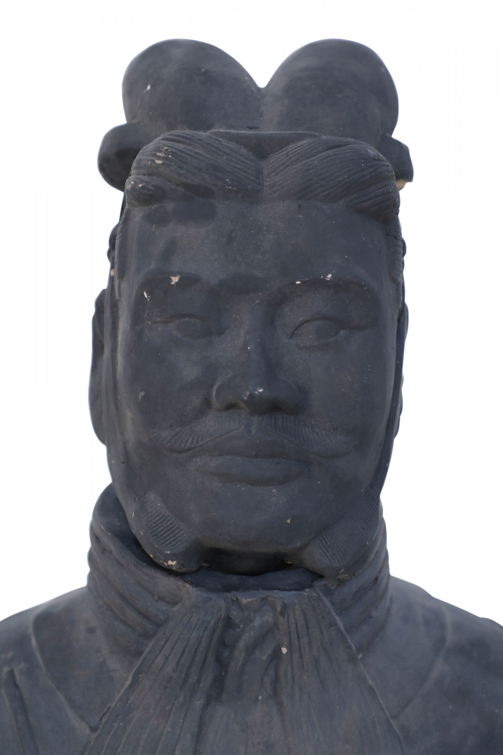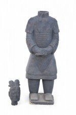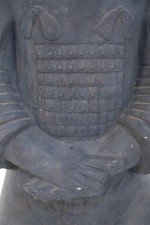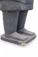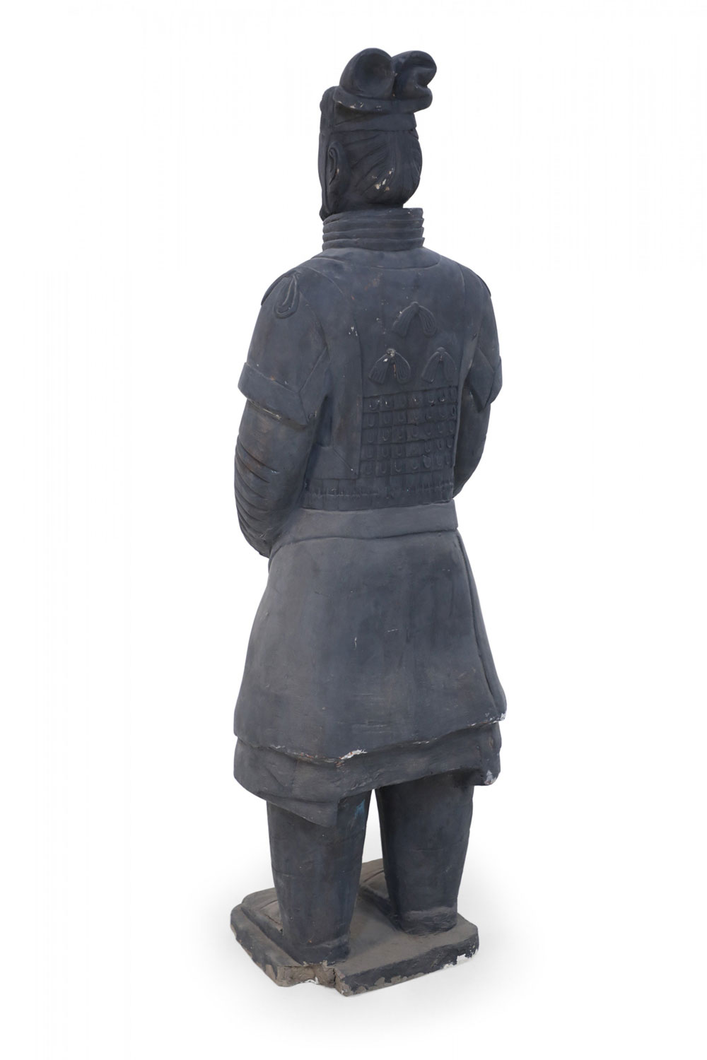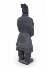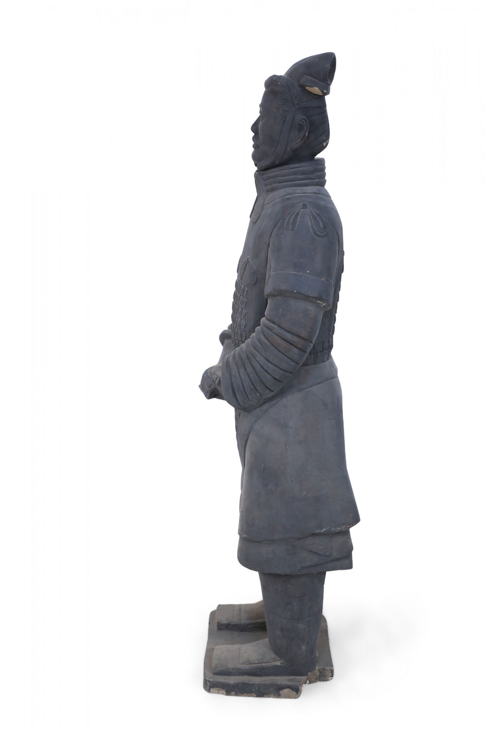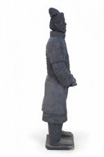 Chinese Qin Dynasty-style (20th Century) life-size terracotta soldier statue standing with hands clasped on a rectangular base. (Head is removable)(Companion piece: NWL2501)