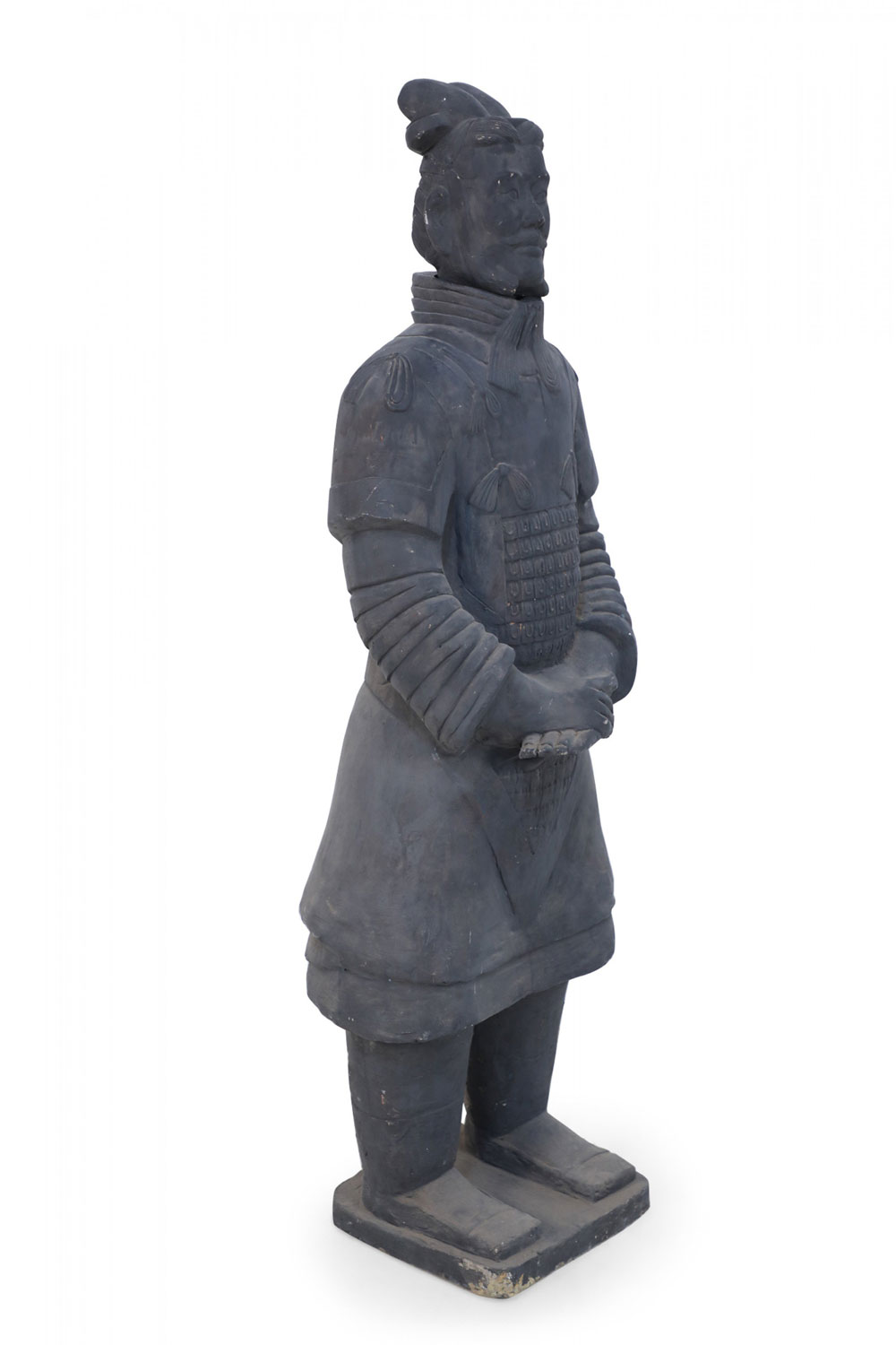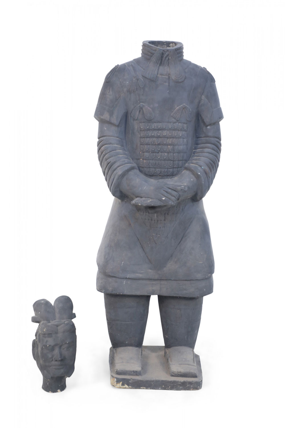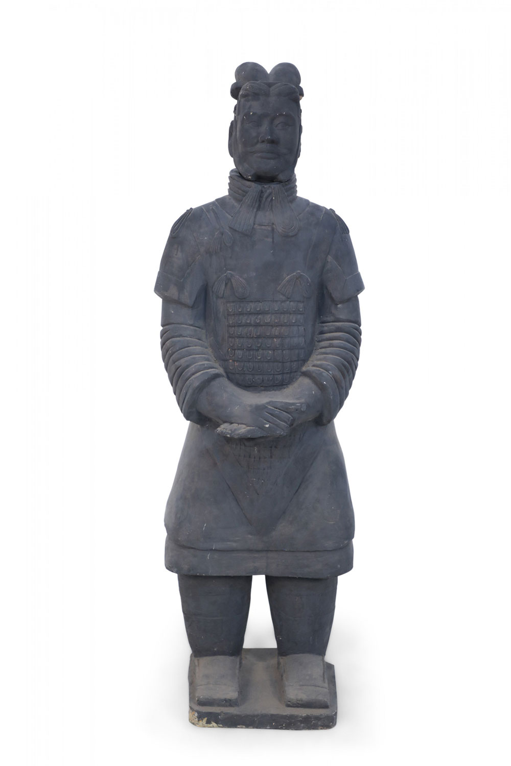Chinese Qin Dynasty-style (20th Century) life-size terracotta soldier statue standing with hands clasped on a rectangular base. (Head is removable)(Companion piece: NWL2501).